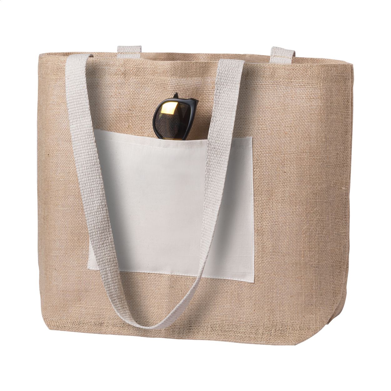 Borsa da spiaggia in juta con tasca frontale e manici in colore coordinato.