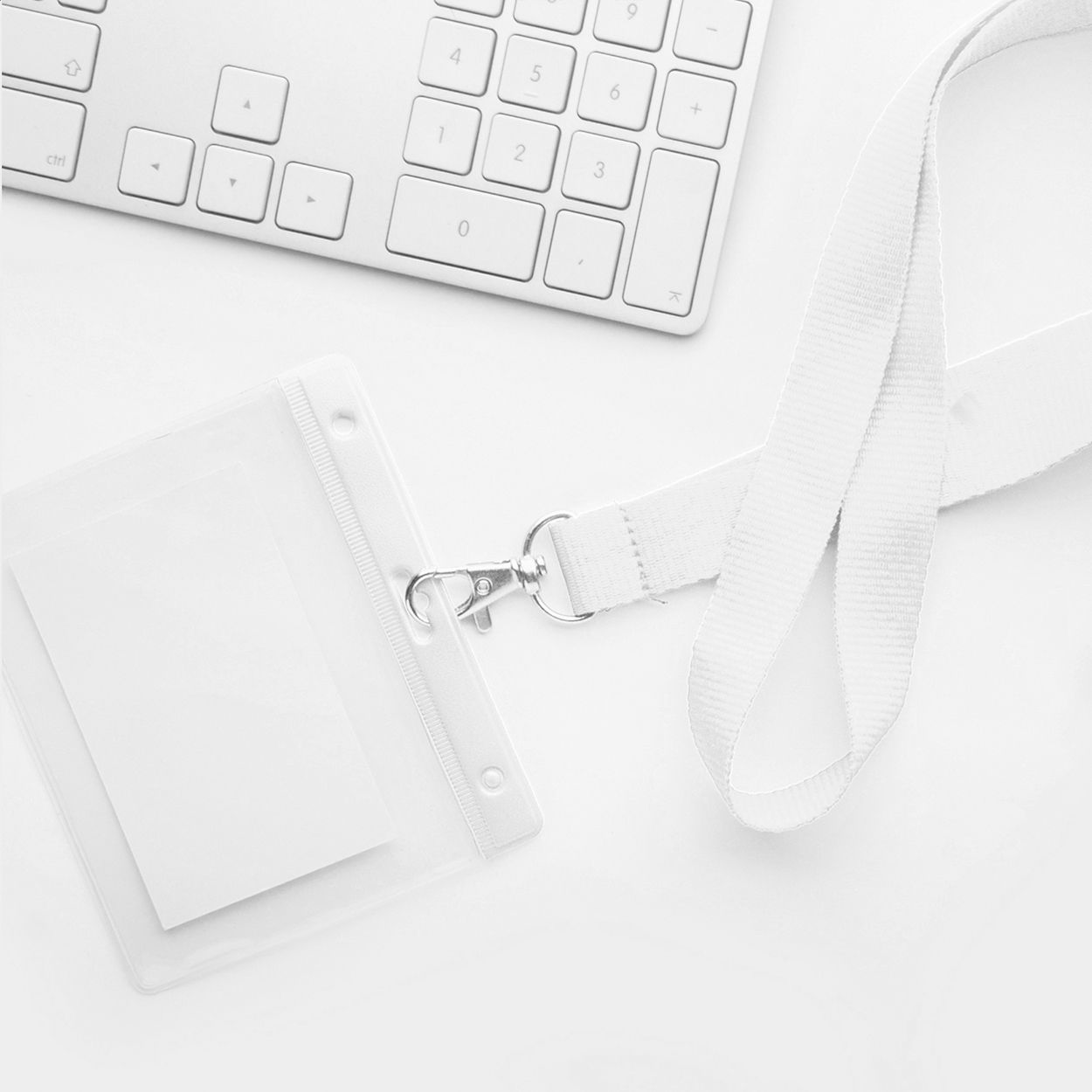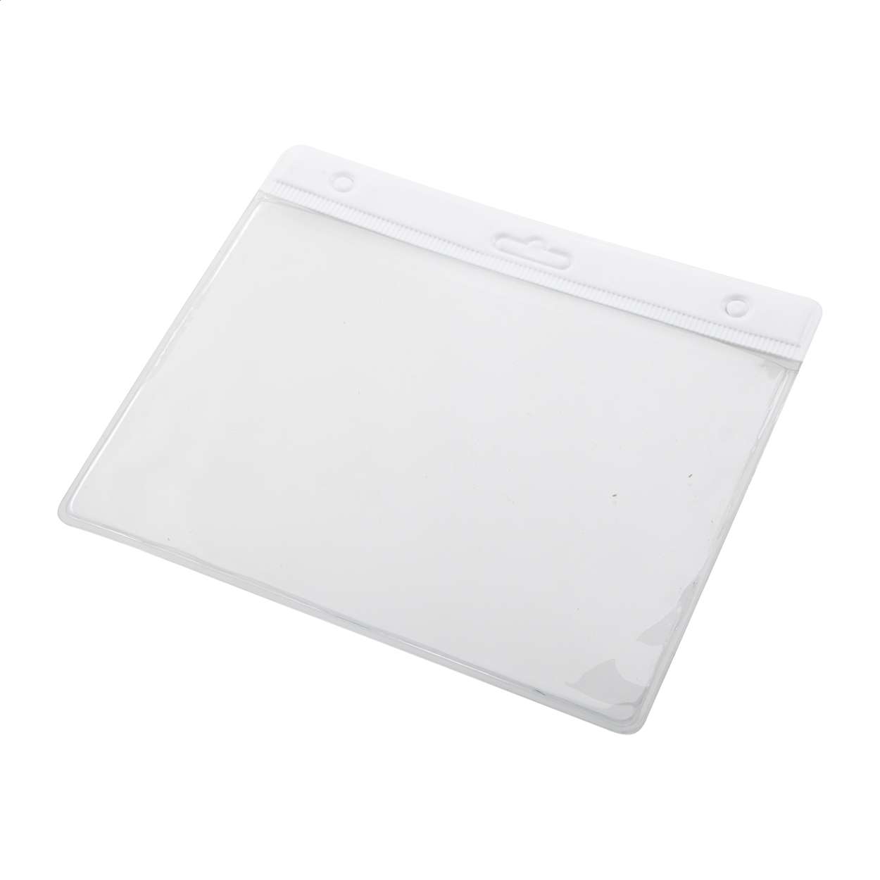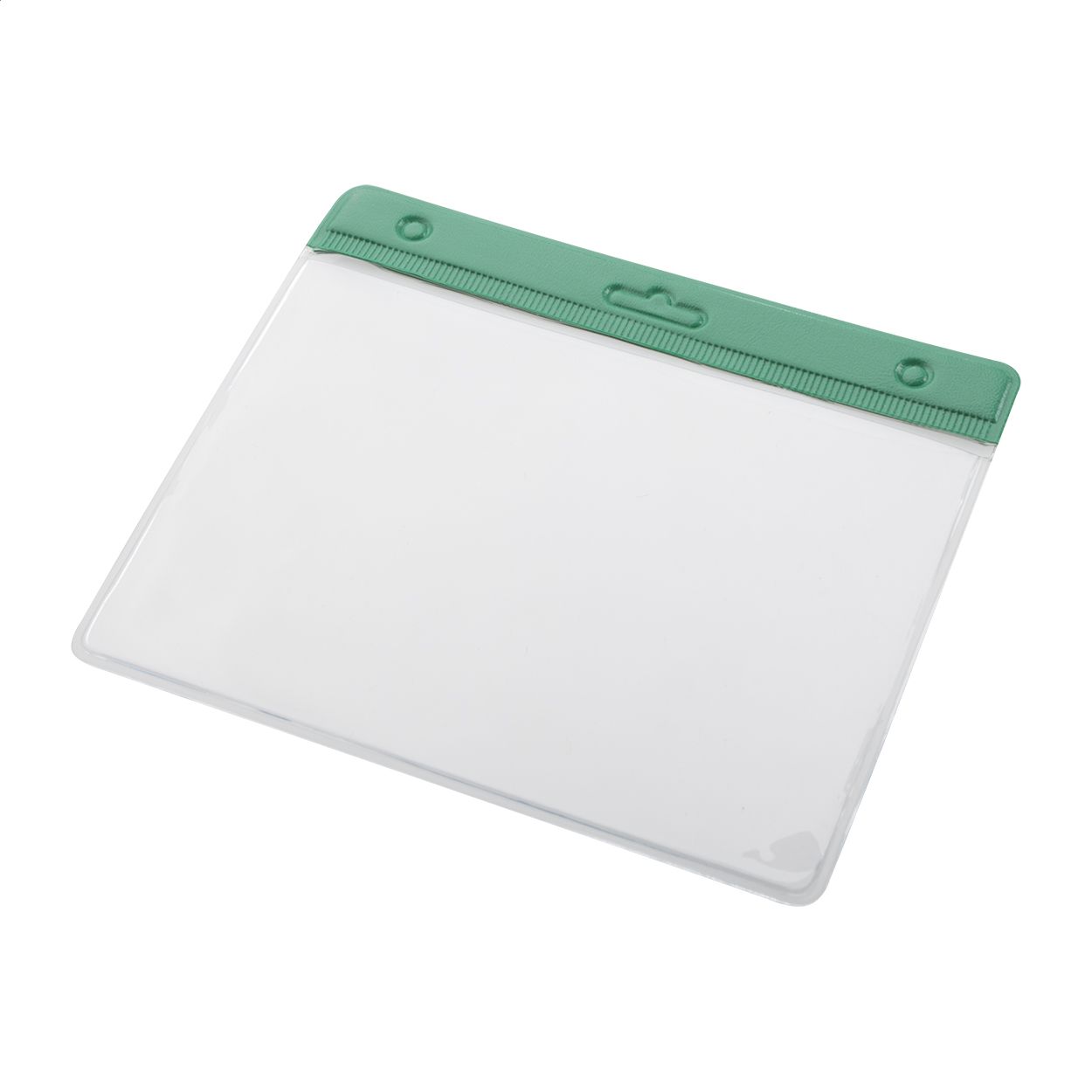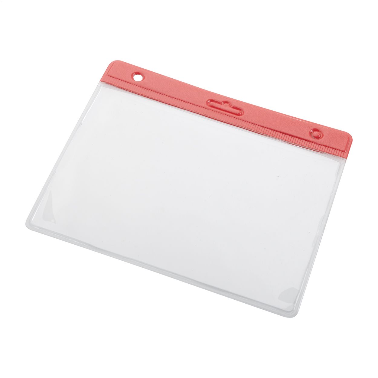 Porta badge in PVC trasparente con bordo colorato, indossabile a tracolla.