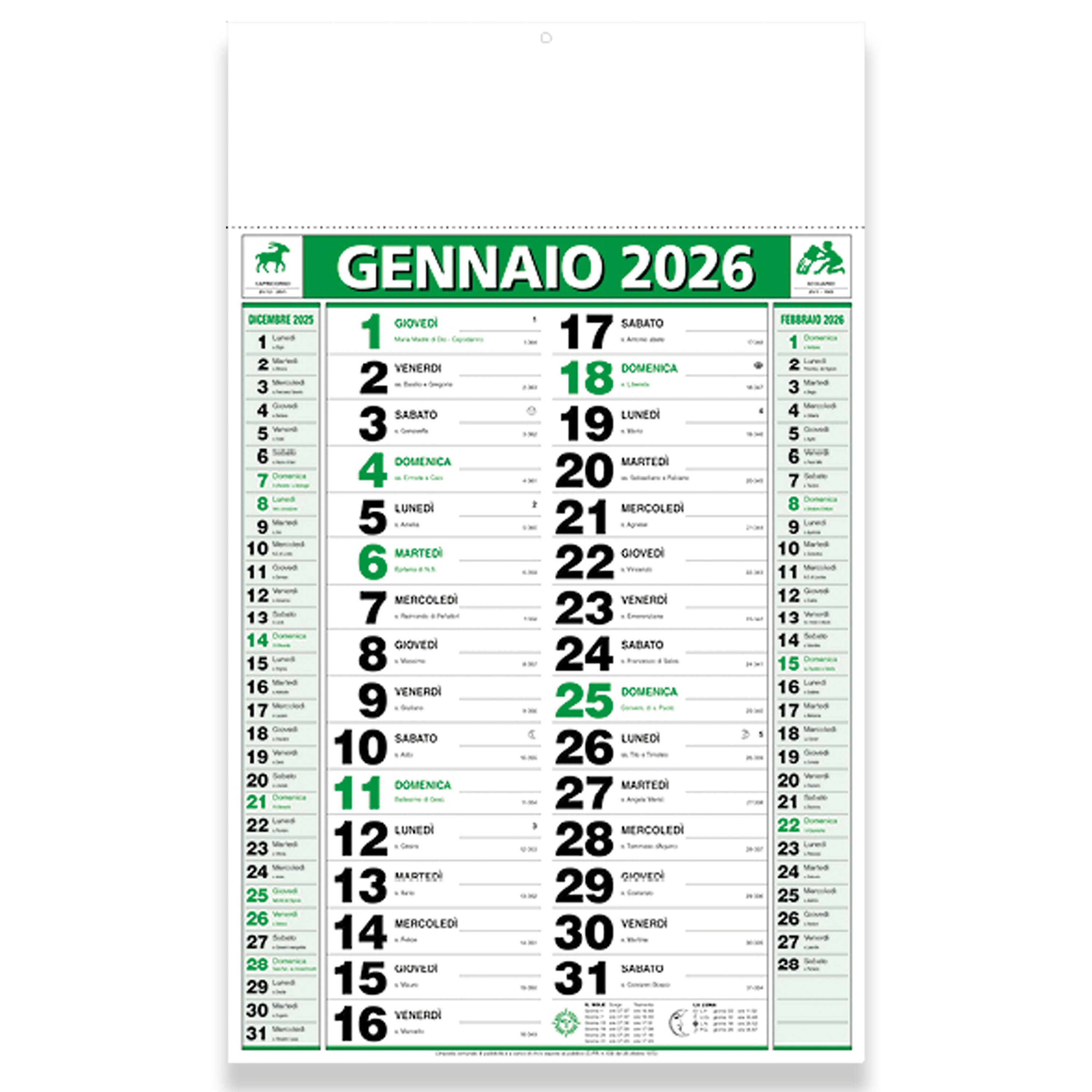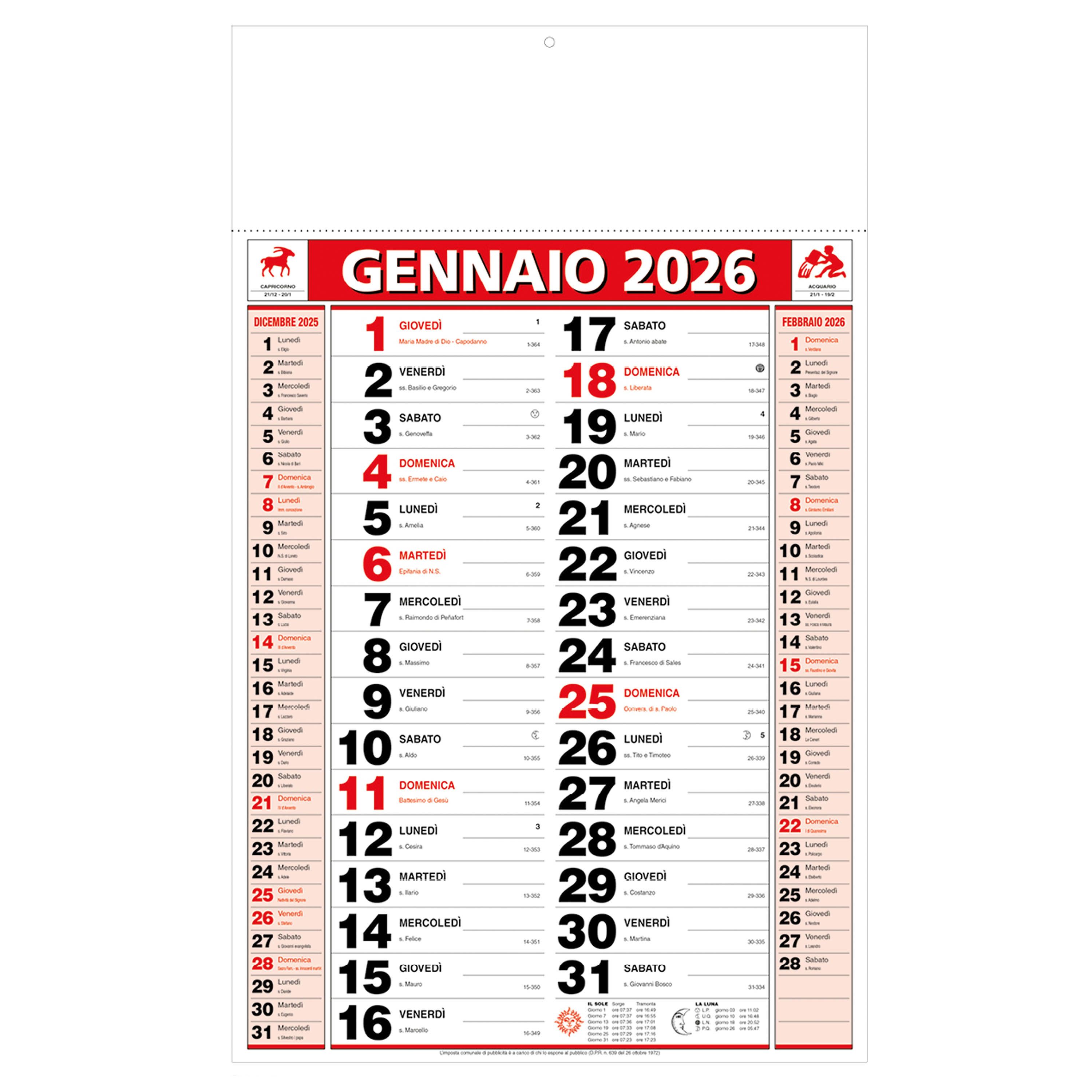 Calendario 2026 da muro mensile bicolore, 12 fogli, su carta patinata, termosaldato