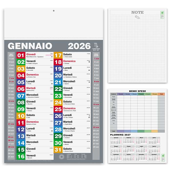 Olandese mensile 12 fogli; carta patinata 70 gr.; testata termosaldata; festività internazionali; pagina note stampata sul retro; memo spese in ultima pagina;
