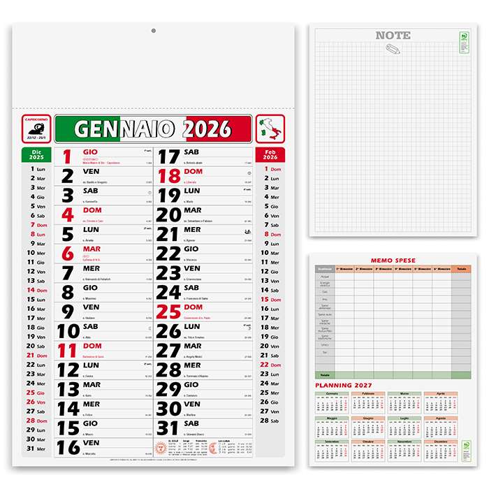Olandese mensile 12 fogli; carta patinata 70 gr.; testata termosaldata; festività internazionali; pagina note stampata sul retro; memo spese in ultima pagina;
