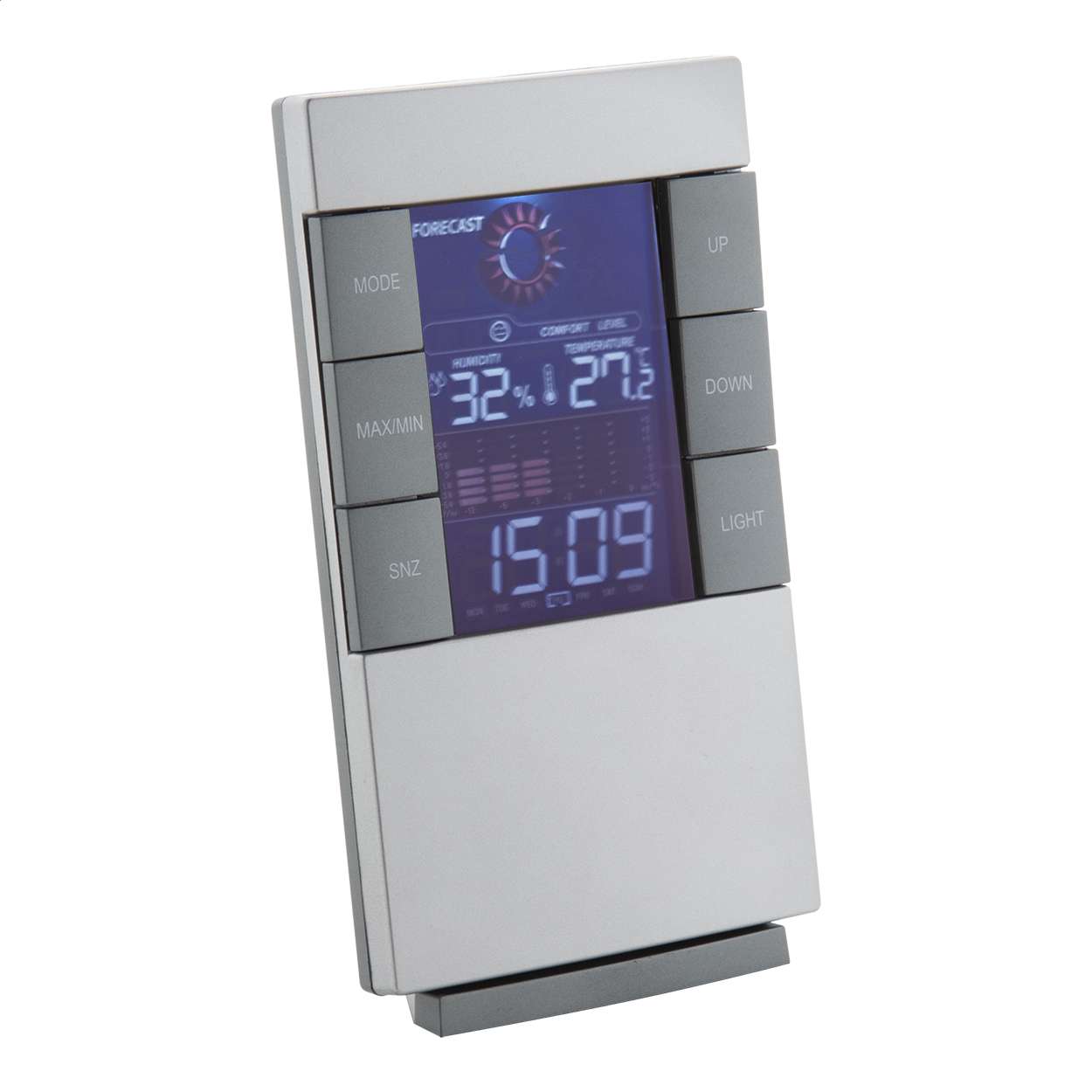 Orologio digitale e stazione meteo con display a colori Funzioni: Sveglia, termometro, igrometro e memoria andamento temperature ultime 12 ore. Funziona con 2 batterie AAA (non fornite).