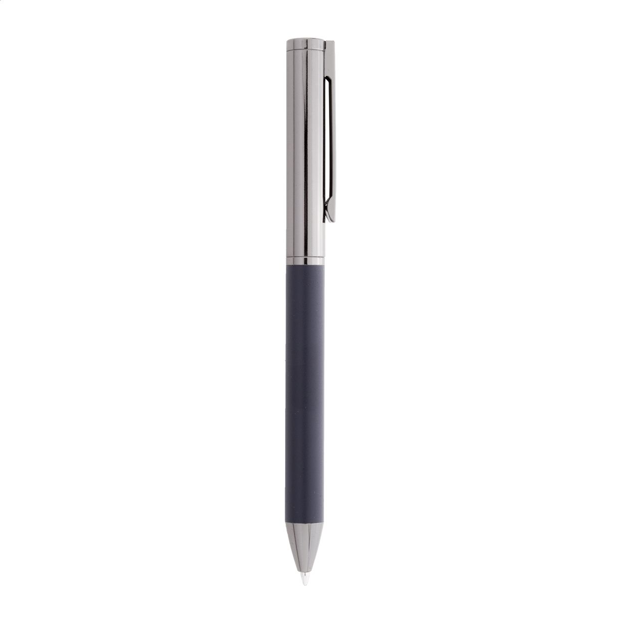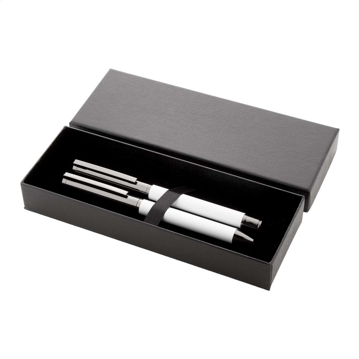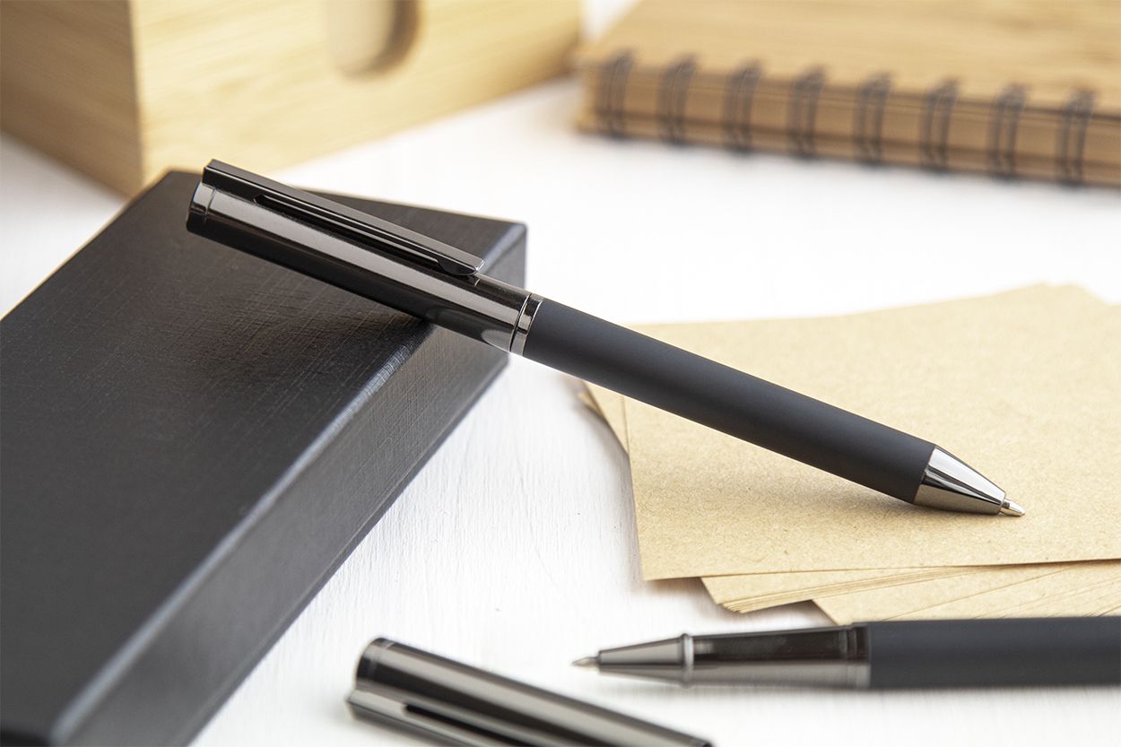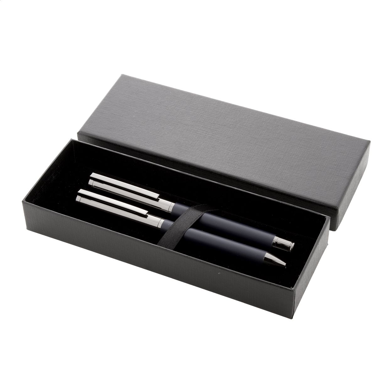 Elegante set di penne in metallo composto da una penna a sfera ed una penna roller in confezione regalo di cartoncino nero. Con refill blu.