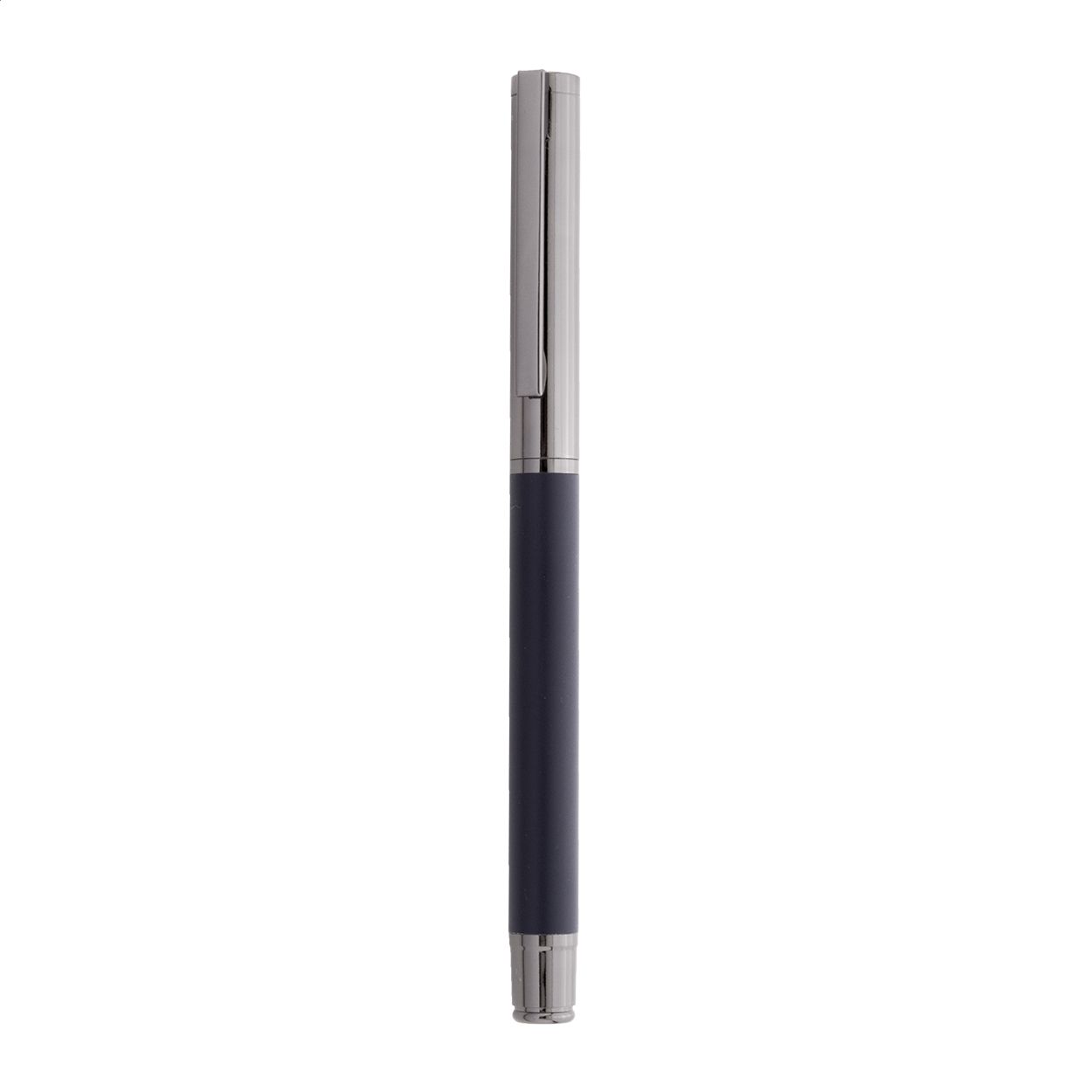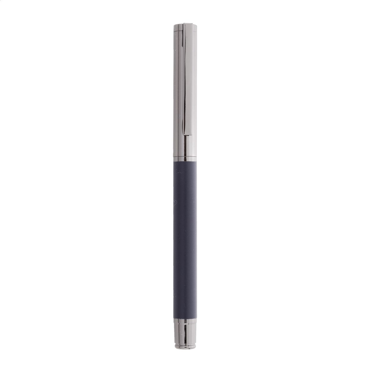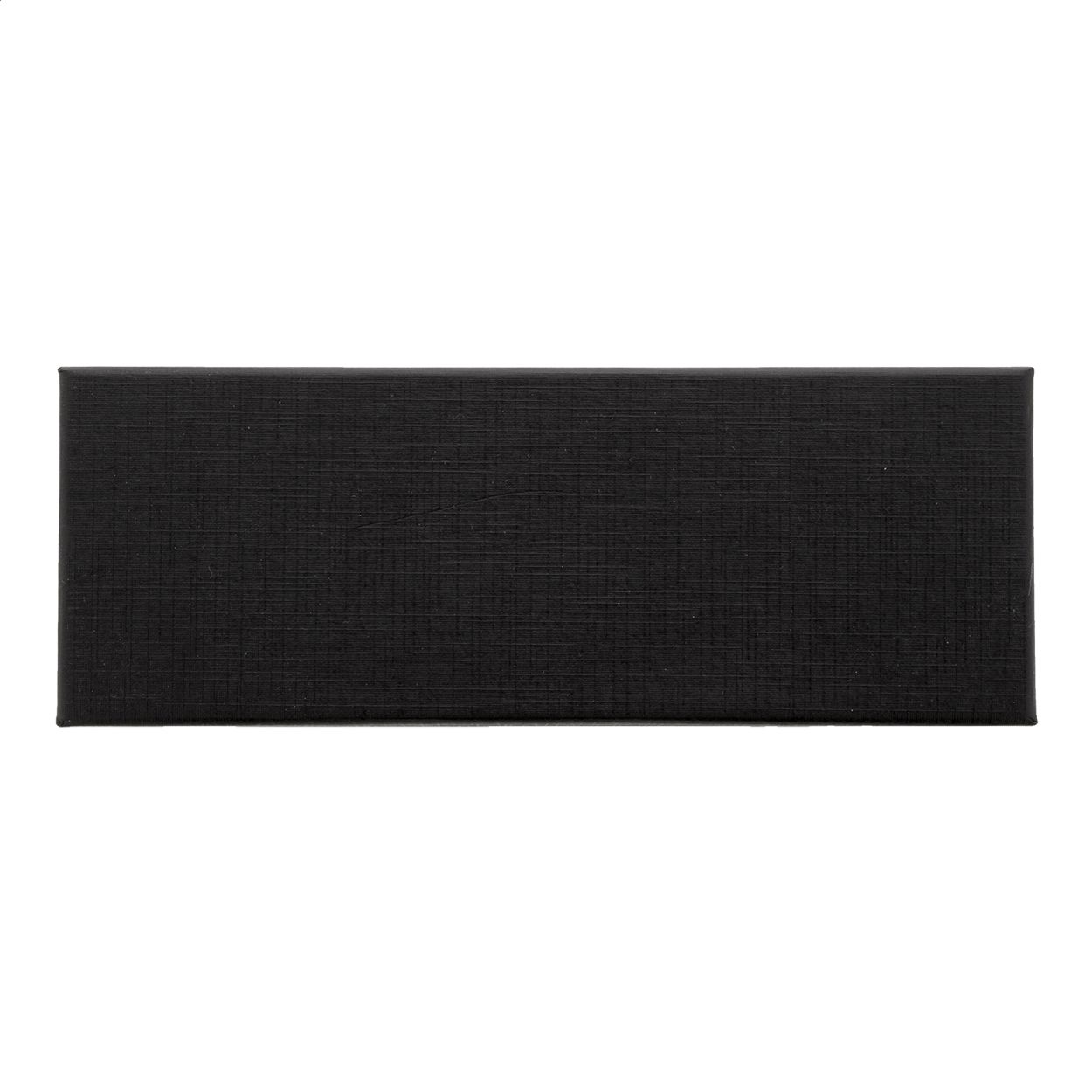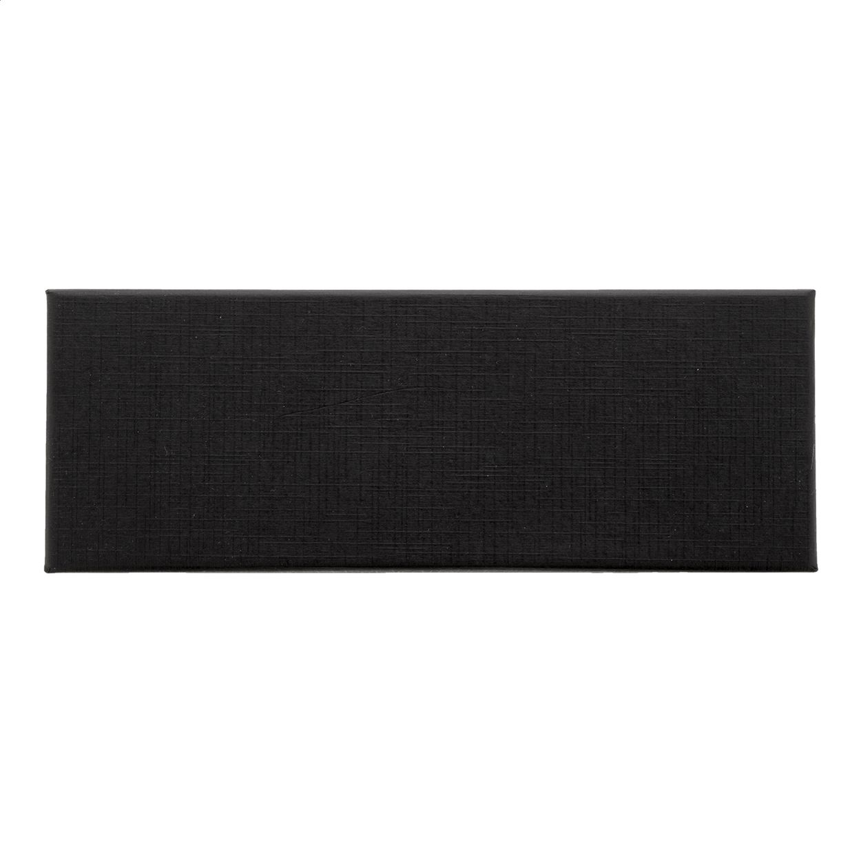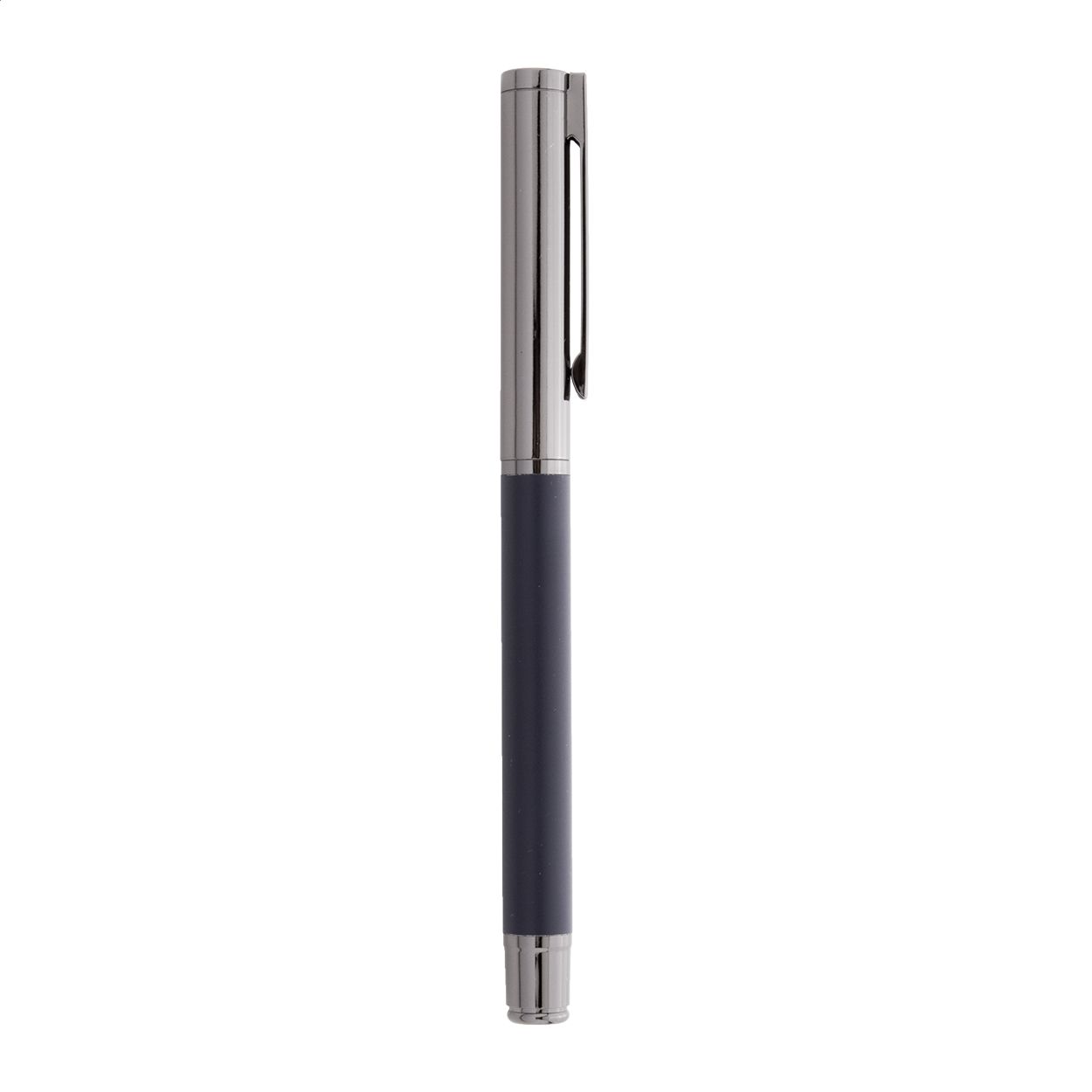 Elegante set di penne in metallo composto da una penna a sfera ed una penna roller in confezione regalo di cartoncino nero. Con refill blu.