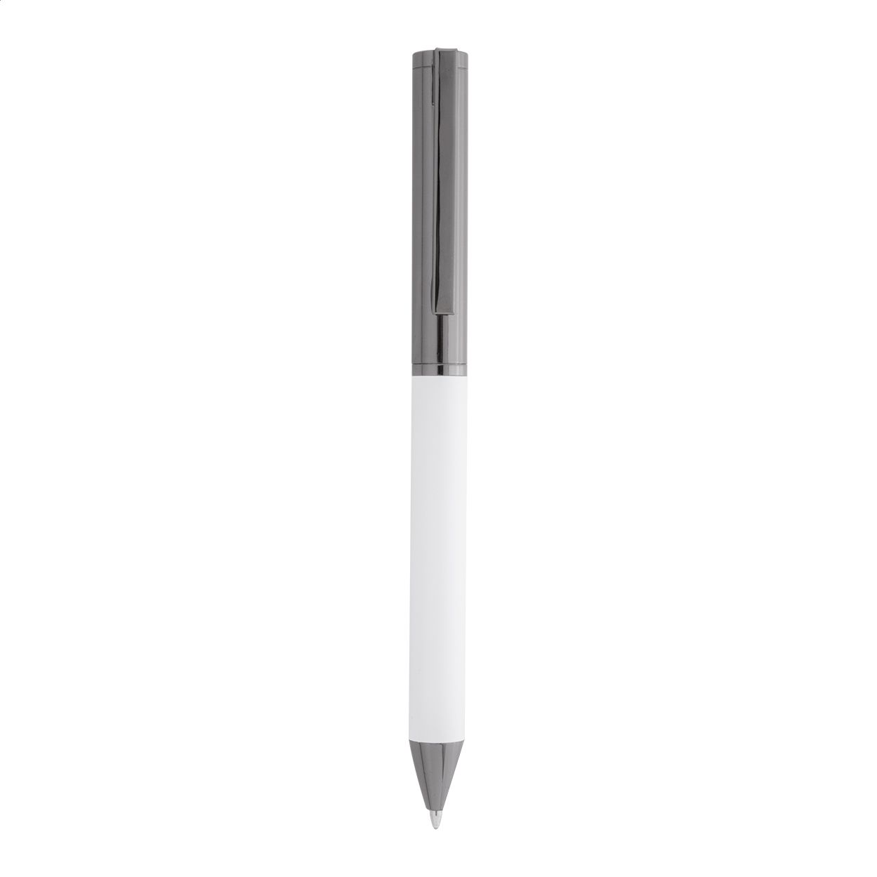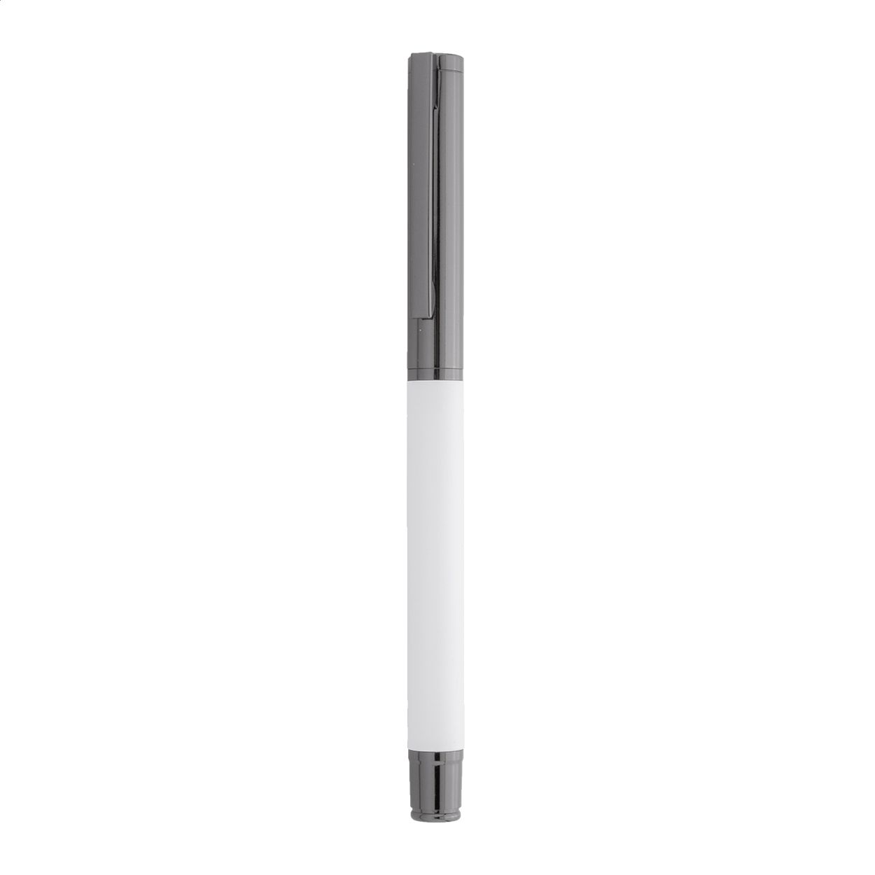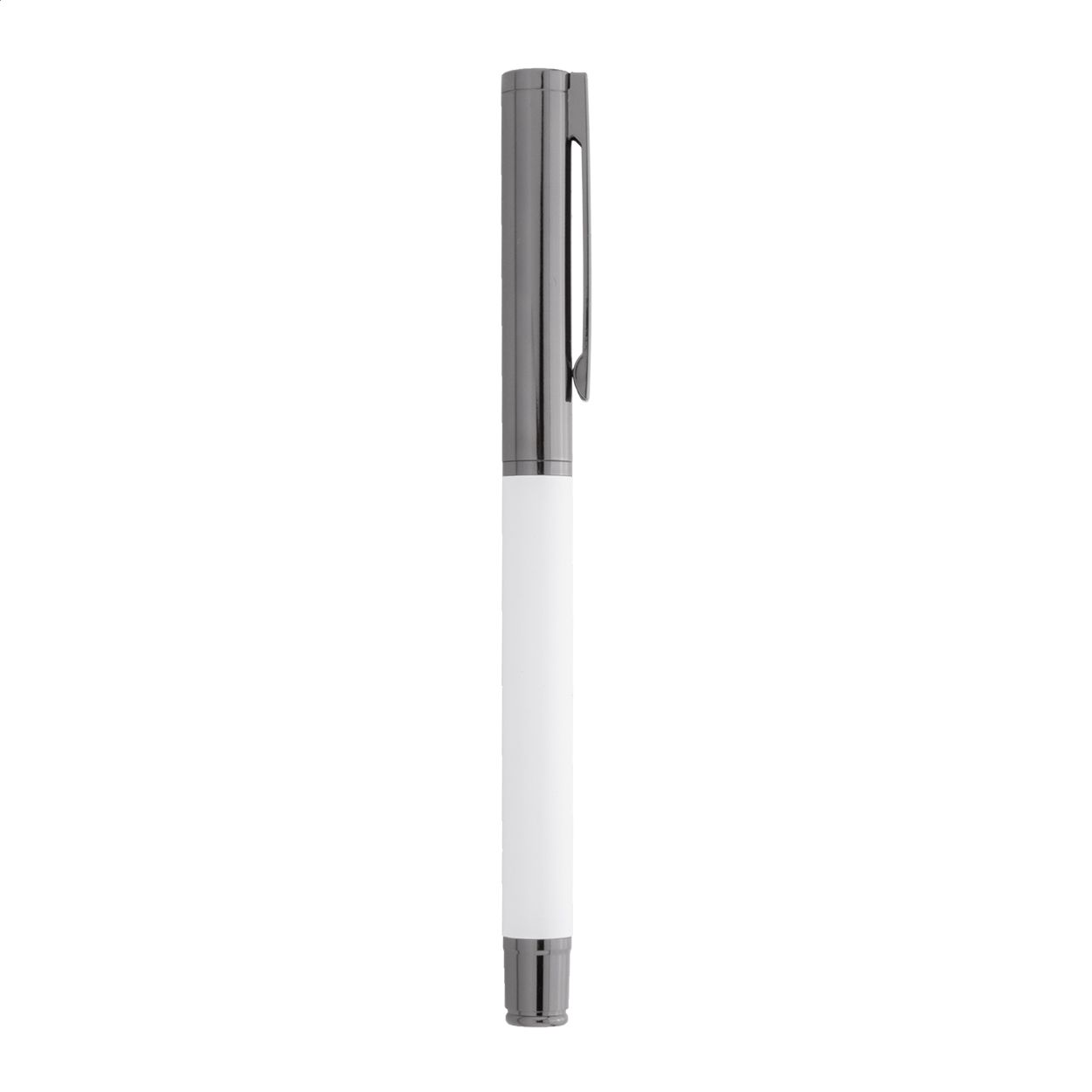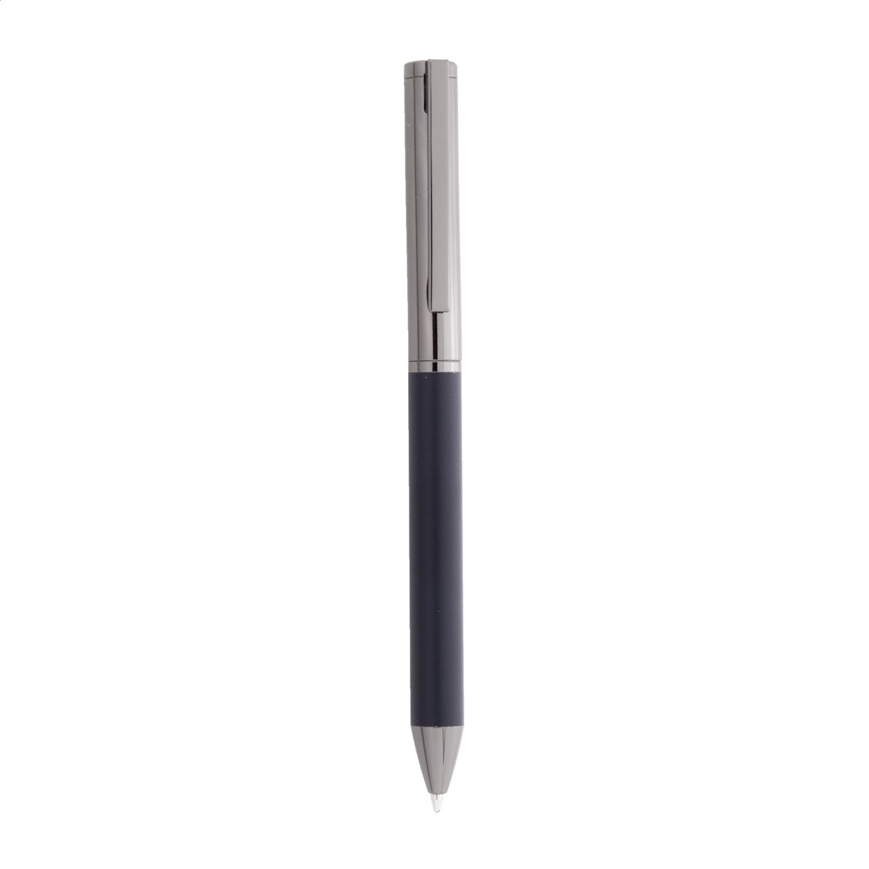 Elegante set di penne in metallo composto da una penna a sfera ed una penna roller in confezione regalo di cartoncino nero. Con refill blu.