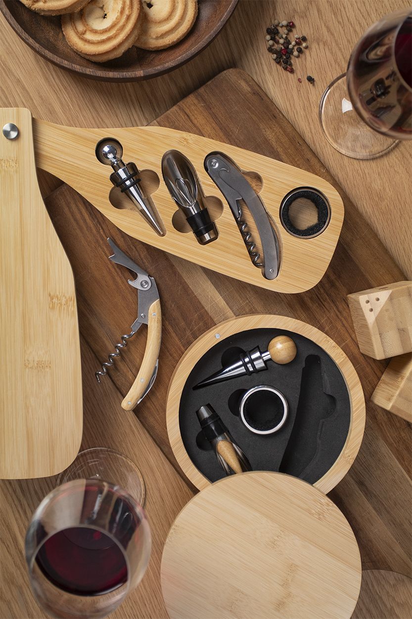 Set vino da 4 pz in acciaio inossidabile in scatola di bambù a forma di bottiglia. Il set si compone di cavatappi, salvagoccia, beccuccio e tappo.