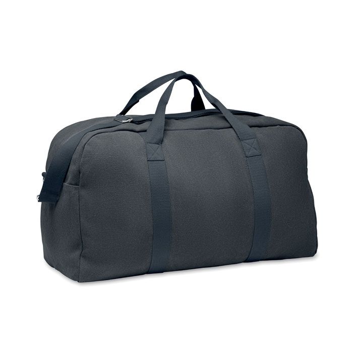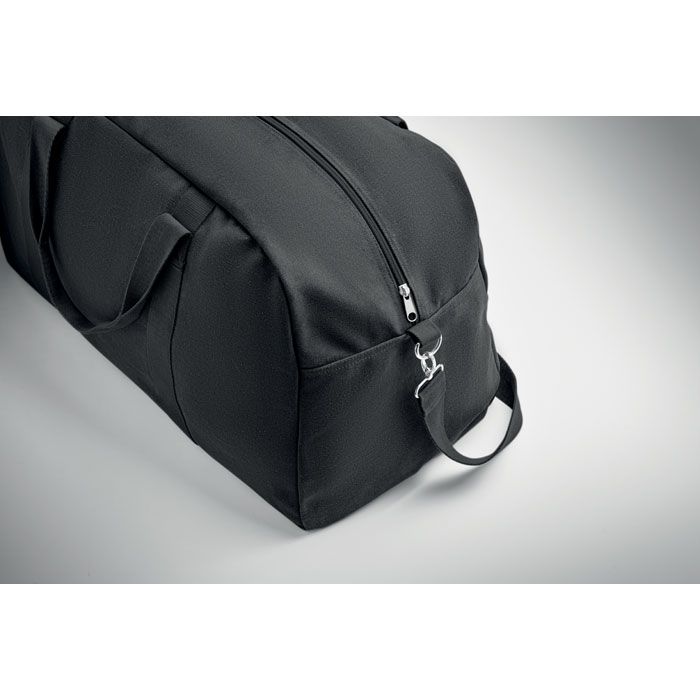 Borsone da viaggio in tessuto riciclato da 450 gr/m² (60% cotone riciclato e 40% poliestere riciclato) con tracolla in cotone regolabile e removibile.