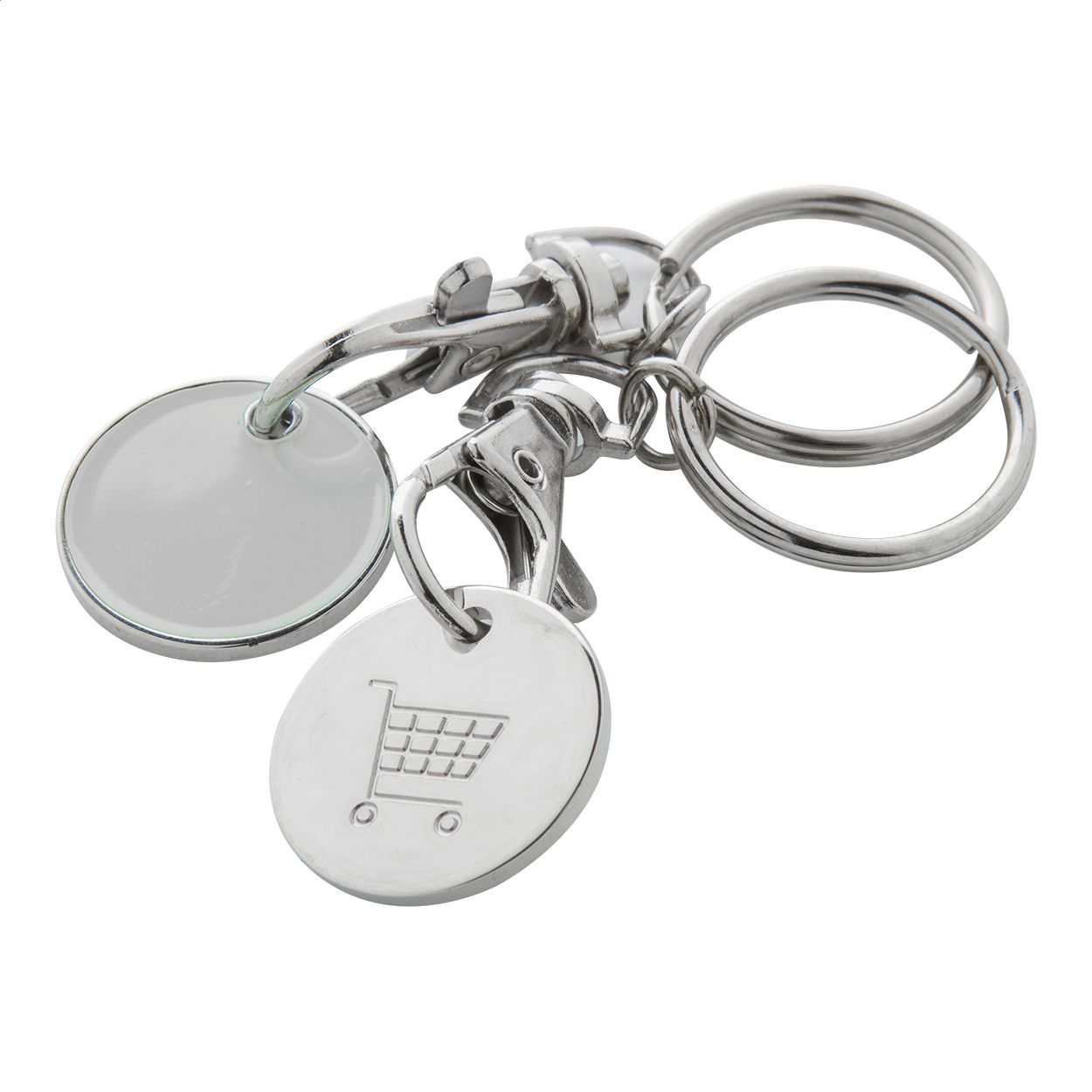 Portachiavi in metallo con gettone per carrello della spesa. Un lato del gettone è colorato mentre su l'altro è inciso un carrello della spesa. Dimensioni della moneta: ø23×1,7 mm.