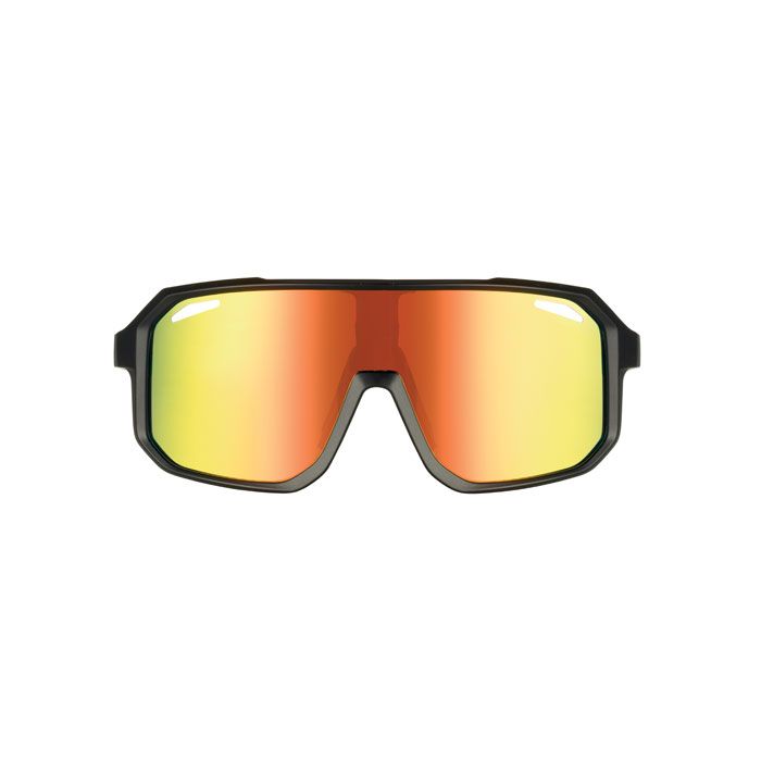 Occhiali da sole sportivi con lenti specchiate e montatura colorata. Protezione UV400.