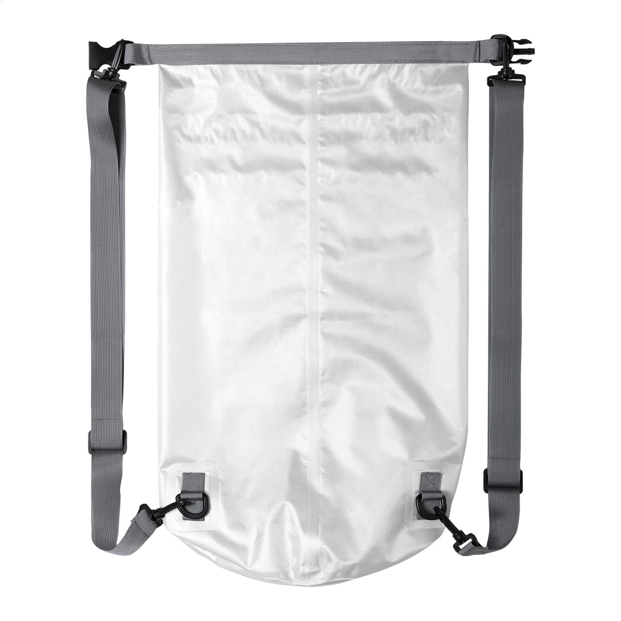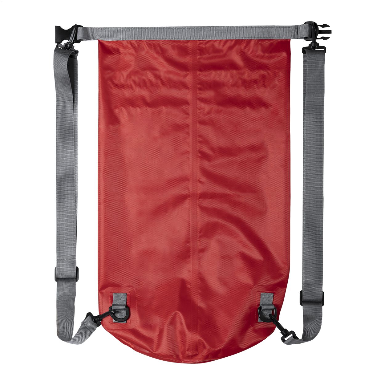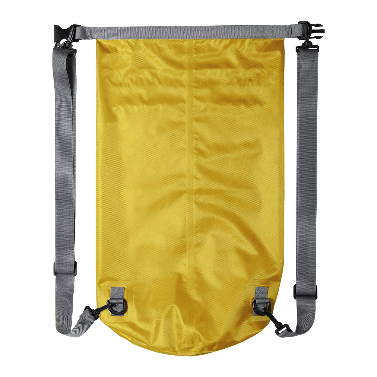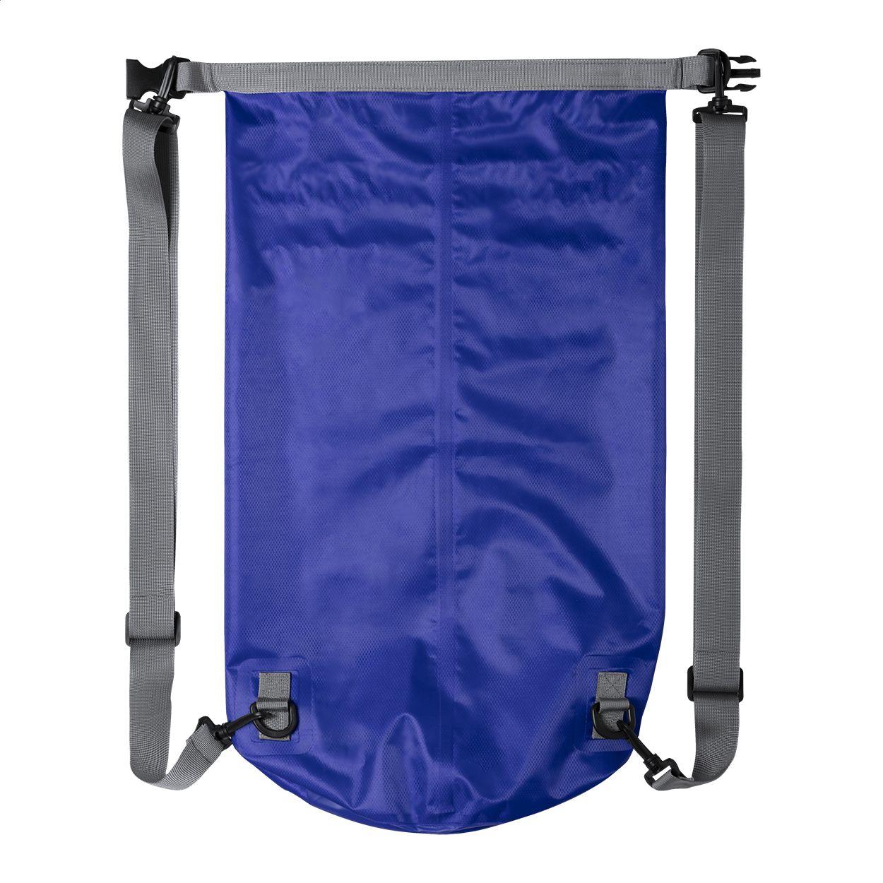 Sacca zaino impermeabile, in tessuto ripstop, spallacci regolabili e fibbia in plastica.