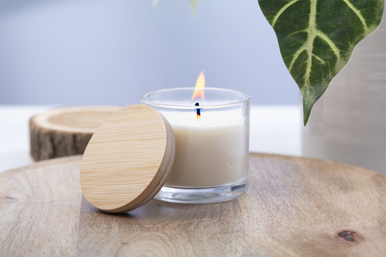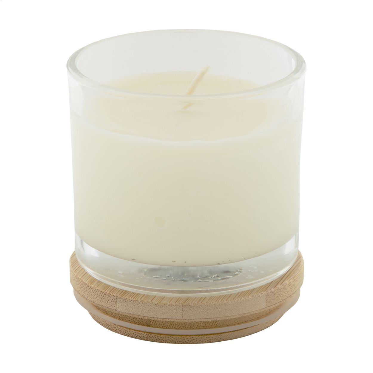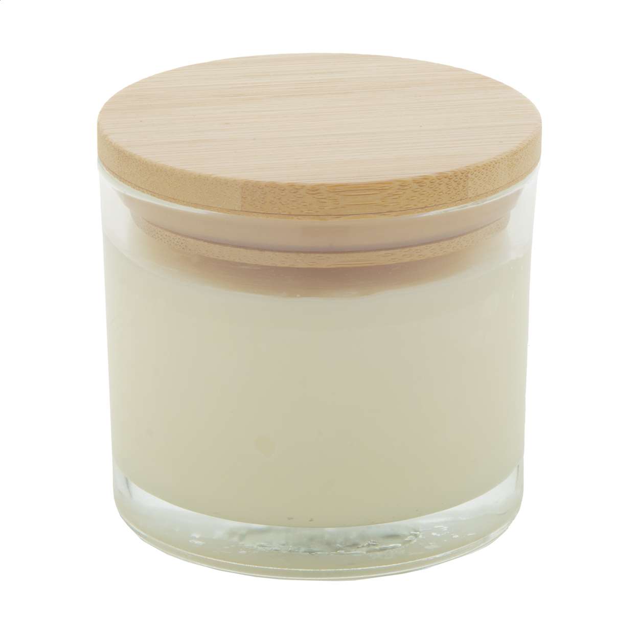 Candela da 95 grammi di cera a base vegetale con profumazione alla vaniglia, in contenitore di vetro con coperchio in bambù. Confezionata in scatola di cartoncino kraft.