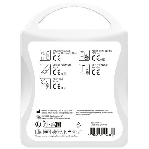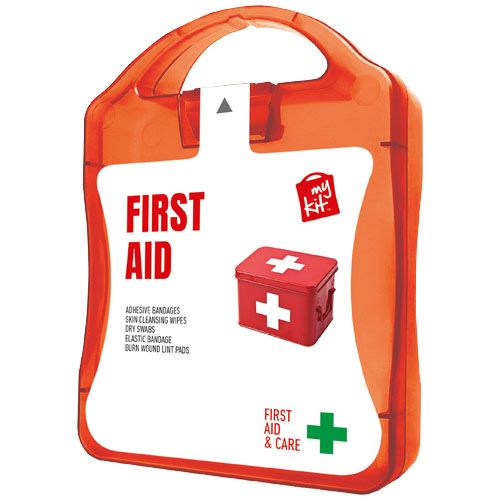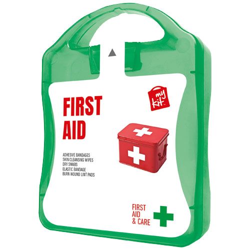 Questo kit di primo soccorso basico è utile a casa o in auto, pronto all'occorrenza per ogni evento. Contenuto: 12 cerotti resistenti all'acqua, 4 salviettine disinfettanti, 2 garze sterili, 1 benda elastica, 2 garze per ustioni. Tutti i prodotti contenuti nei MyKit rispettano le norme Europee vigenti. I prezzi includono stampa all-over fronte e retro.