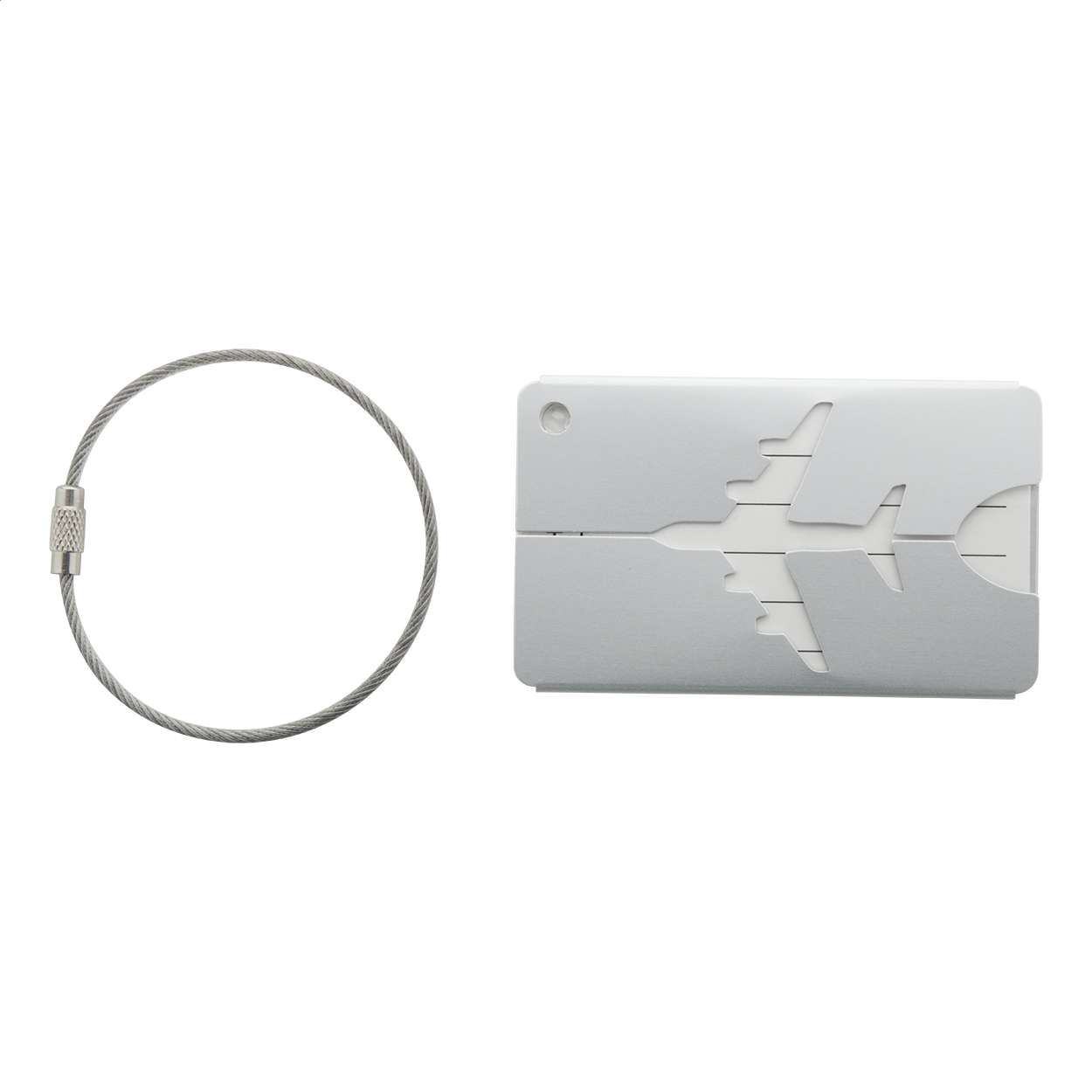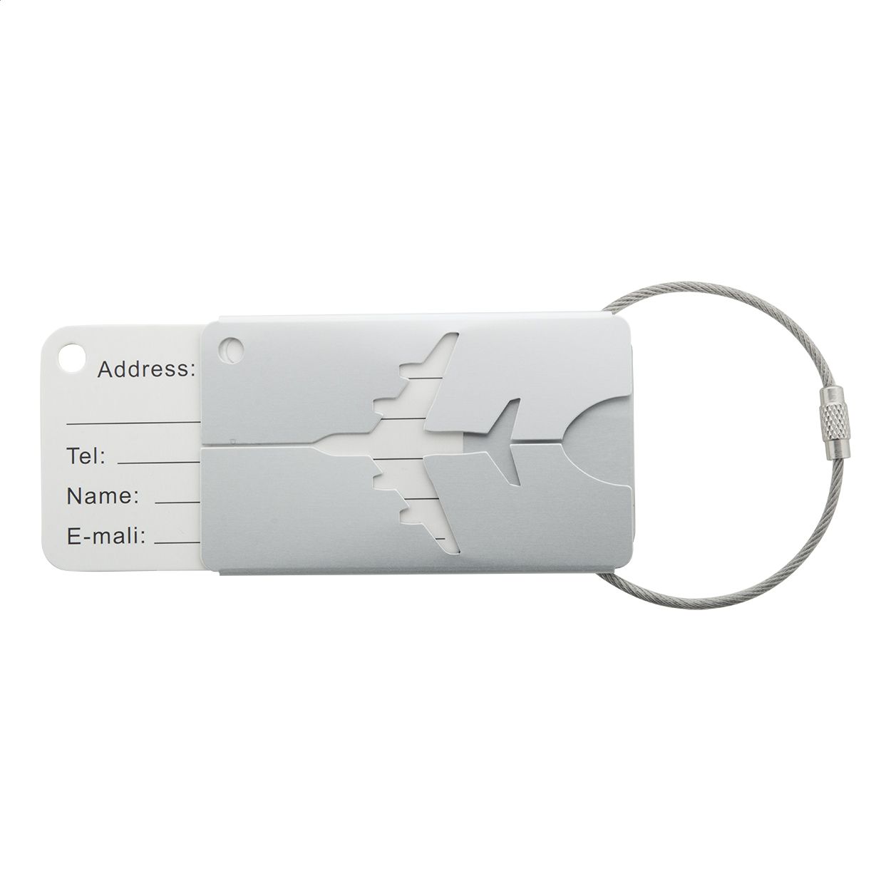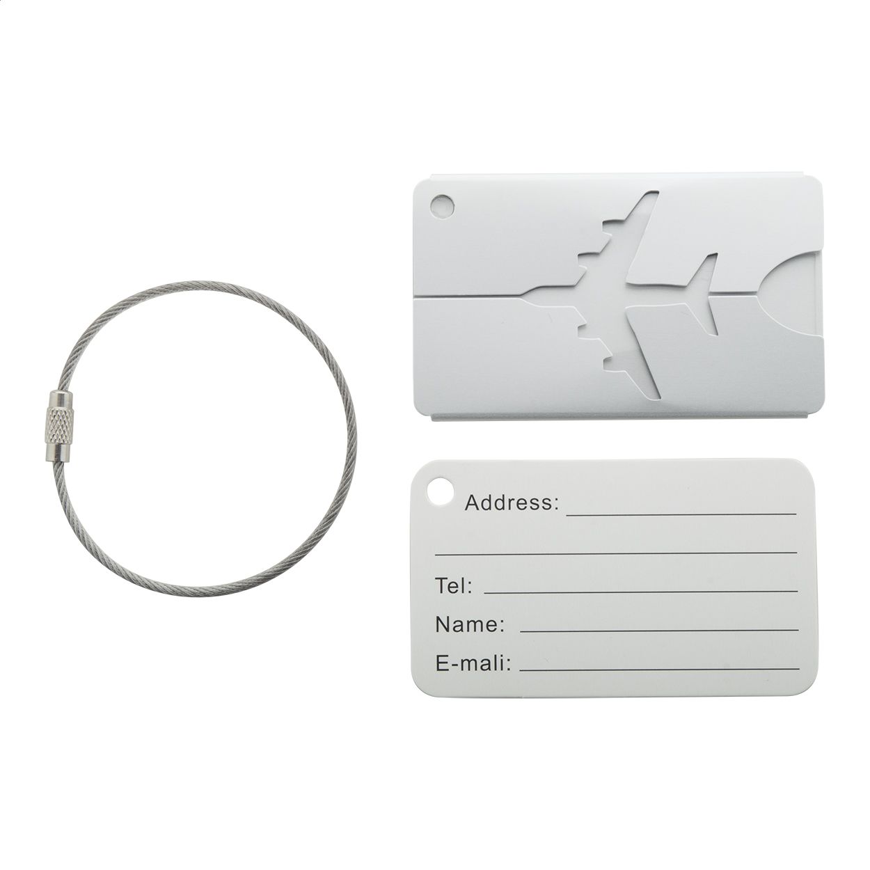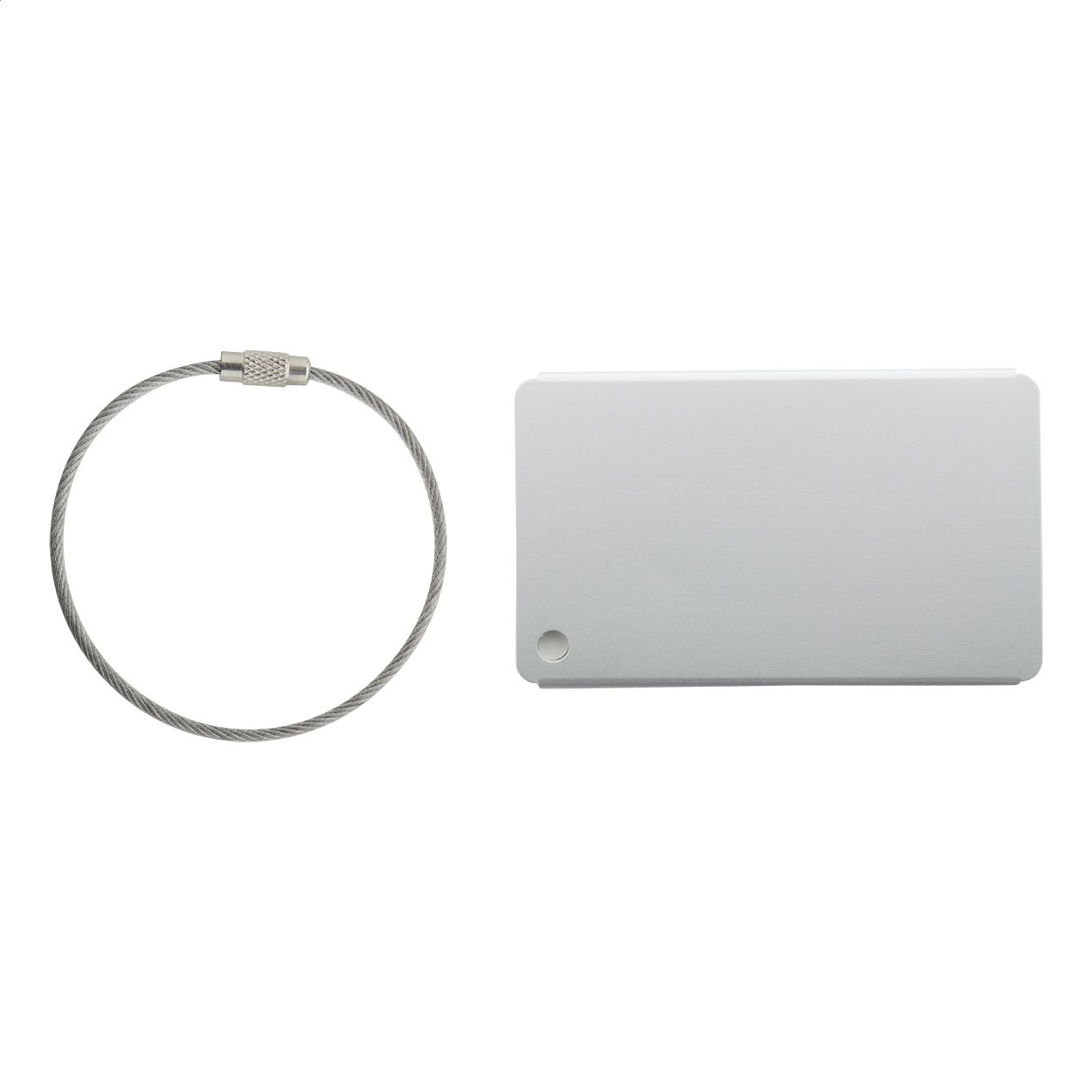 Etichetta per bagagli in alluminio e laccetto in metallo.