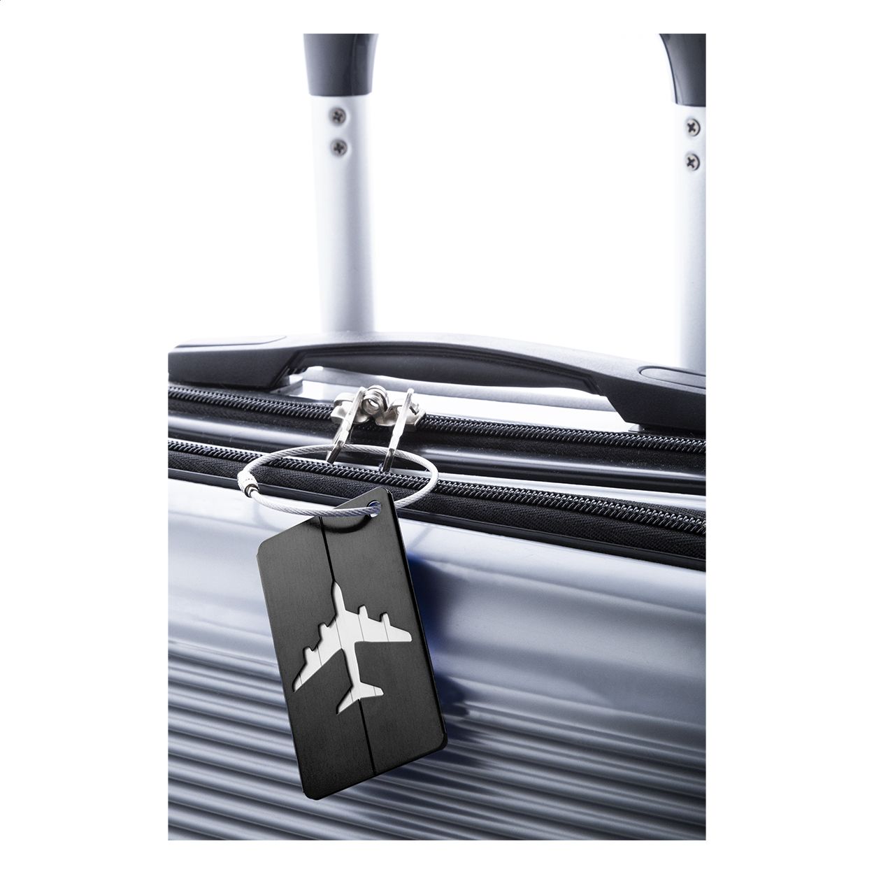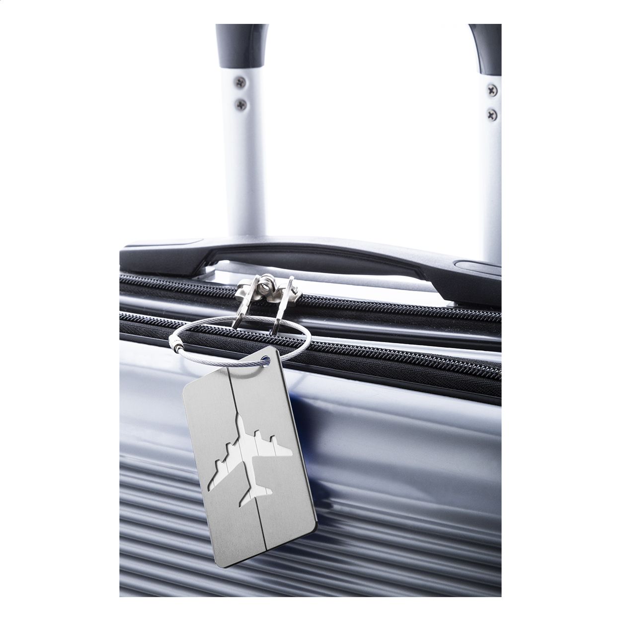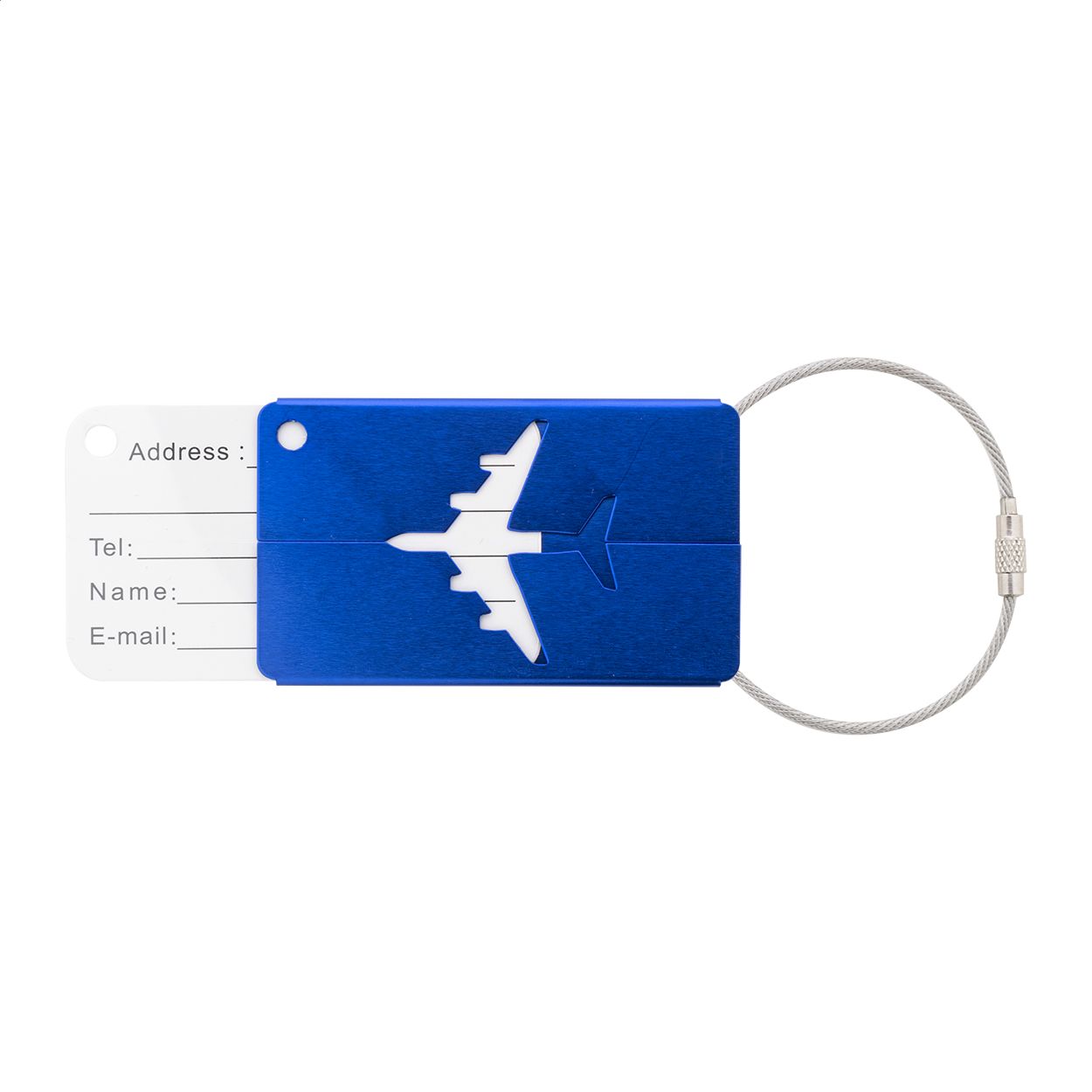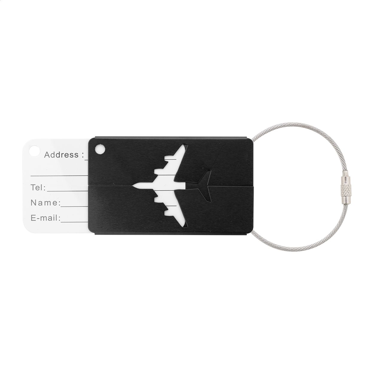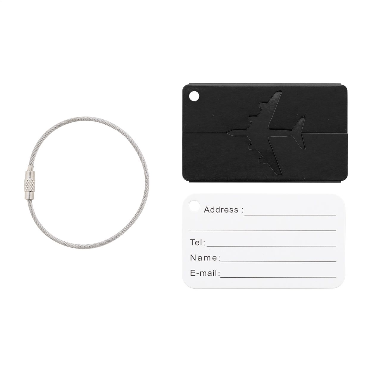 Etichetta per bagagli in alluminio e laccetto in metallo.