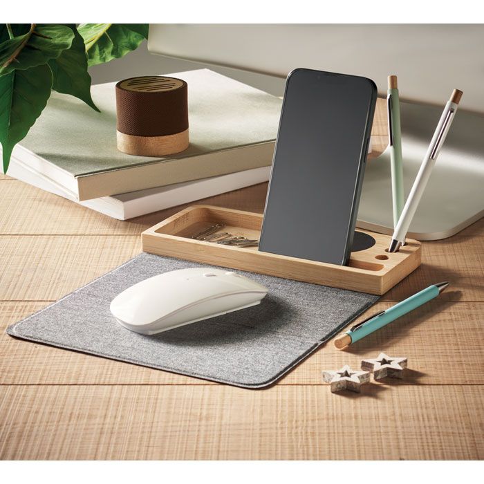 Caricatore wireless e organizer in bambù con supporto per telefono, 3 portapenne, tappetino per mouse pieghevole in RPET. Uscita: DC 9V/1,67A (15W).