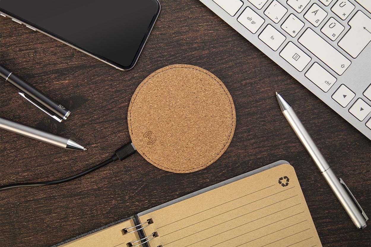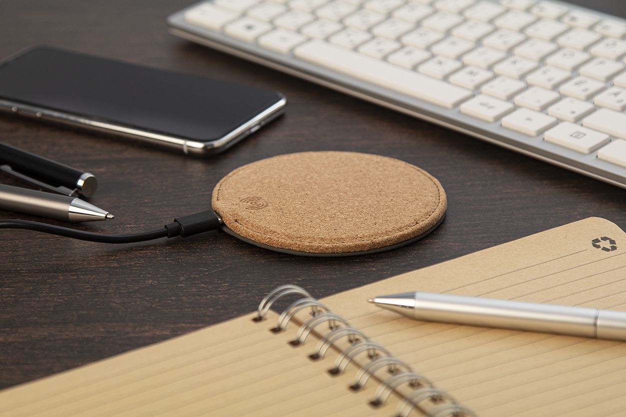 Caricabatterie rapido wireless (10W) rivestito in sughero naturale con fondo in pelle PU. Cavo di ricarica USB incluso.