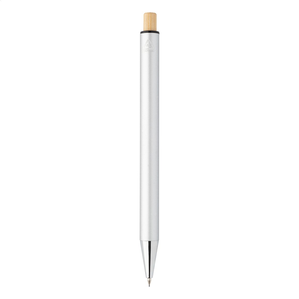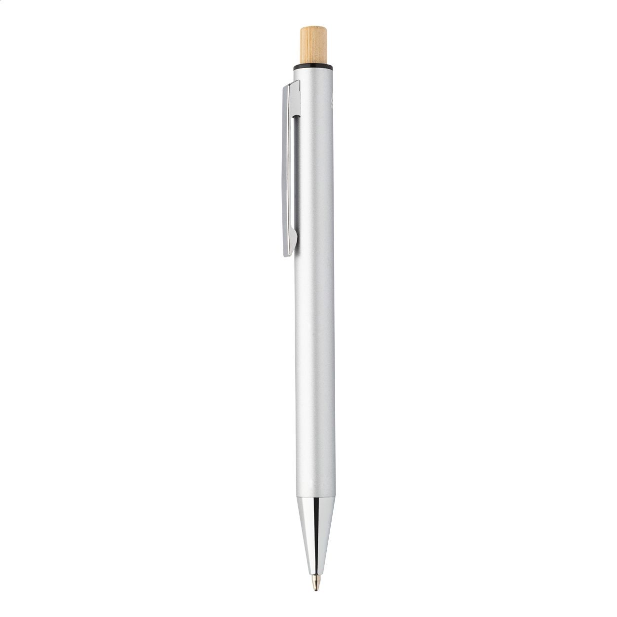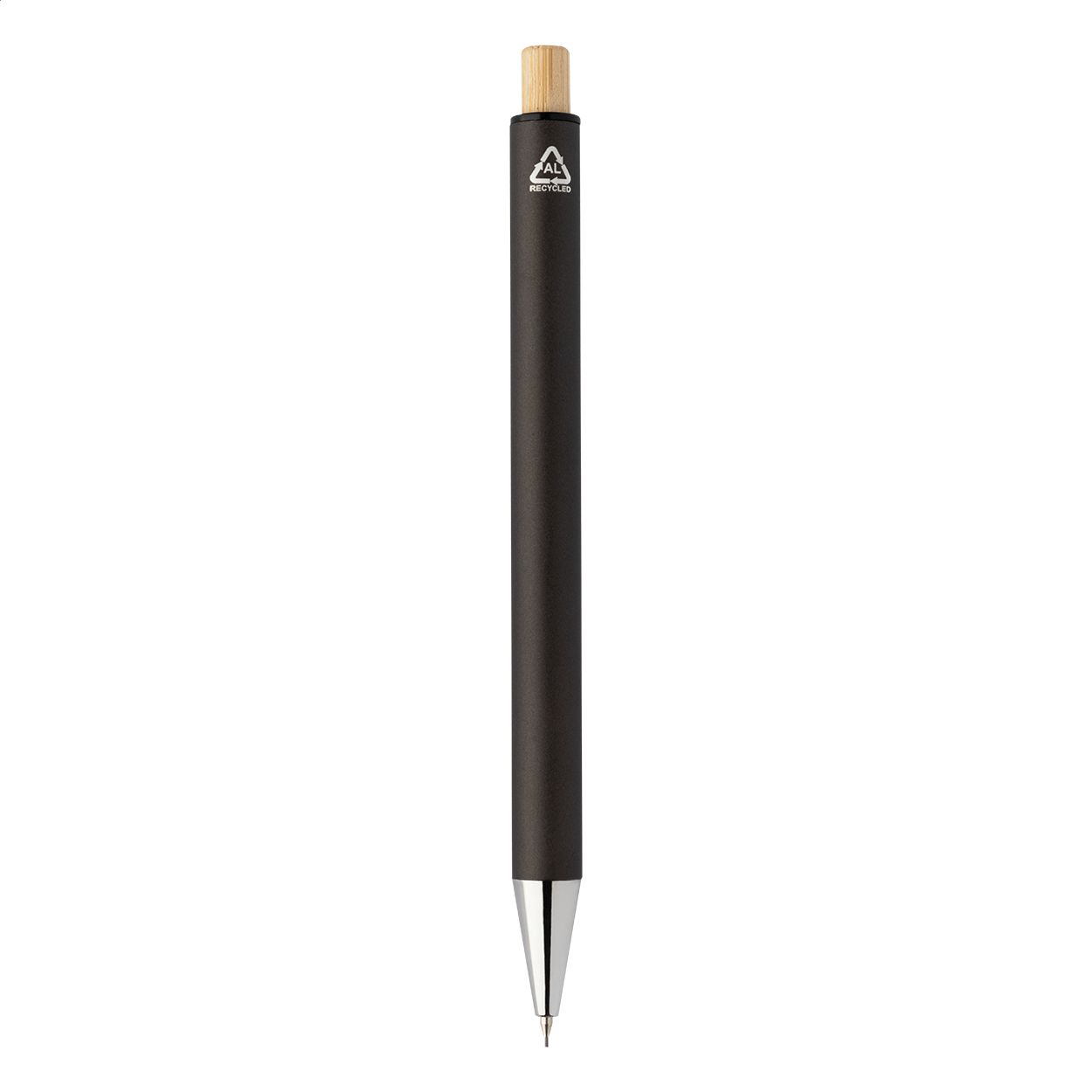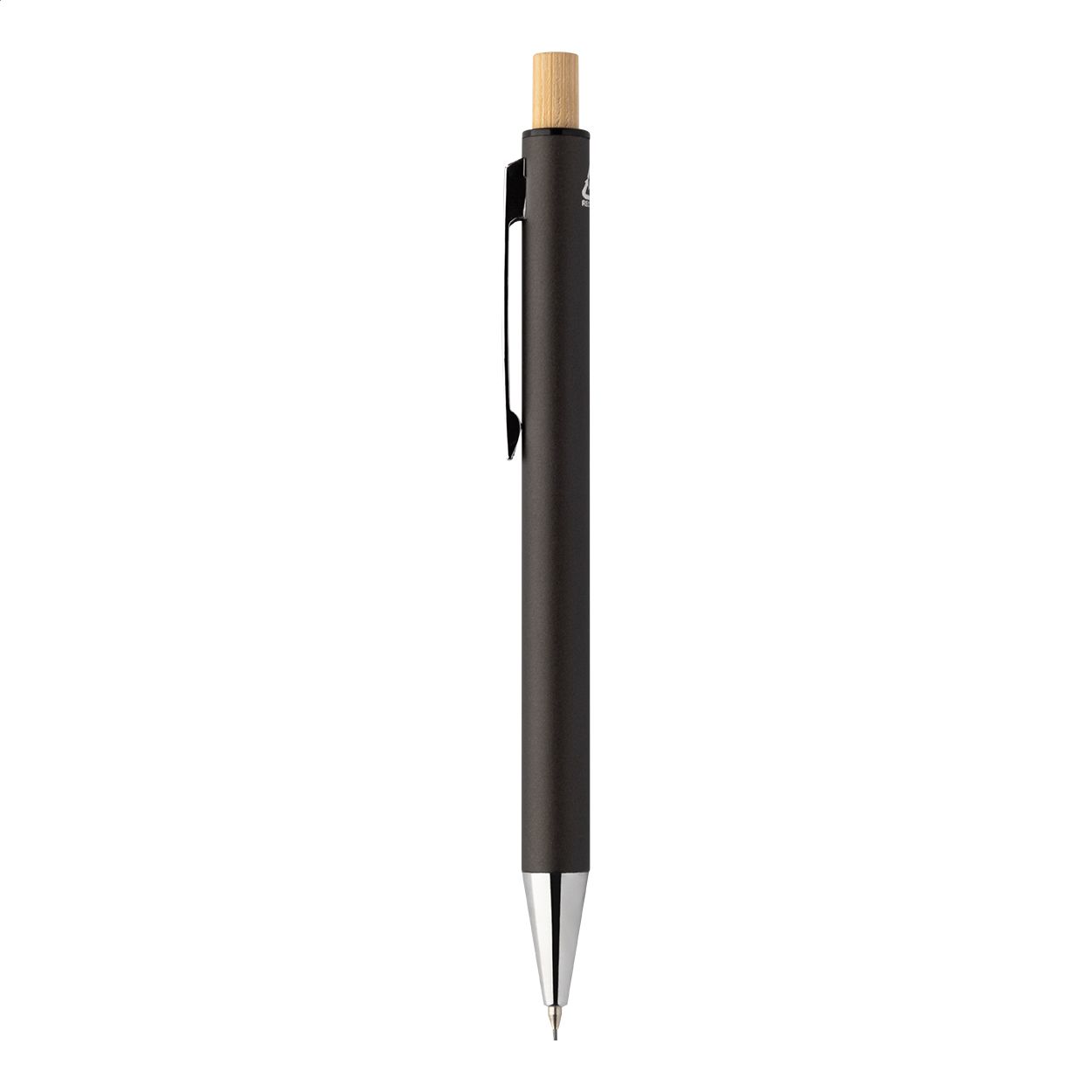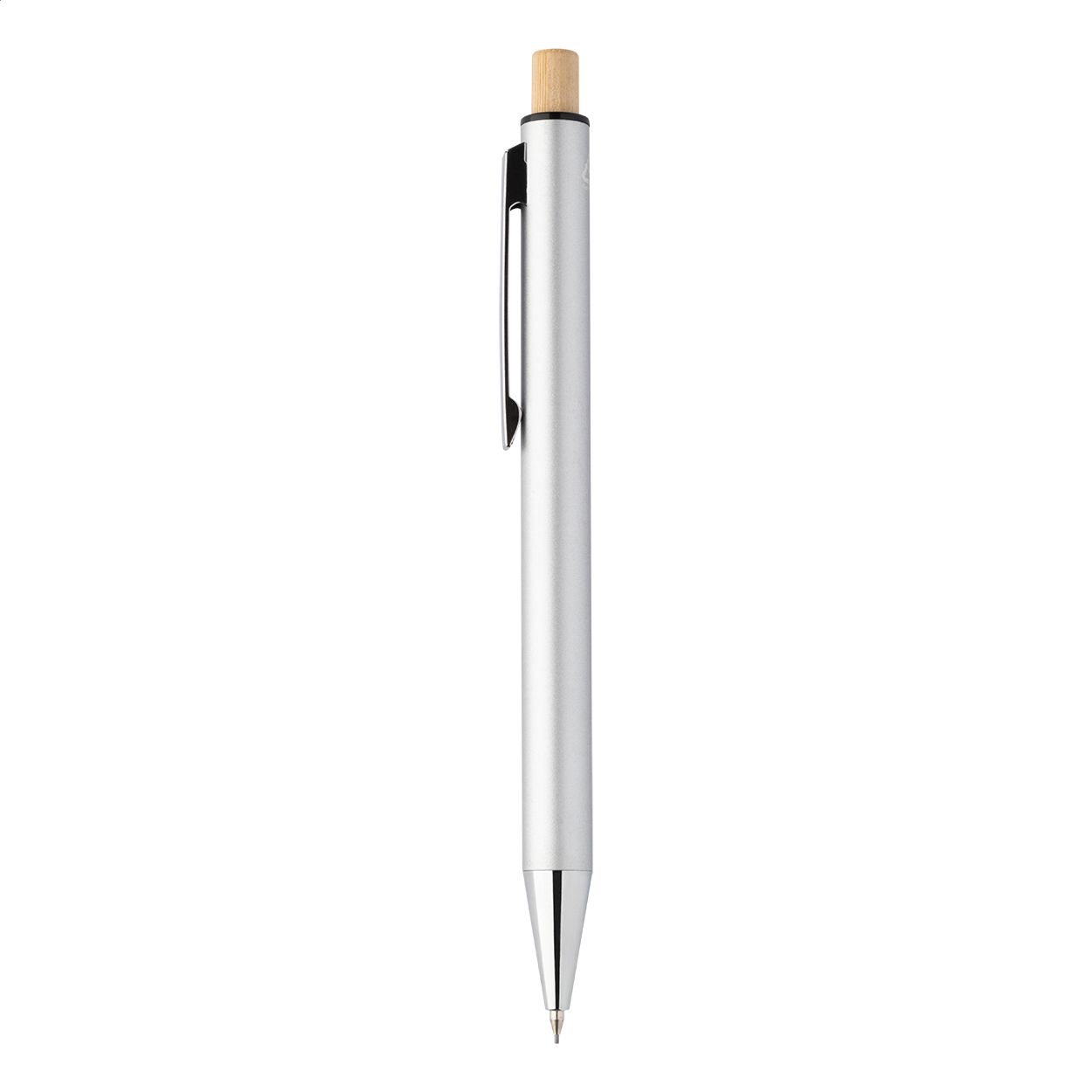 Set in alluminio riciclato composto da penna a sfera e da una matita meccanica, pulsanti in bambù, refill blu e mina da 0,7 mm. Confezione in scatola di cartoncino kraft.