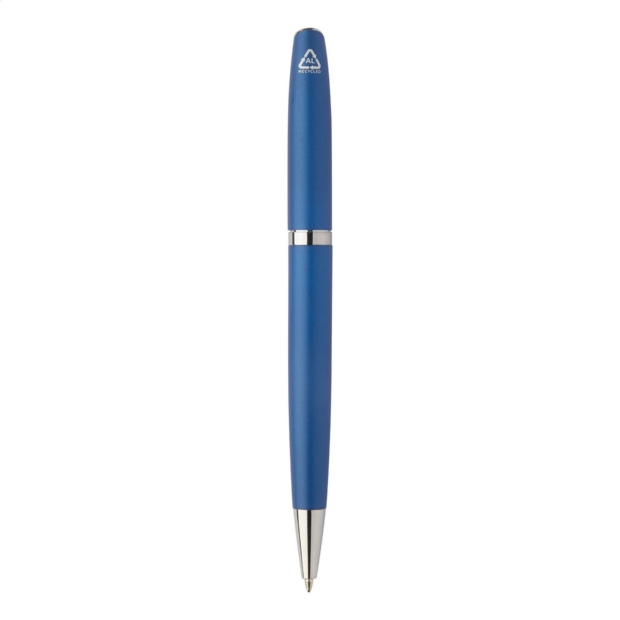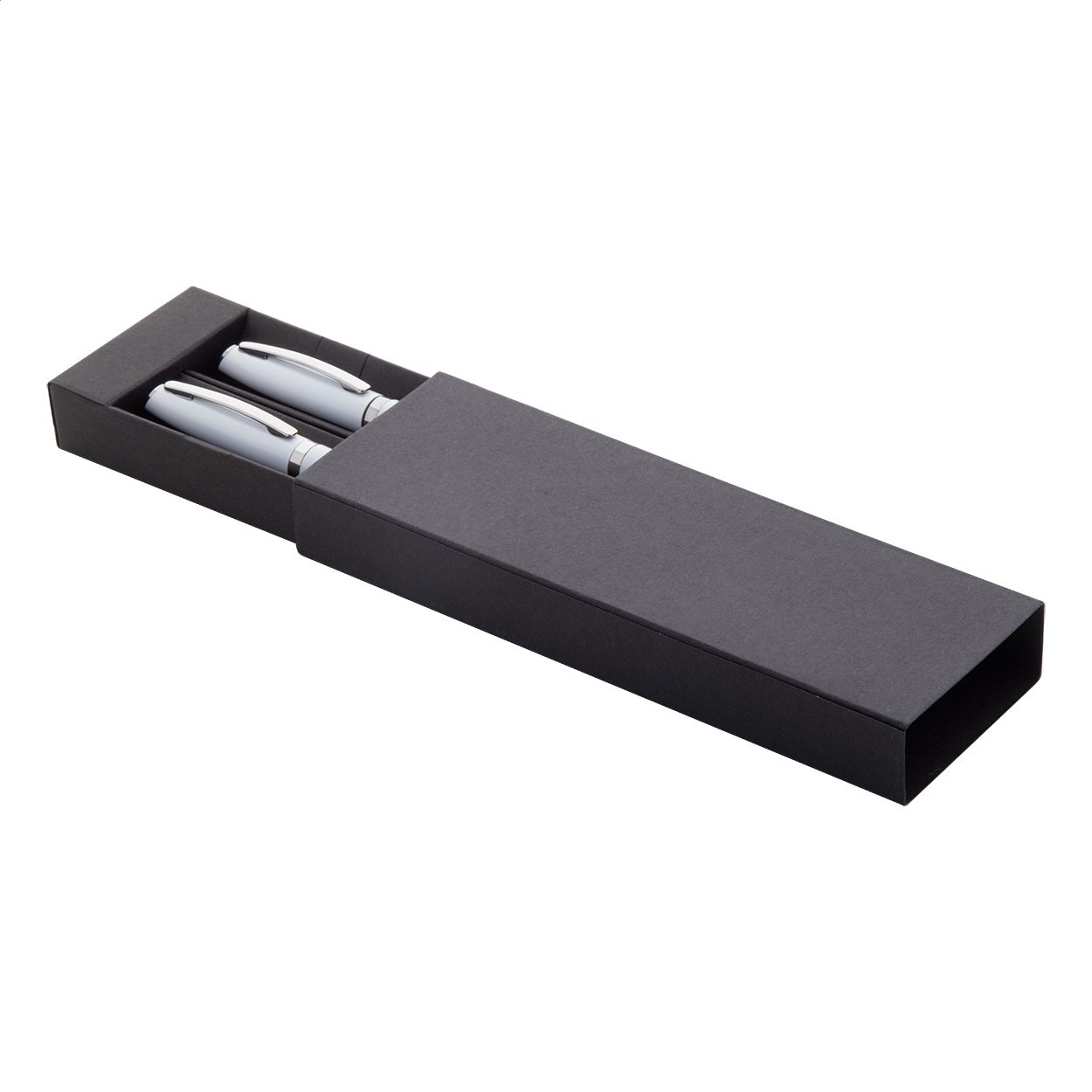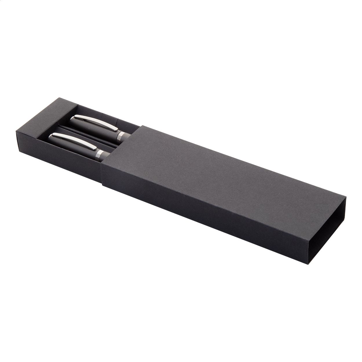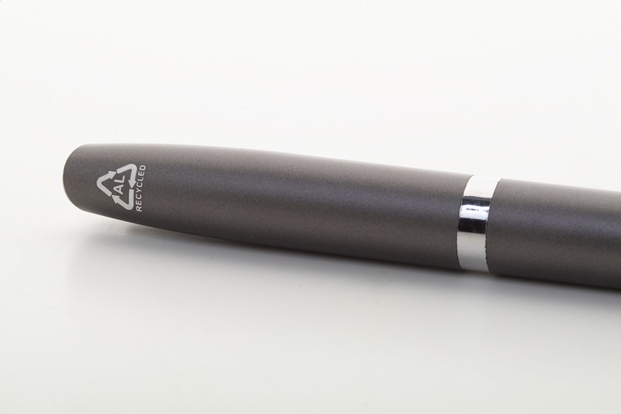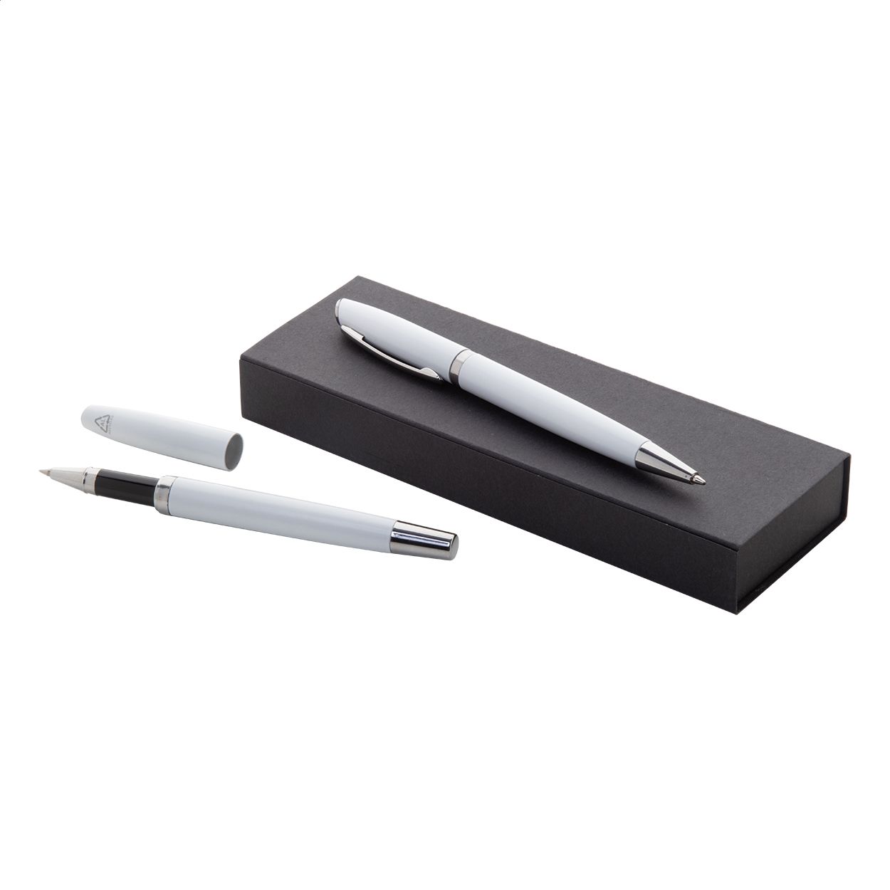 Set di penne con refill blu, in alluminio riciclato composto da penna roller e penna a sfera in confezione regalo di cartoncino nero.