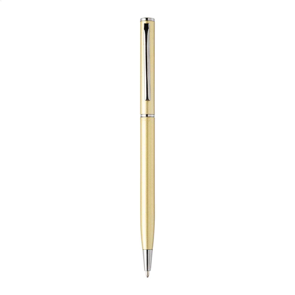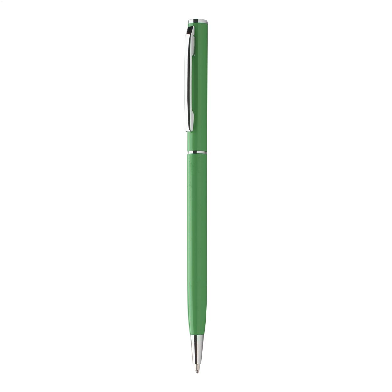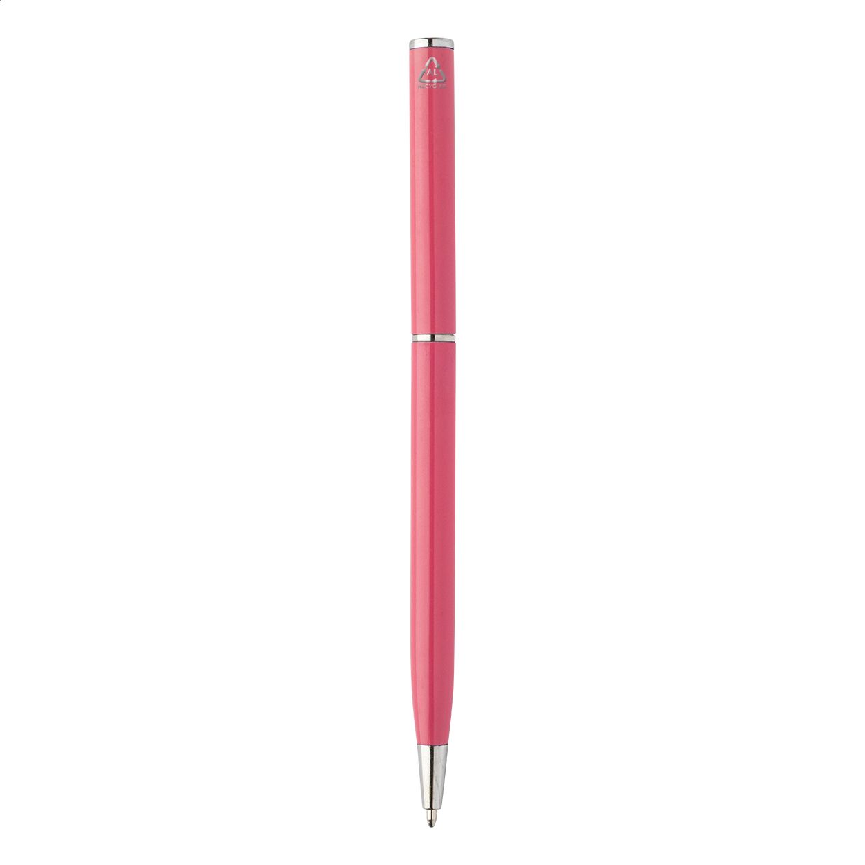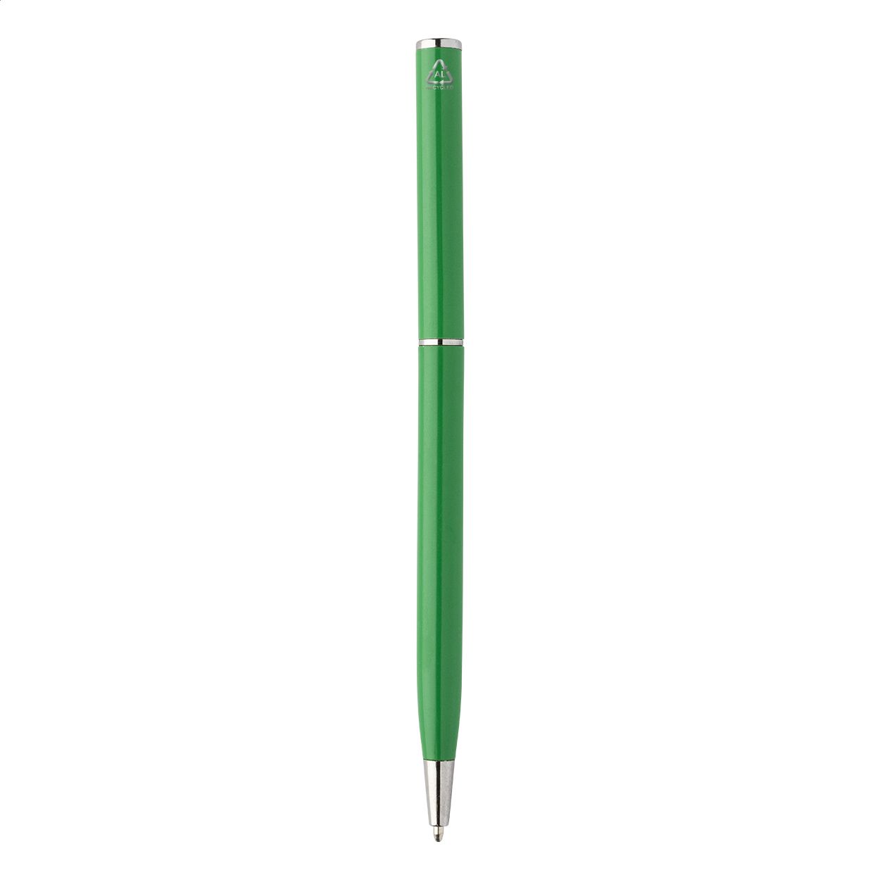 Penna a sfera in alluminio riciclato con meccanismo di apertura a rotazione e componenti cromate. Fornita con refill blu.