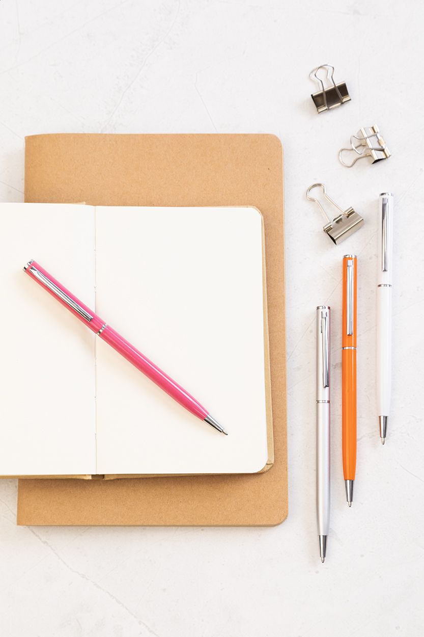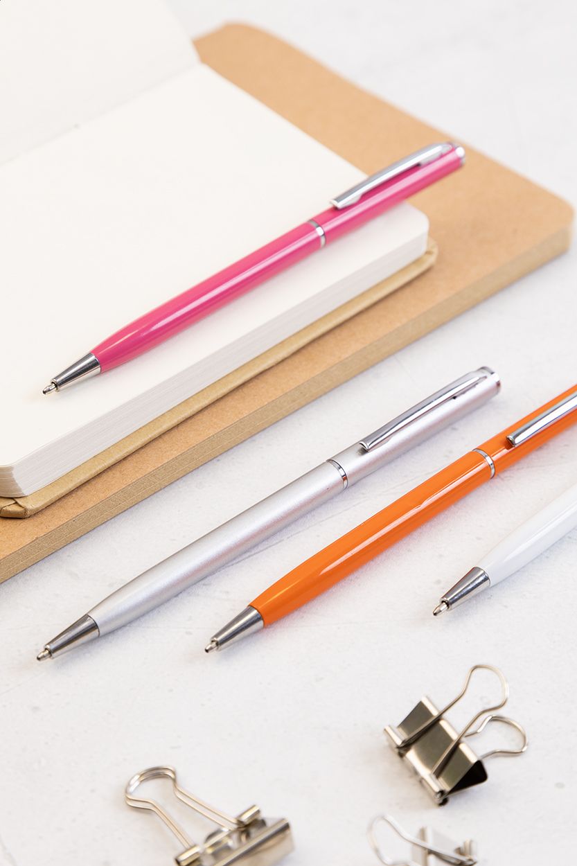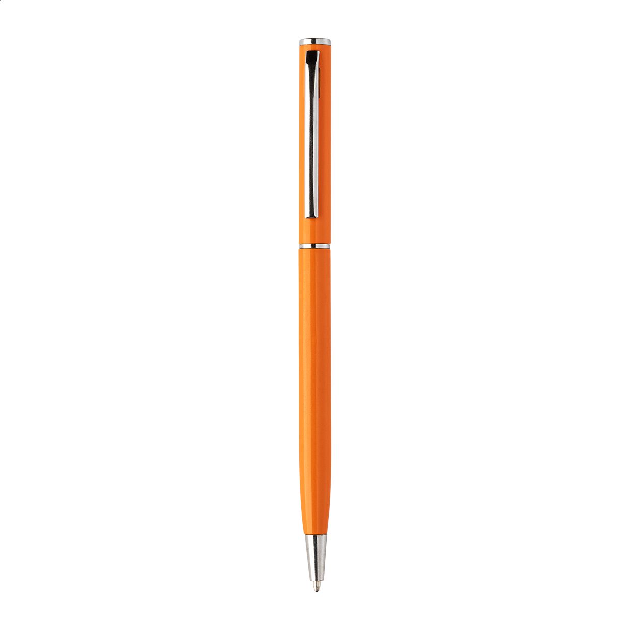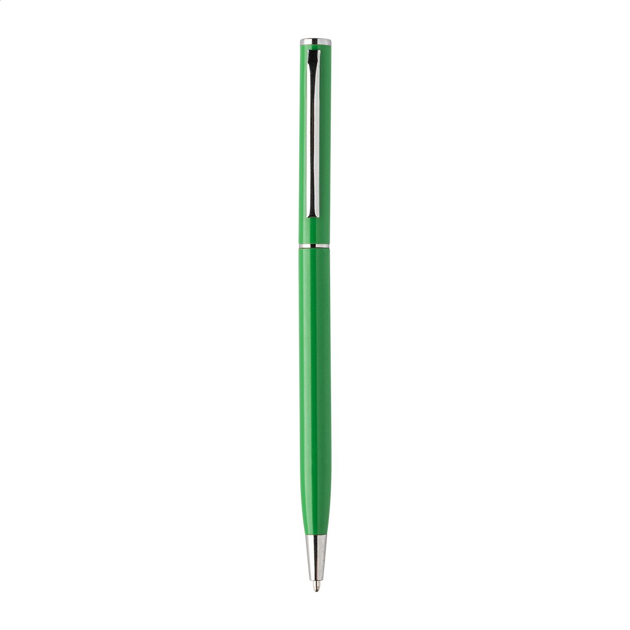 Penna a sfera in alluminio riciclato con meccanismo di apertura a rotazione e componenti cromate. Fornita con refill blu.