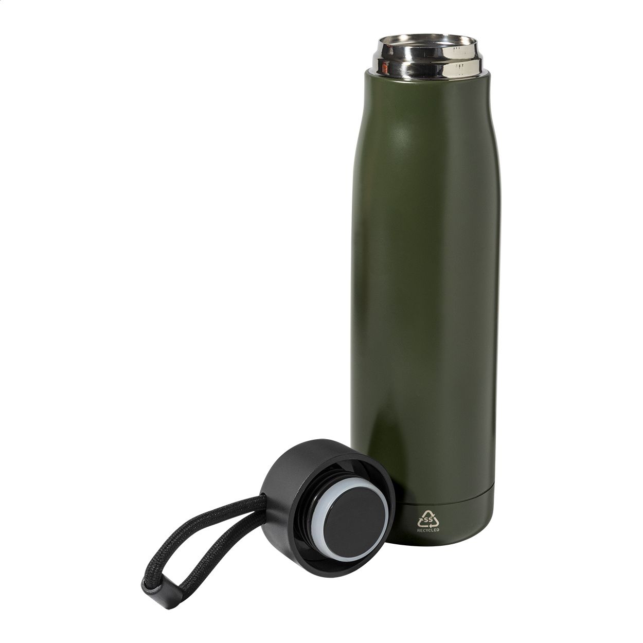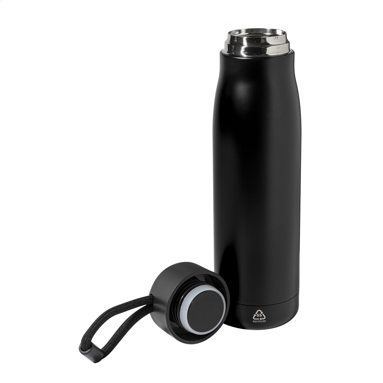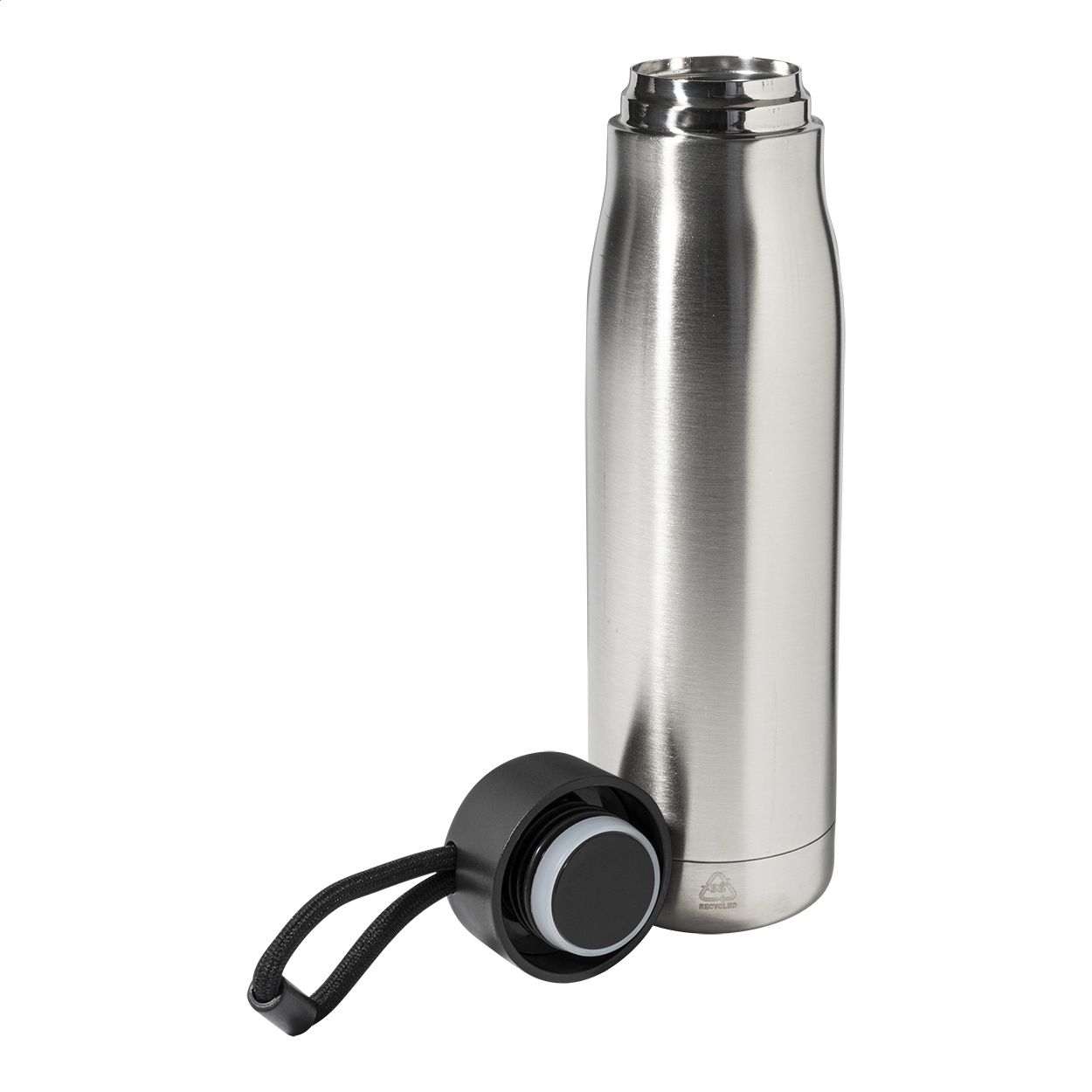 Borraccia termica da 500ml in acciaio riciclato a doppia parete con tappo in PP e cinturino integrato.