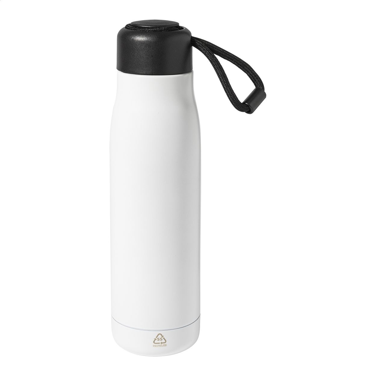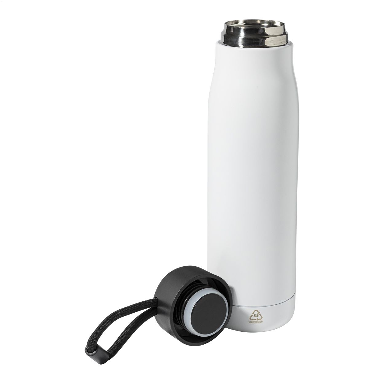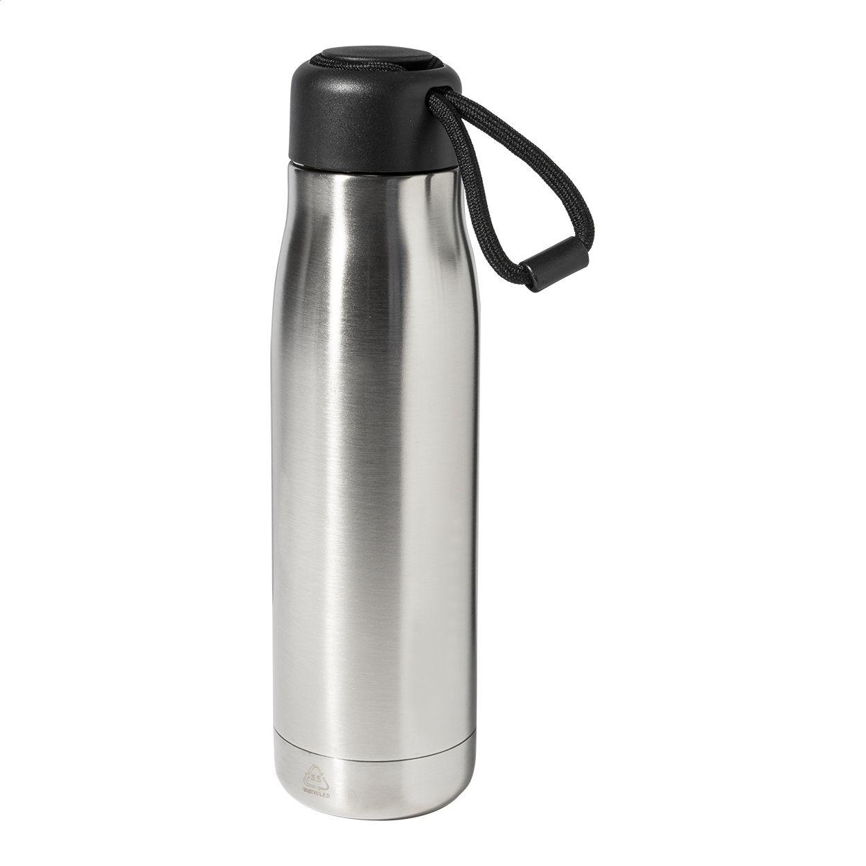 Borraccia termica da 500ml in acciaio riciclato a doppia parete con tappo in PP e cinturino integrato.