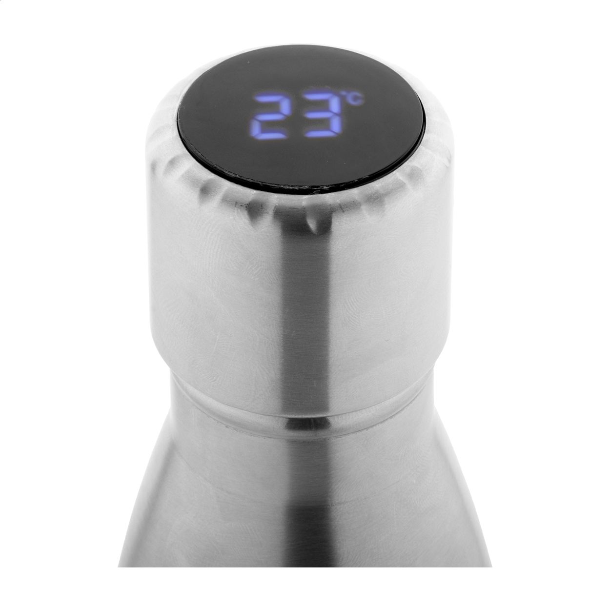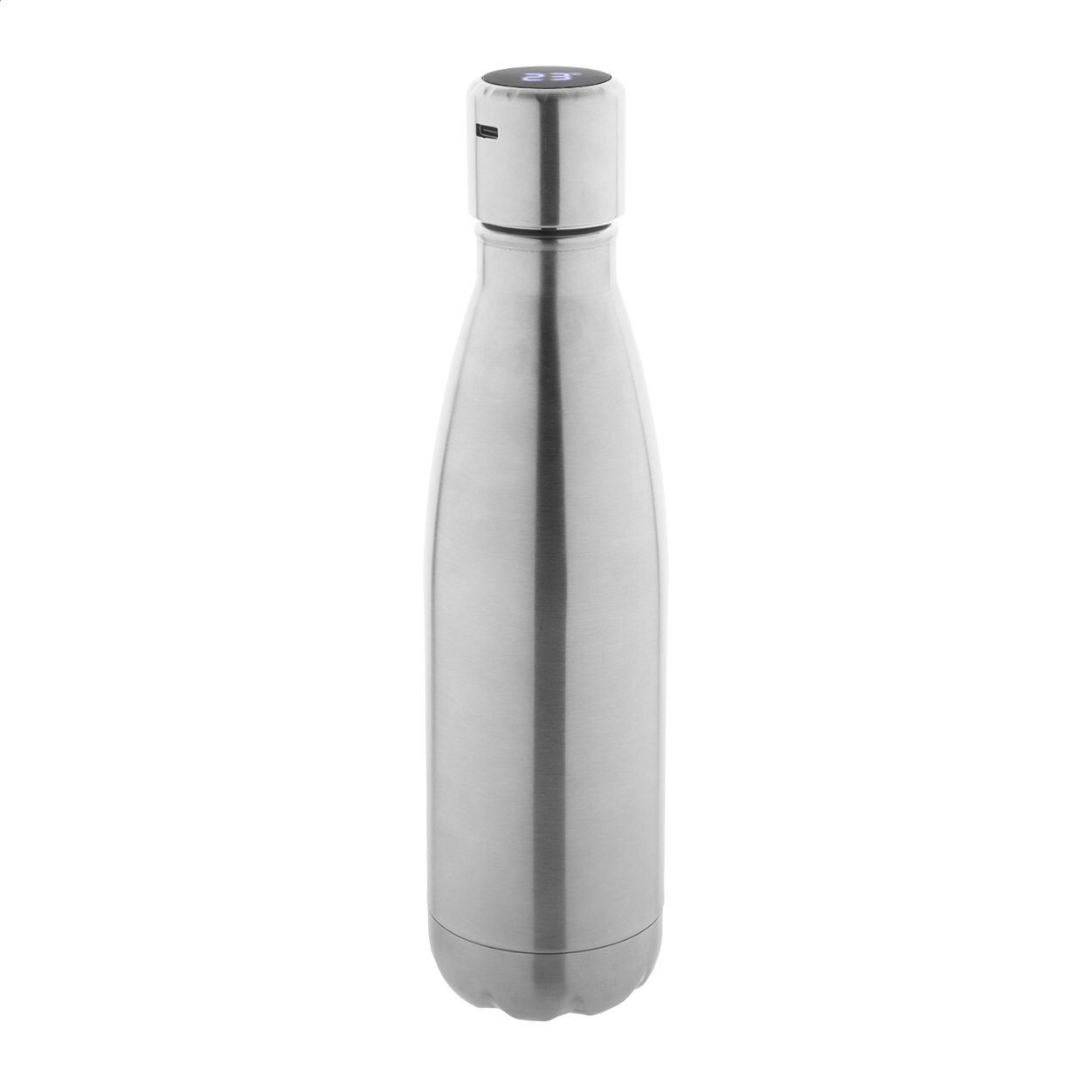 Borraccia termica da 500ml. a doppia parete in acciaio inox riciclato con termometro a sfioramento a LED sul coperchio. Fornita con batteria ricaricabile USB integrata e cavo di ricarica USB.