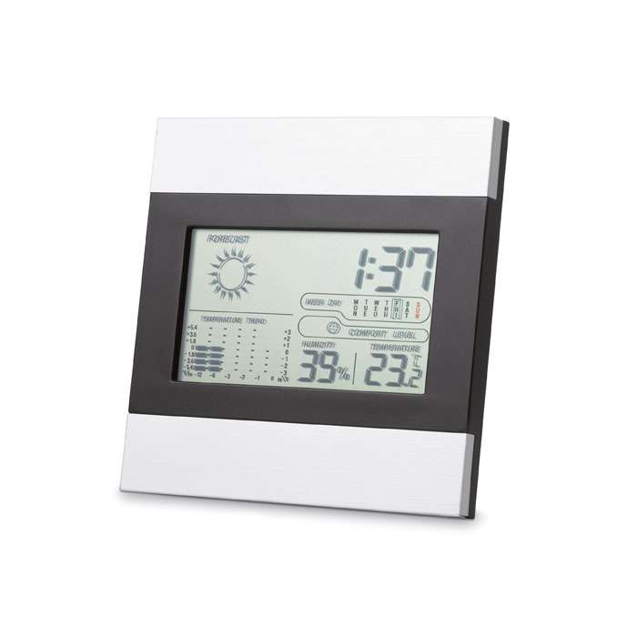 Stazione meteo con orologio, calendario, umidità e temperatura. 2 batterie AAA non incluse.