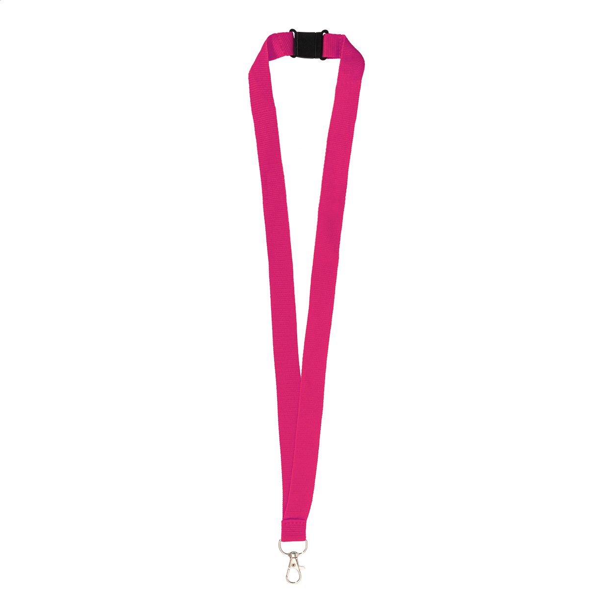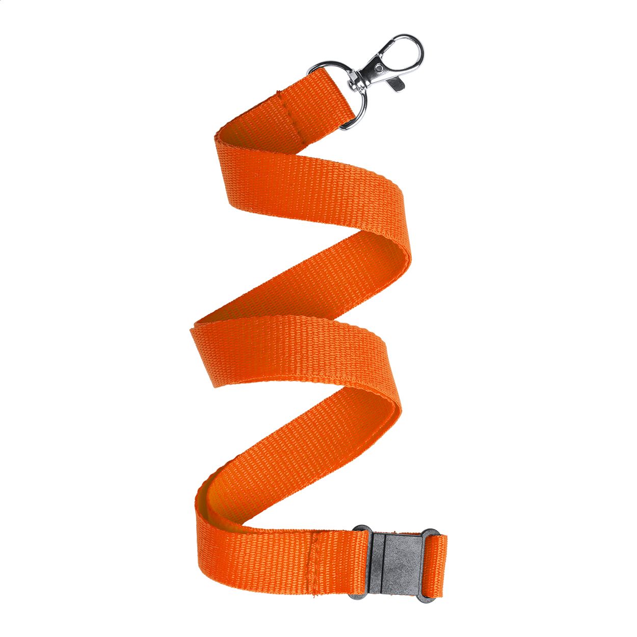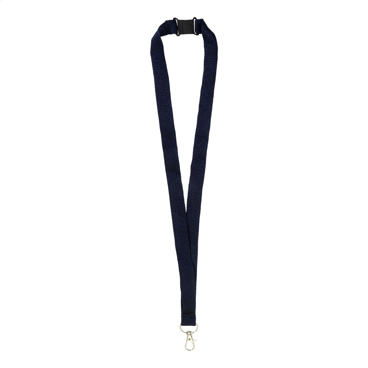 Lanyard in poliestere con moschettone in metallo e fibbia di sicurezza.
