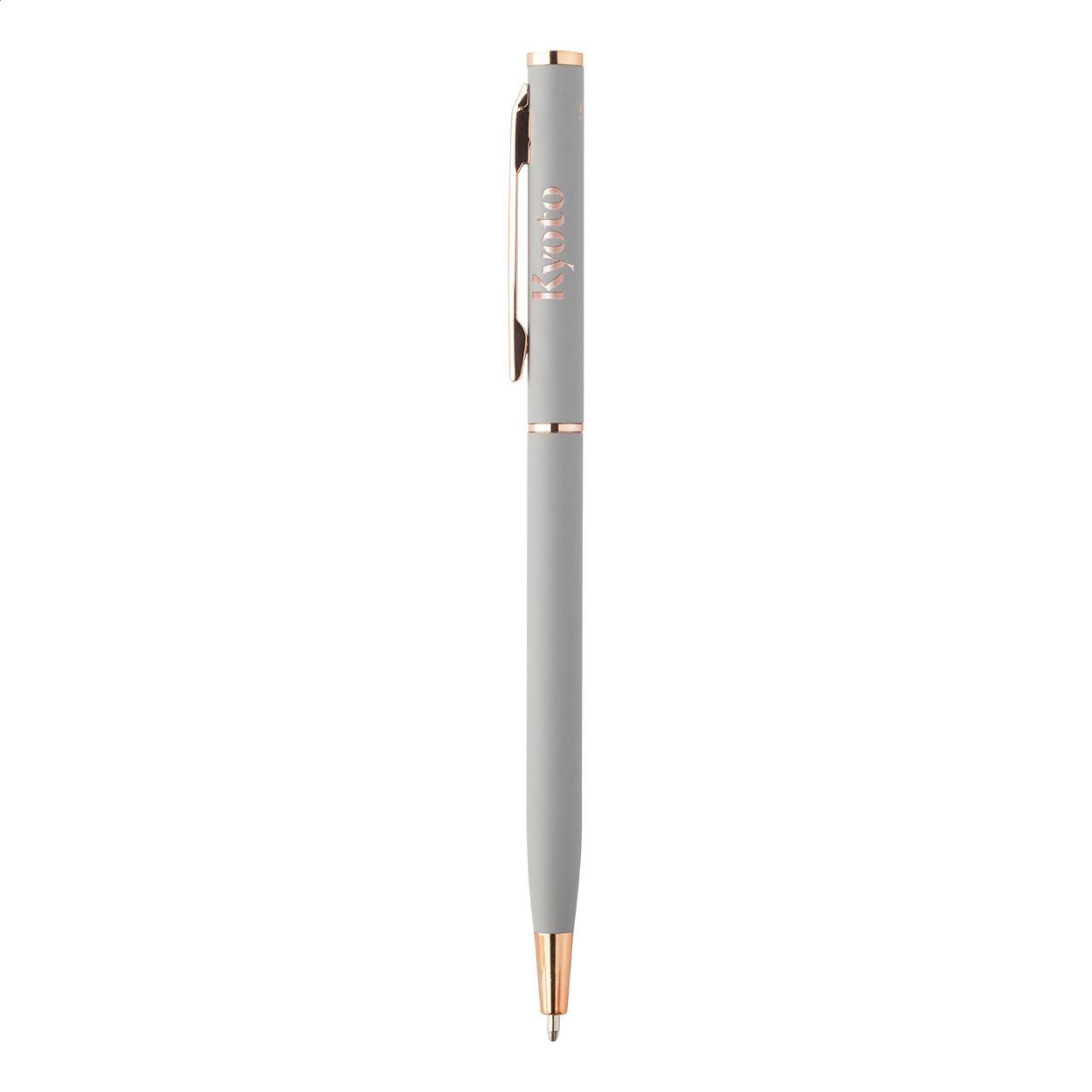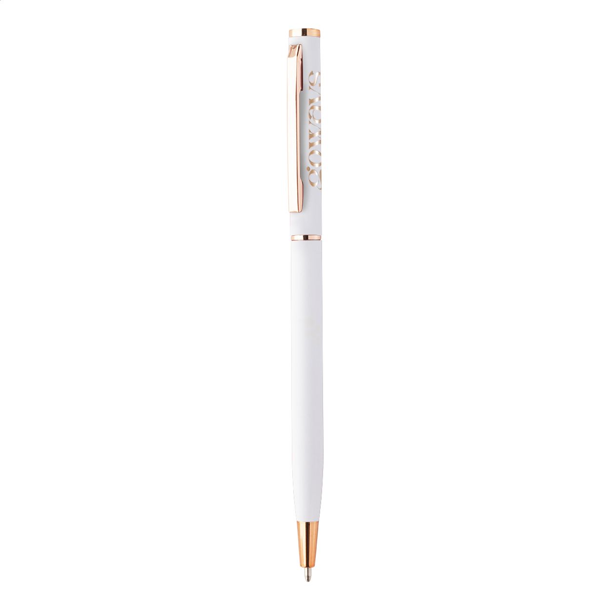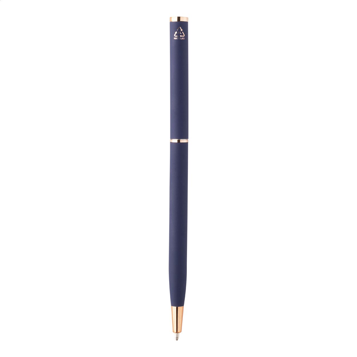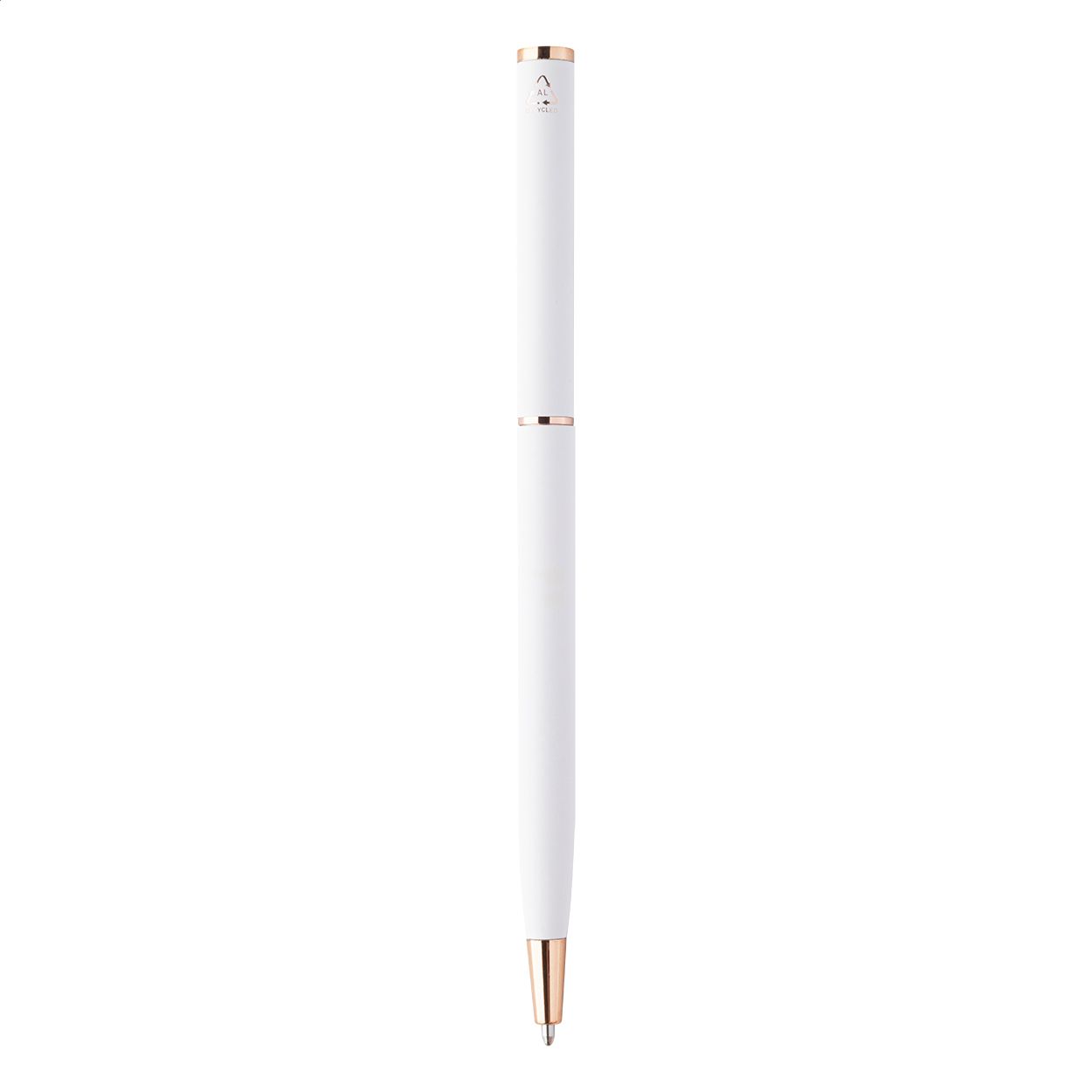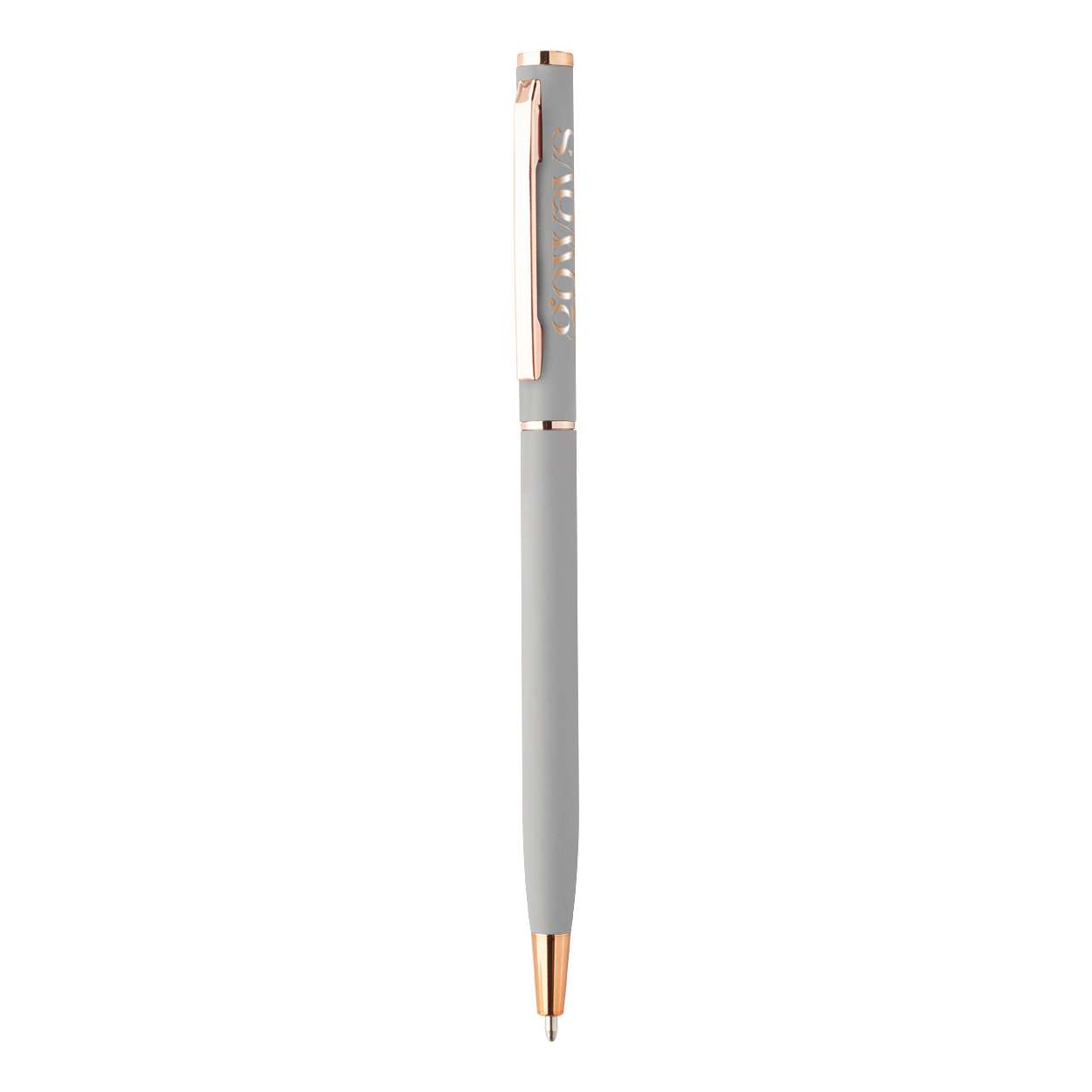Penna a sfera in alluminio riciclato con meccanismo a rotazione, dettagli in color oro rosa, refill blu e rivestimento gommato speciale per incisione laser a specchio in colore oro rosa.