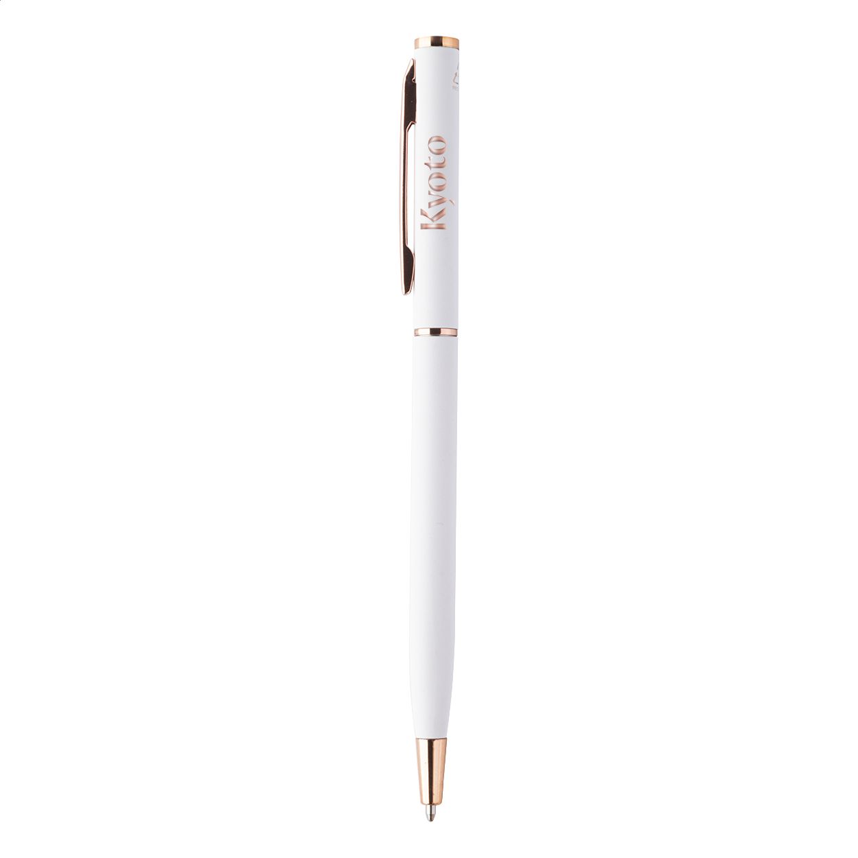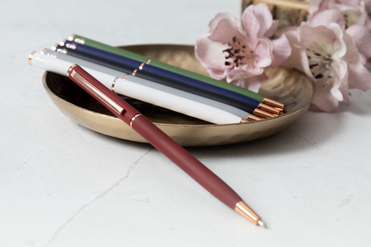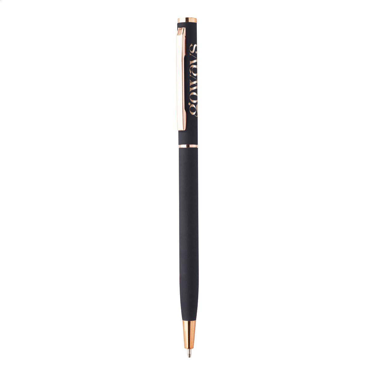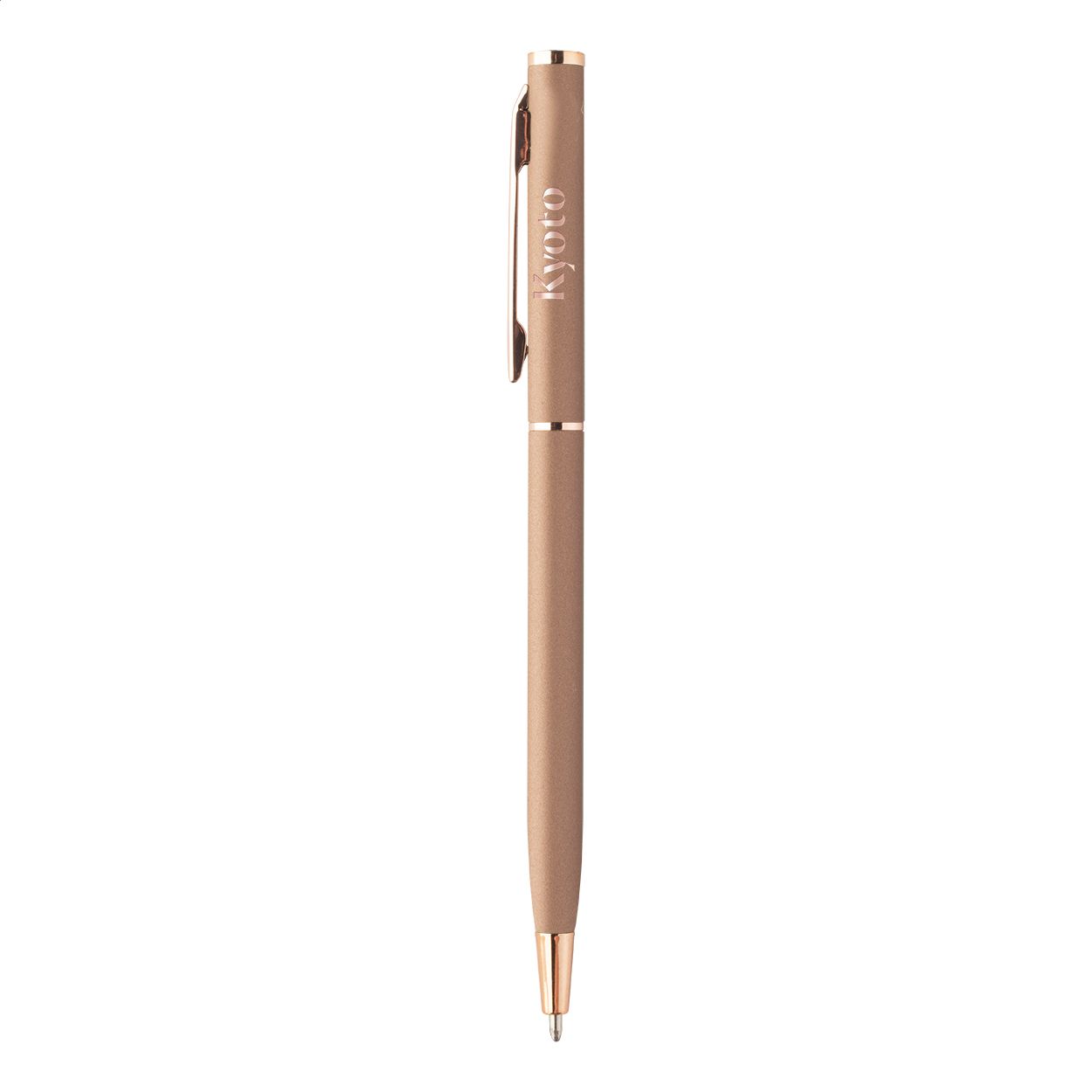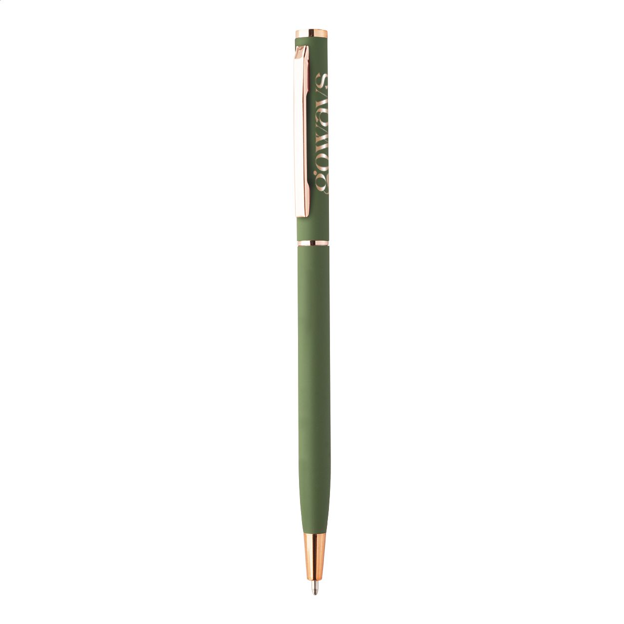 Penna a sfera in alluminio riciclato con meccanismo a rotazione, dettagli in color oro rosa, refill blu e rivestimento gommato speciale per incisione laser a specchio in colore oro rosa.