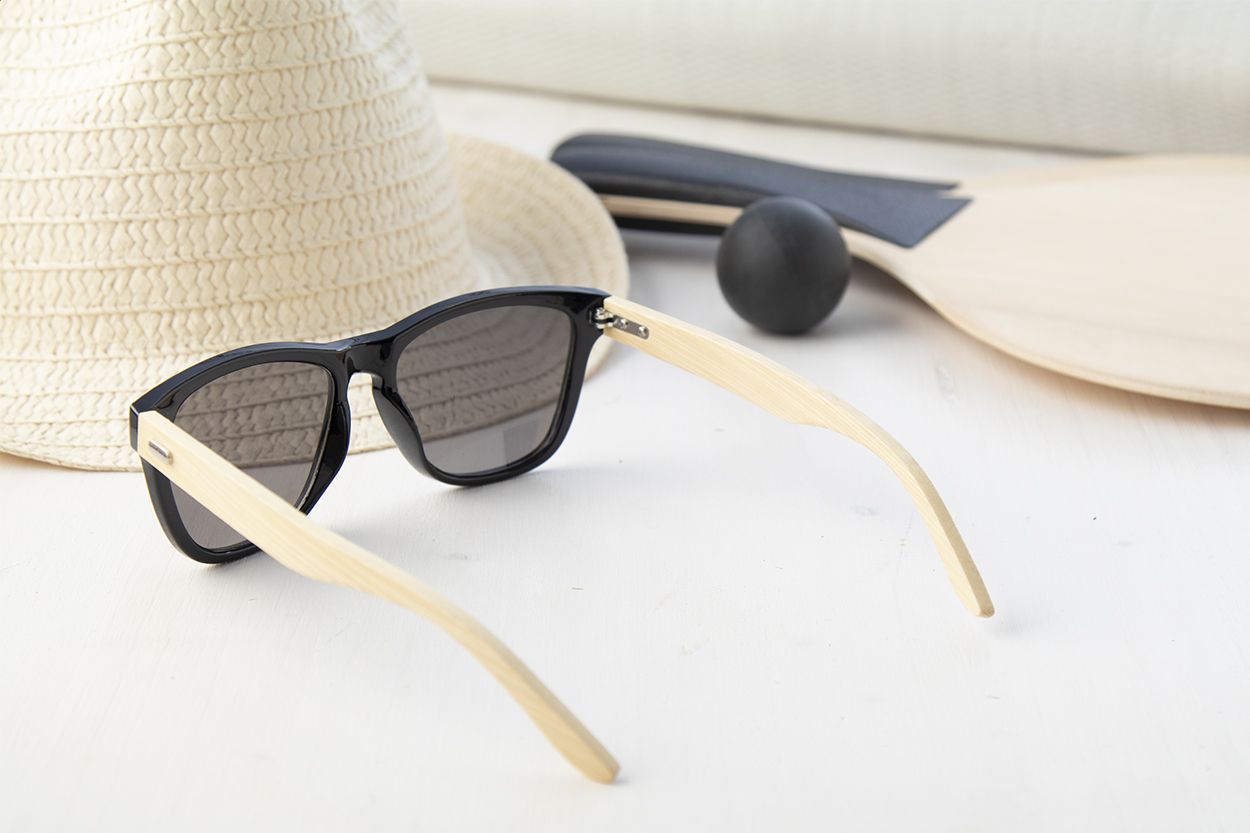 Occhiali da sole in plastica con aste in bambù e lenti a specchio. Con protezione UV 400.
