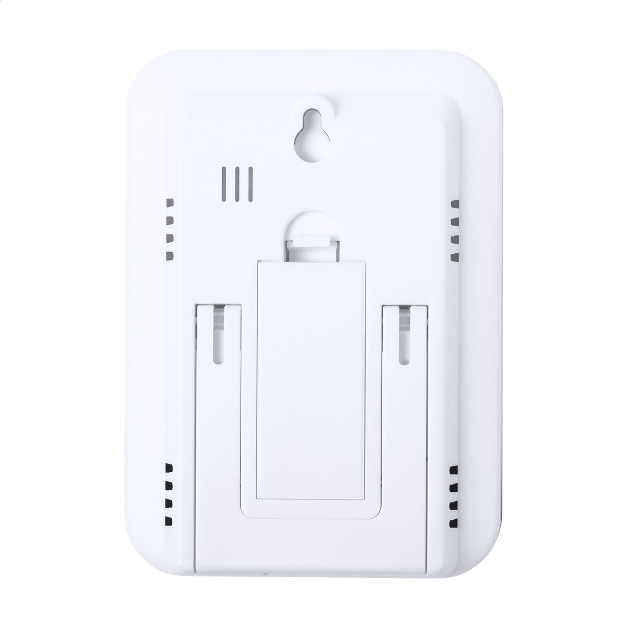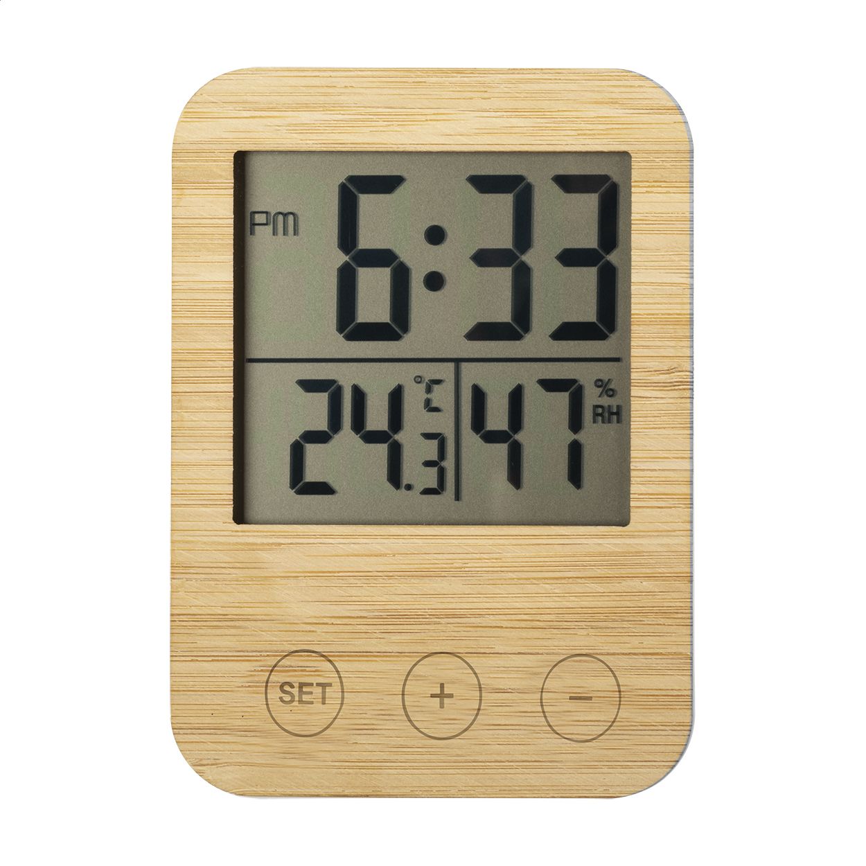 Orologio digitale in bambù e stazione meteo con display temperatura ed umidità. Funziona con 2 batterie AAA non fornite.