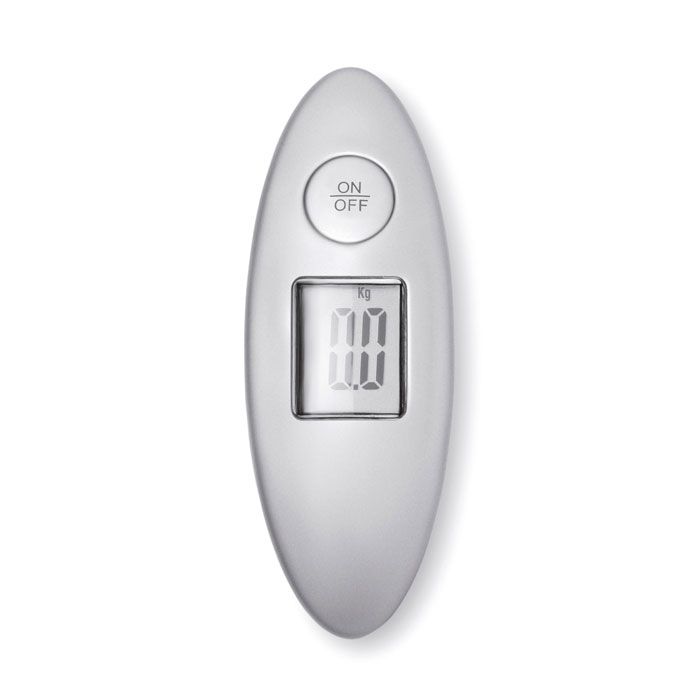 Pesa valigie in ABS.Massima capacità di carico 40 kg.Unità di misura in kg. e libbre. Alimentazione con una batteria a bottone inclusa. Confezione individuale con scatola di cartone silver.
