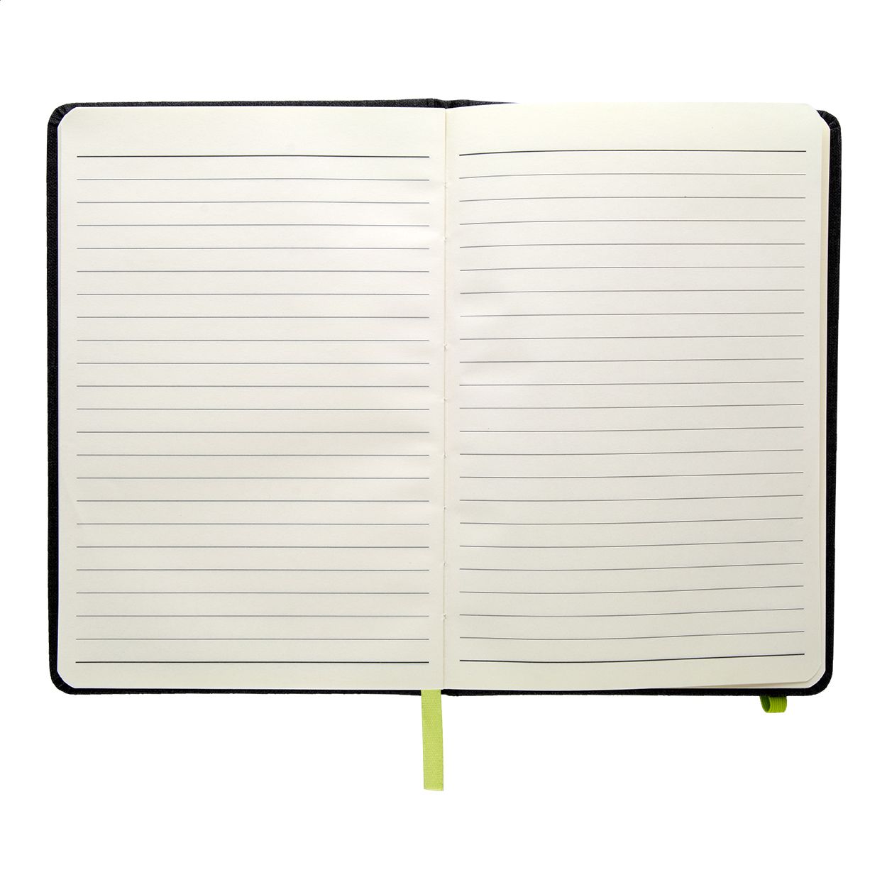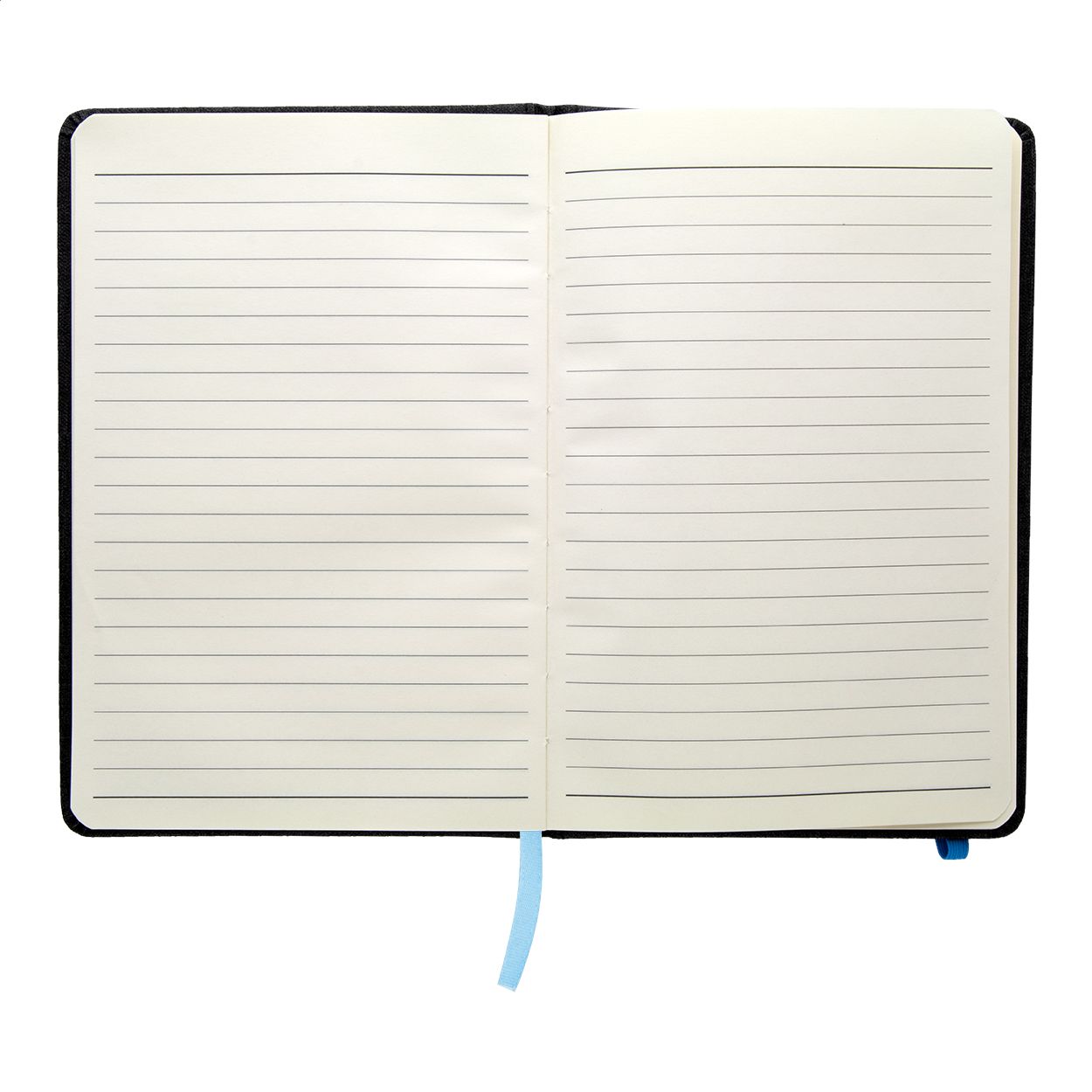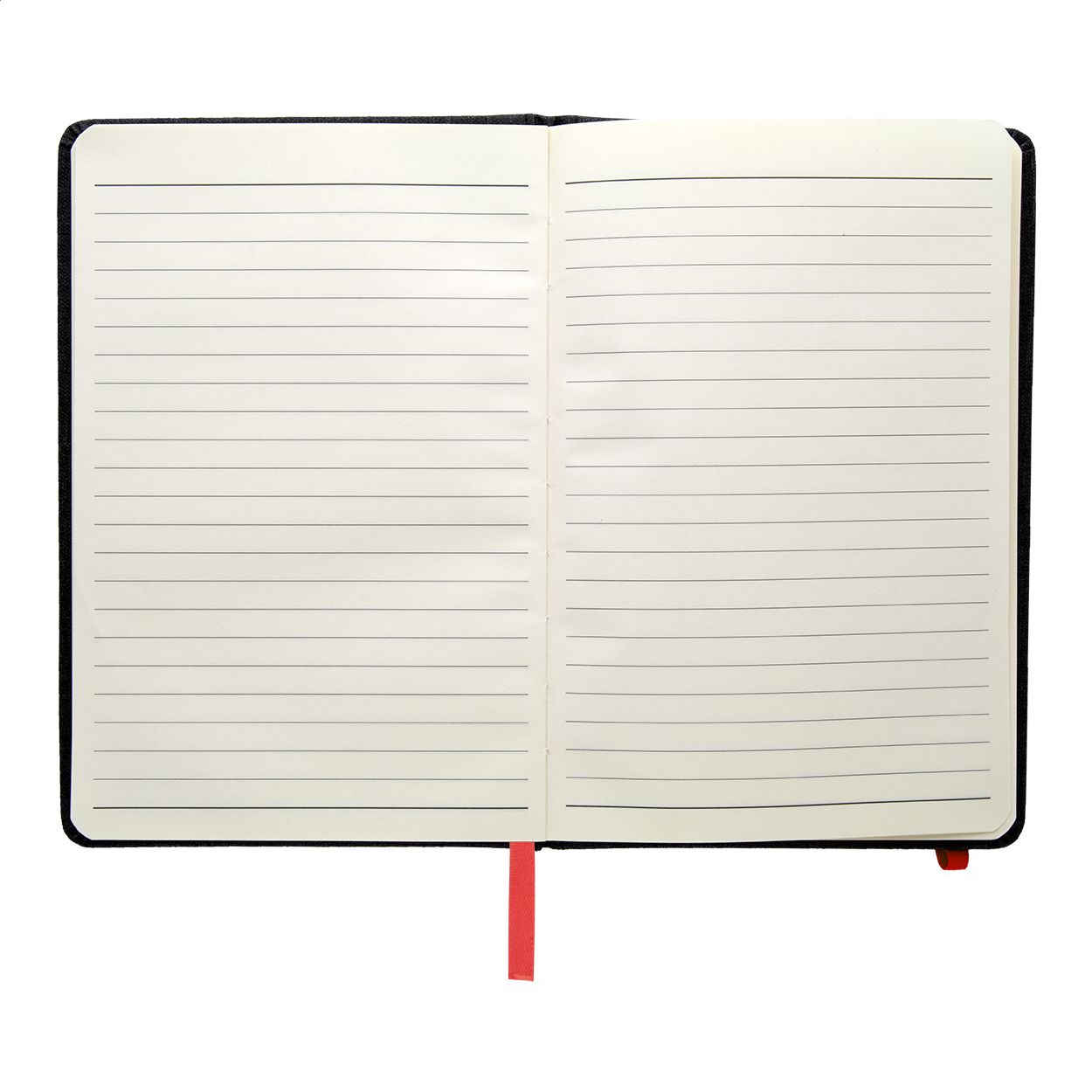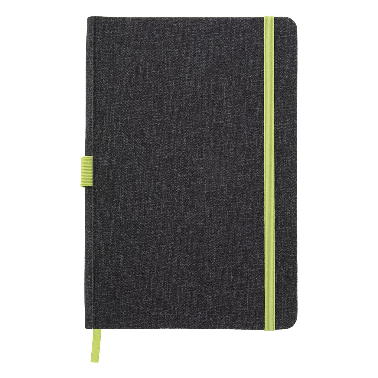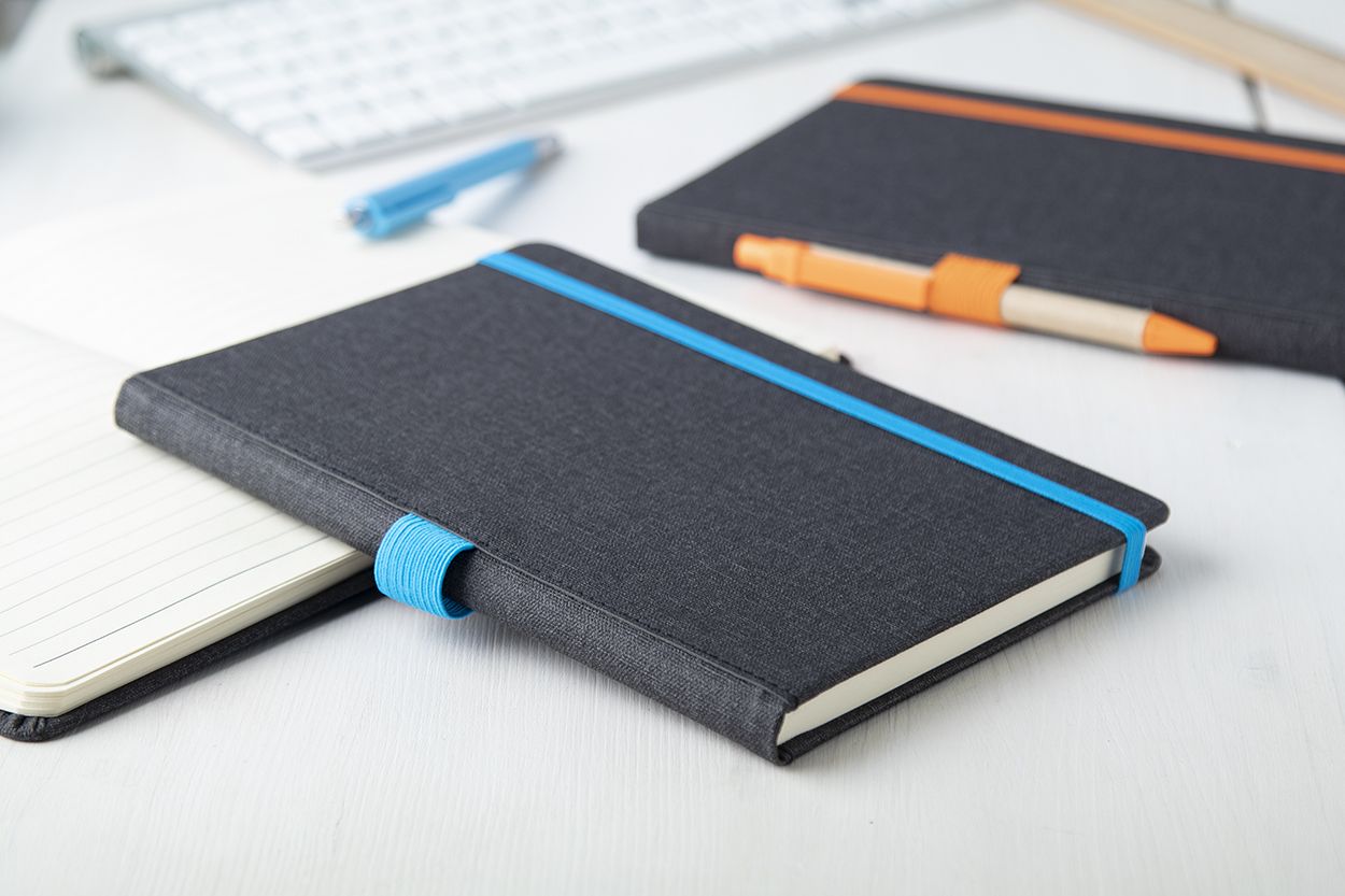 Quaderno con copertina in pelle PU testurizzata, segnalibro, elastico e portapenne in colore coordinato. 96 fogli a righe, formato A5.
