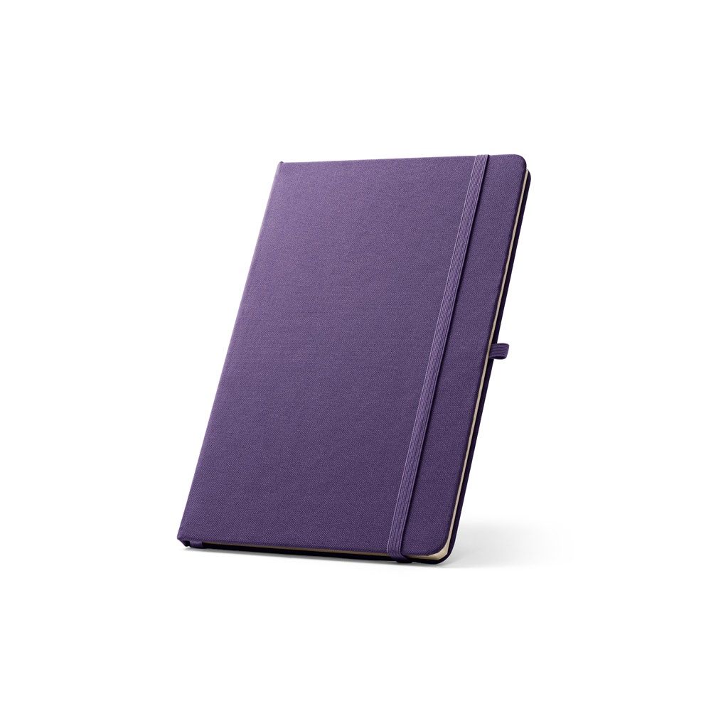 Block notes A5, con copertina rigida in poliestere riciclato (100% rPET) 300D e angoli arrotondati. Al suo interno 160 pagine a righe in carta color avorio 100% riciclata (70 g/m²), nastro separatore, porta penna a sfera (non inclusa) ed elastico. Nella parte inferiore del dorso, è stampato in bianco il simbolo rPET. 143 x 211 mm