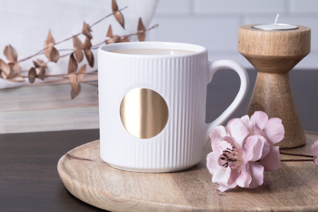 Tazza in ceramica di alta qualità con piastra in ottone che permette l'incisione del logo. Con finitura esterna opaca e interna lucida. 330 ml. Confezione in scatola di cartoncino bianco.