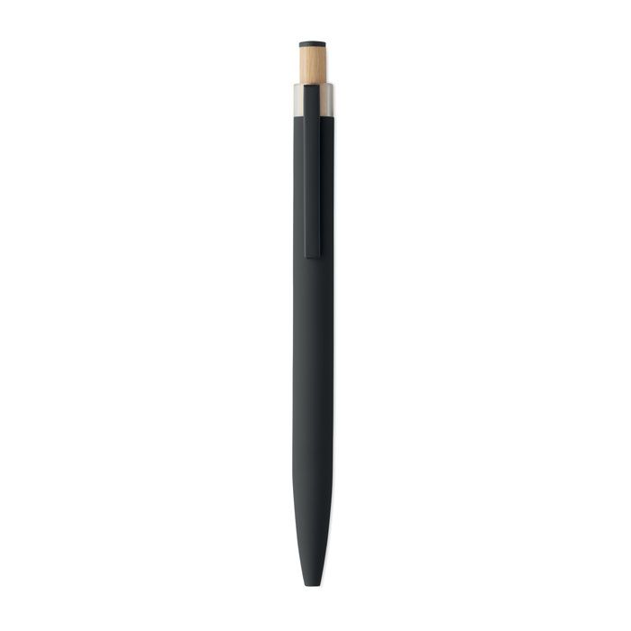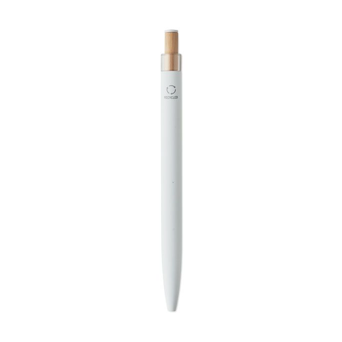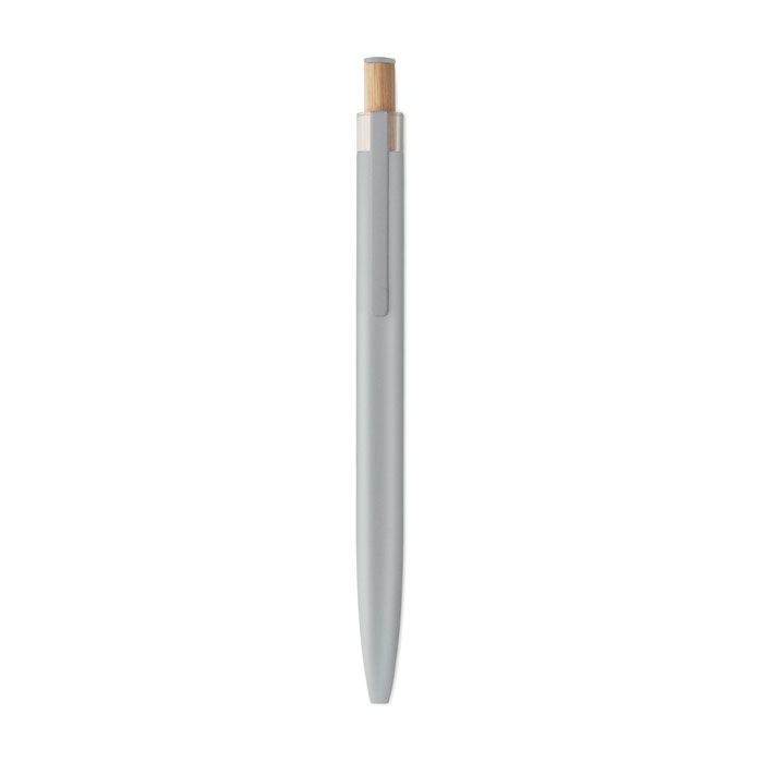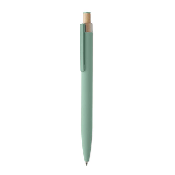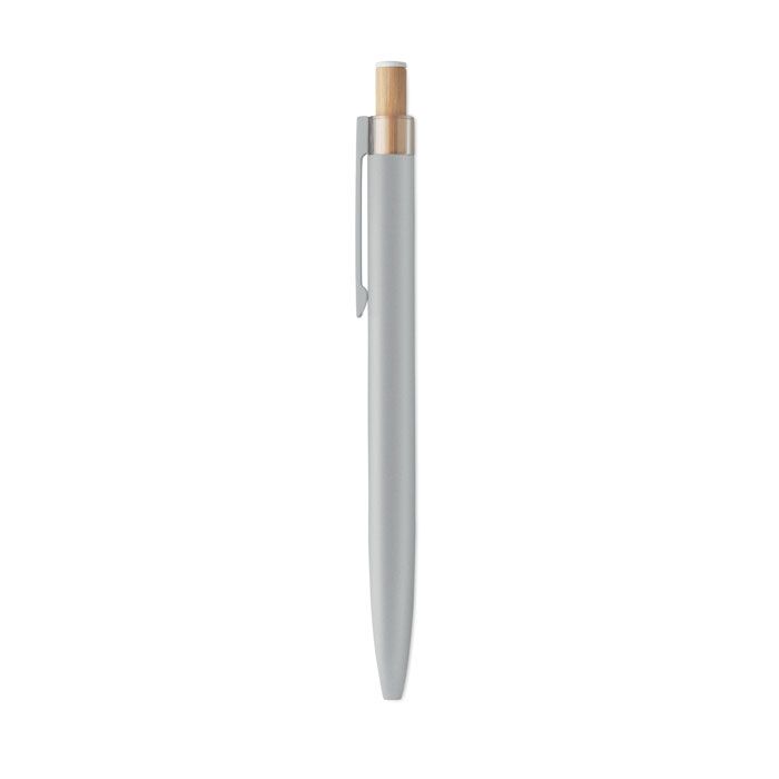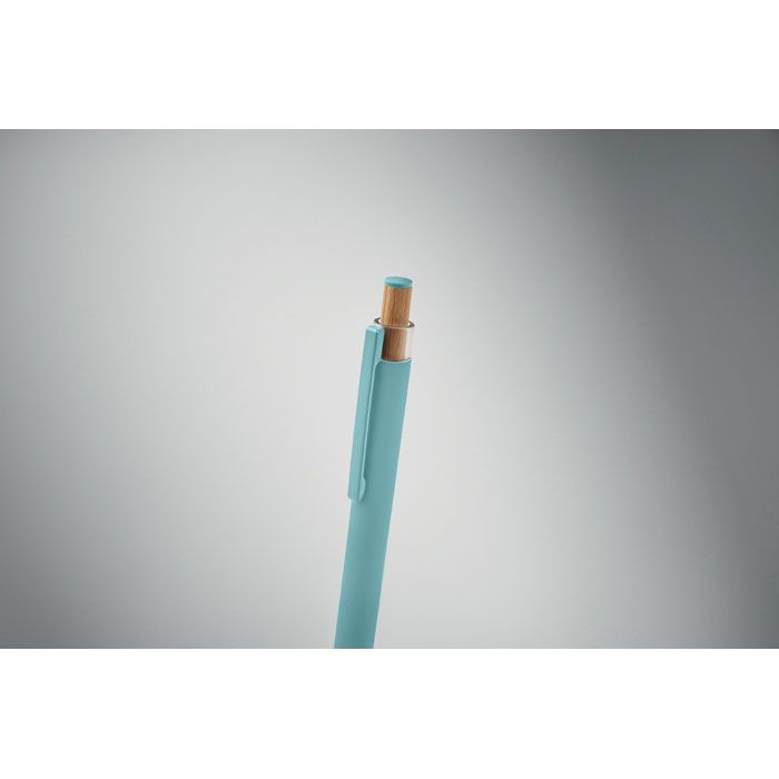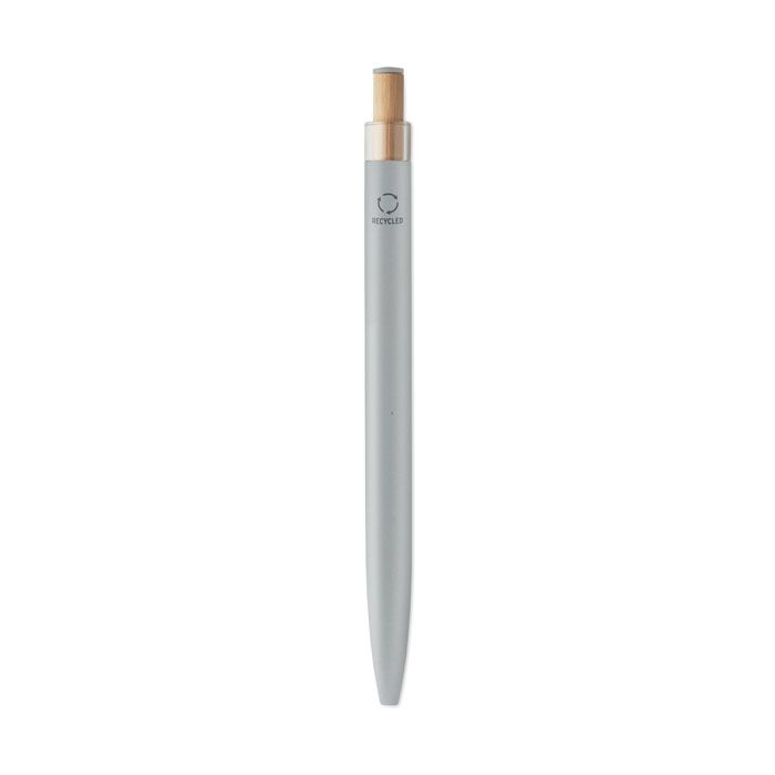 Penna a sfera in alluminio riciclato con pulsante in bambù con dettagli in tinta e clip in metallo abbinata. Inchiostro blu.
