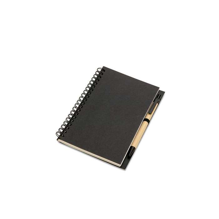 Notebook in carta riciclata con penna. Doppia spirale. 140 pagine di carta riciclata normale (70 fogli). Penna a sfera a pulsante in cartone riciclato e plastica biodegradabile. Inchiostro blu. Portapenne elastico nero. FSC MIX CREDIT | P7.1 | FSC-C213206