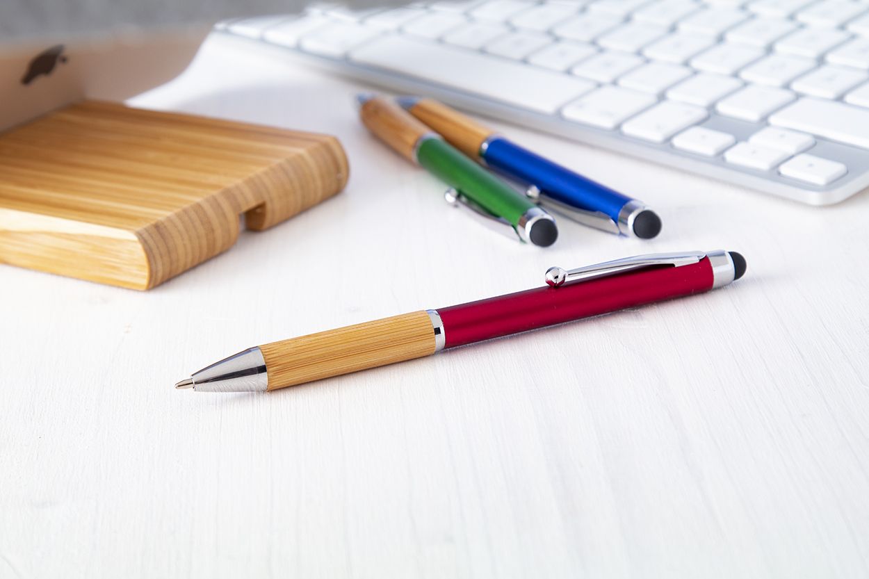 Penna a sfera capacitiva in plastica con meccanismo a rotazione, impugnatura in bambù, fusto con finitura metallica e parti cromate lucide. Con refill blu.