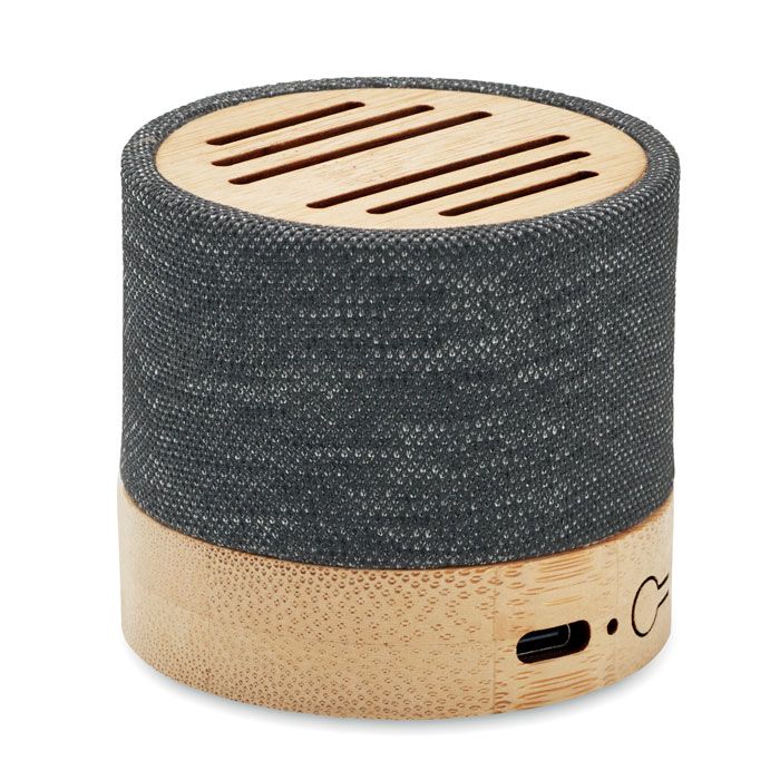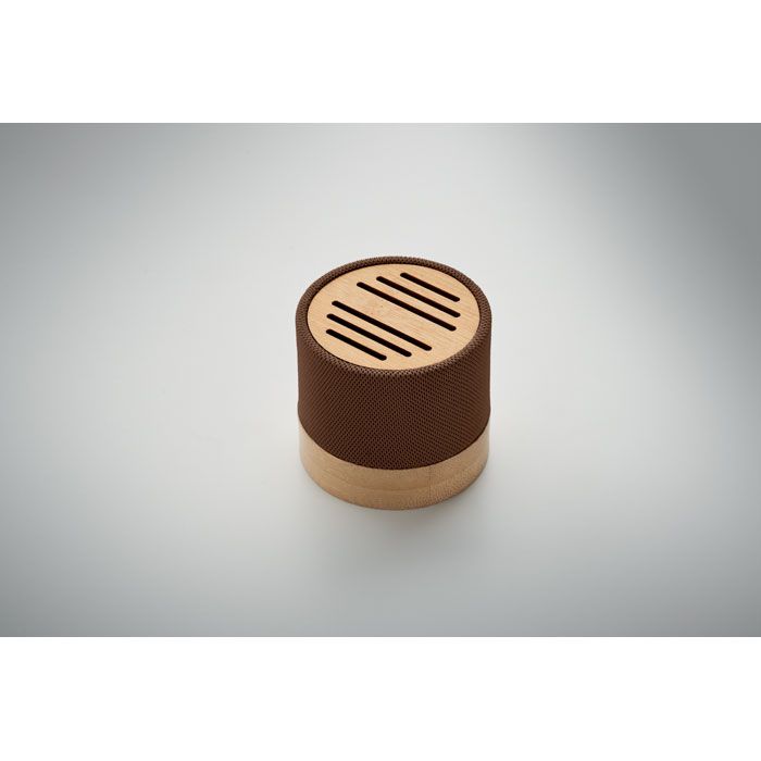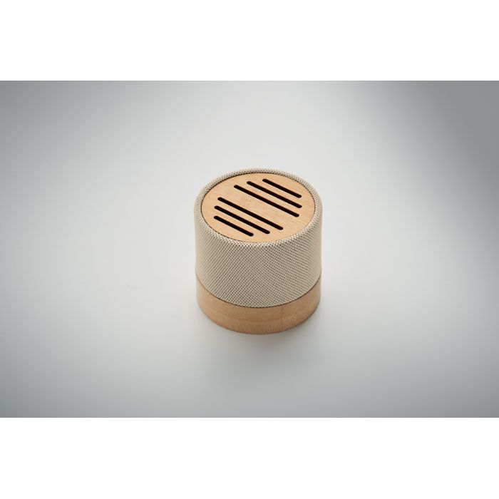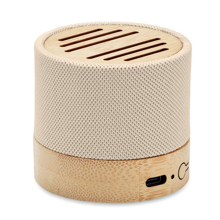 Speaker wireless 5.0 con involucro in RPET e dettaglio in bamboo sulla parte superiore. Con luce LED. 1 batteria ricaricabile Li-ION 300 mAh inclusa. Include una porta per schede SD e un cavo AUX/USB. Dati di uscita: 3W, 3 Ohm e 5V. Tempo di riproduzione di circa 3 ore.