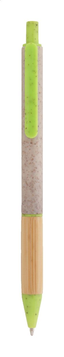 Penna a sfera in plastica ecologica di paglia di grano con impugnatura in bambù e parti in metallo. Con refill blu.
