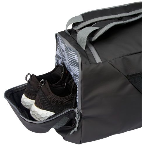 Borsone 2 in 1 impermeabile realizzato con materiali riciclati certificati GRS, comprese le cerniere. Presenta uno spazioso scomparto principale con apertura a forma di U per riporre e accedere facilmente agli oggetti, due tasche laterali con zip (compreso uno scomparto per le scarpe), una tasca anteriore con zip, una tasca in rete per la borraccia sul retro e un bordino catarifrangente per una maggiore visibilità. Questo borsone può essere trasportato in 3 modi diversi: A mano, a tracolla oppure come uno zaino grazie agli spallacci imbottiti regolabili. I materiali riciclati certificati GRS includono il tessuto principale, la fodera, la cinghia e le cerniere. Capacità: 35 litri. Senza PVC.