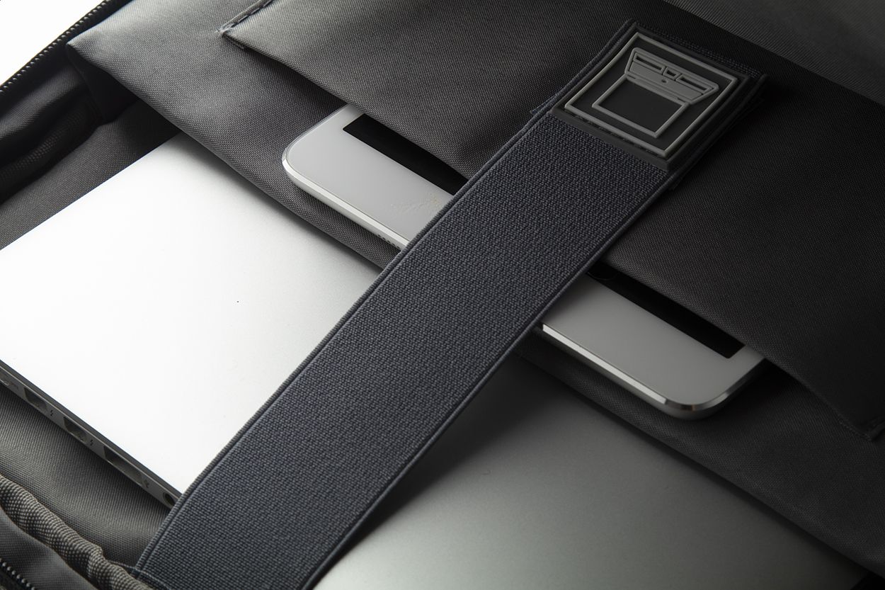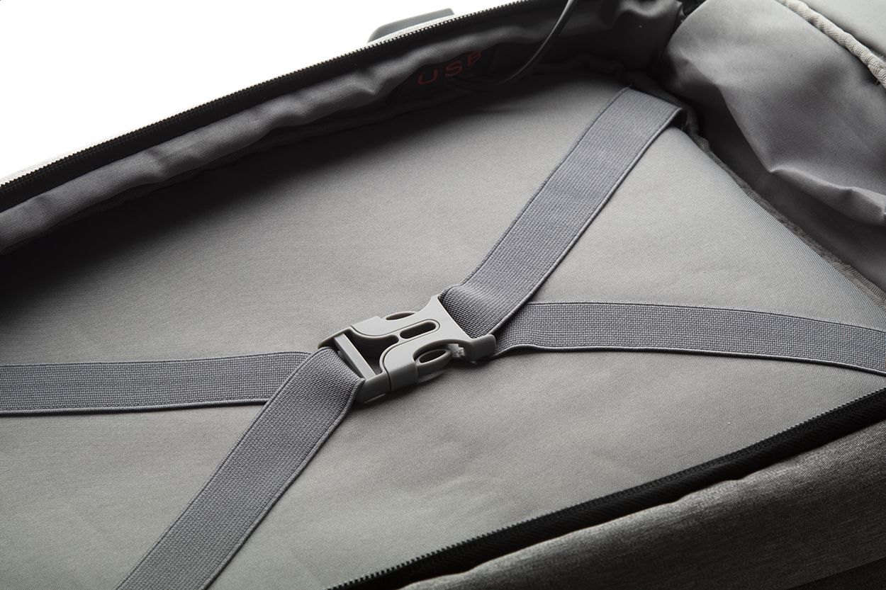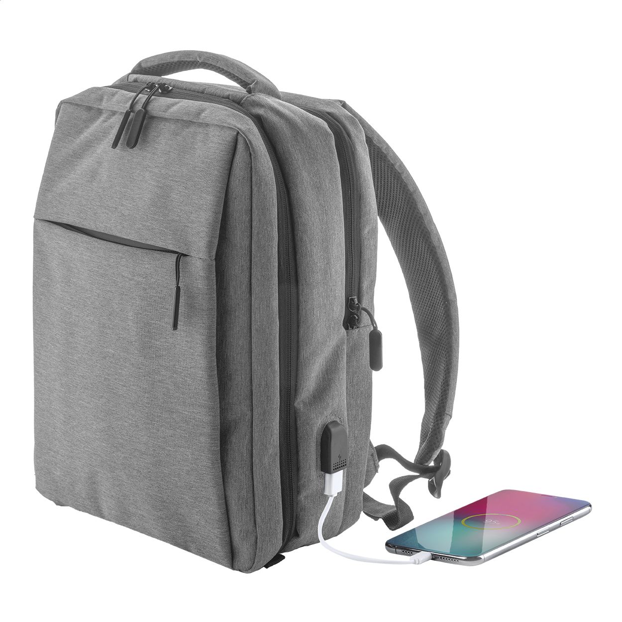 Zaino con scomparti multipli e zip, tasche interne per organizer, scomparti imbottiti per laptop (15") e tablet, schienale e spallacci ergonomici. Con cinghia per trolley e connessione USB integrata per power bank. Poliestere 400D.