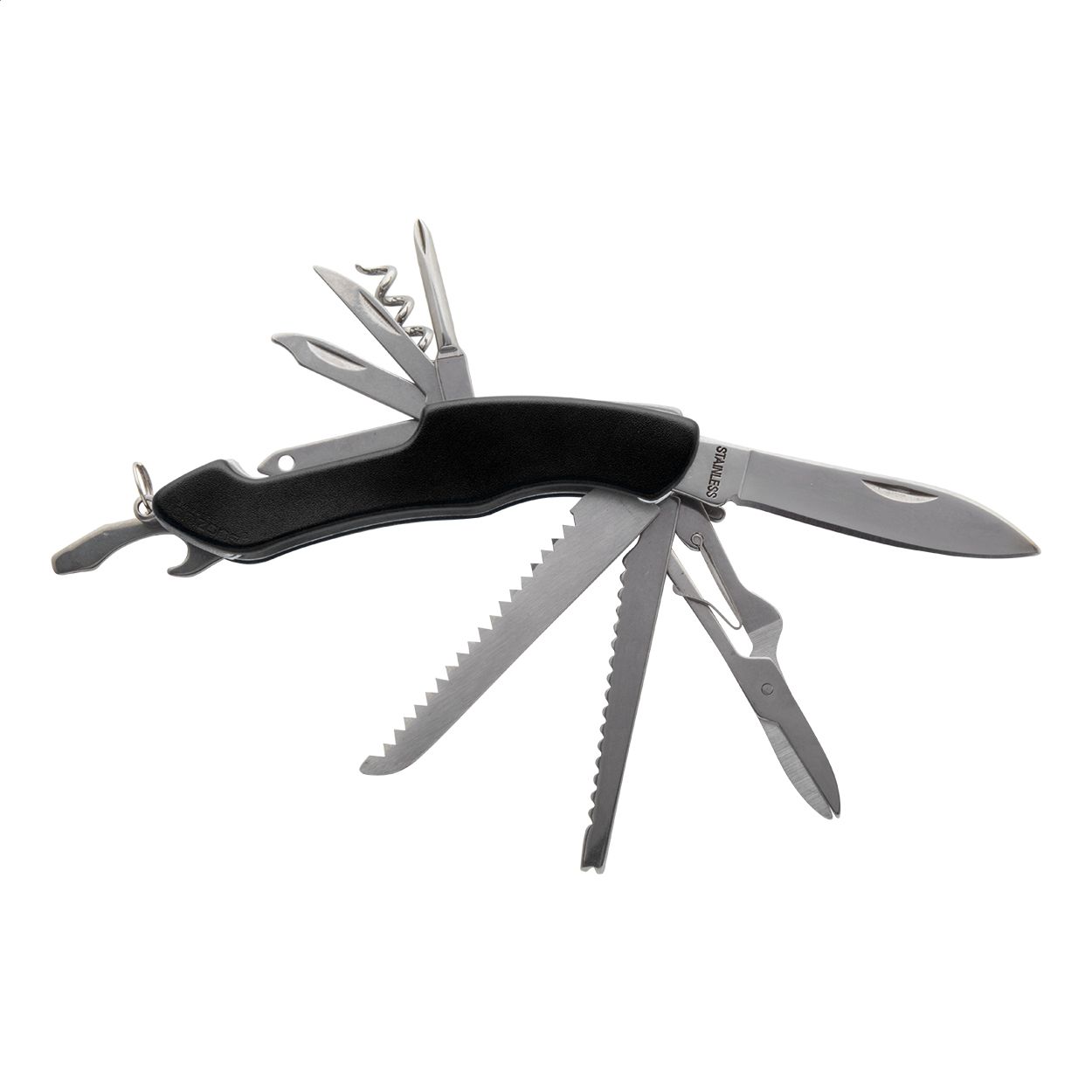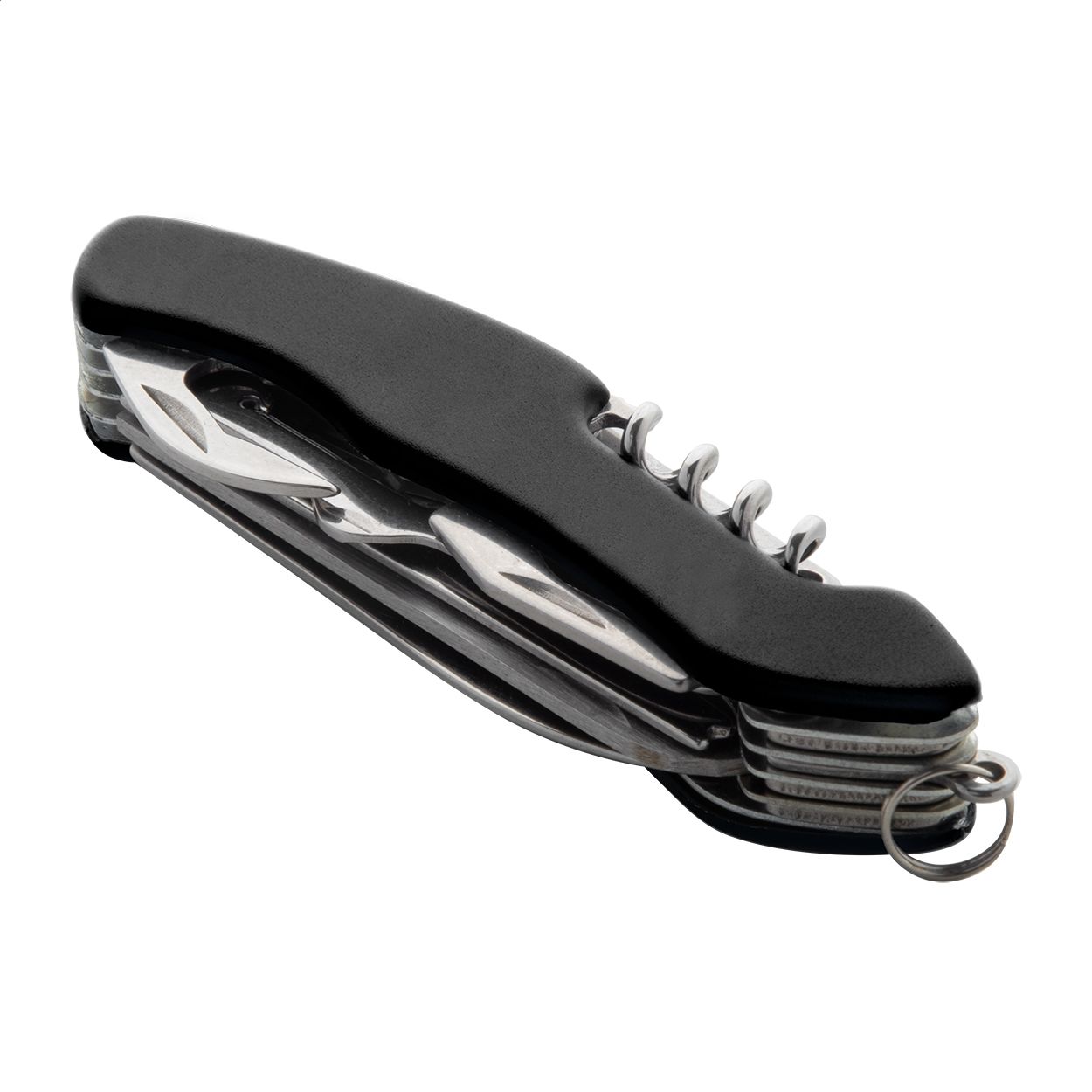Coltello tascabile in acciaio inossidabile con 12 funzioni e manico in alluminio.