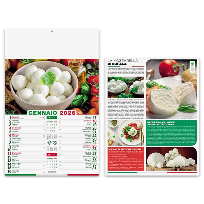 Illustrato mensile 12 fogli; carta patinata 70gr; testata termosaldata; festività internazionali; retro in quadricromia;