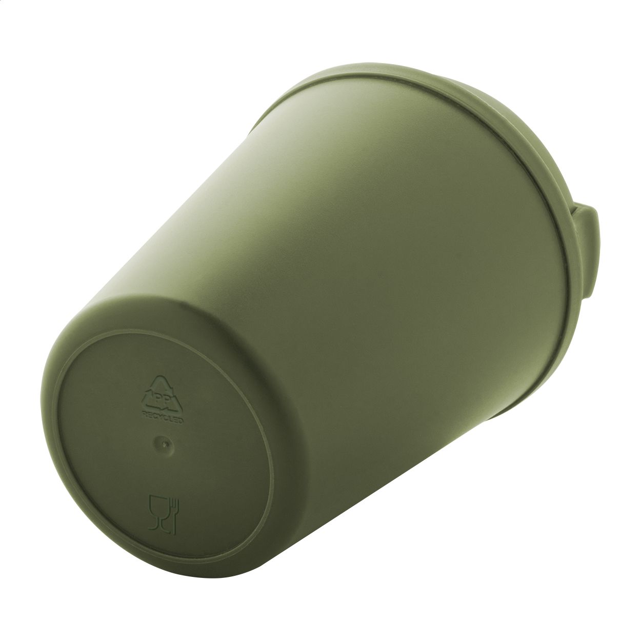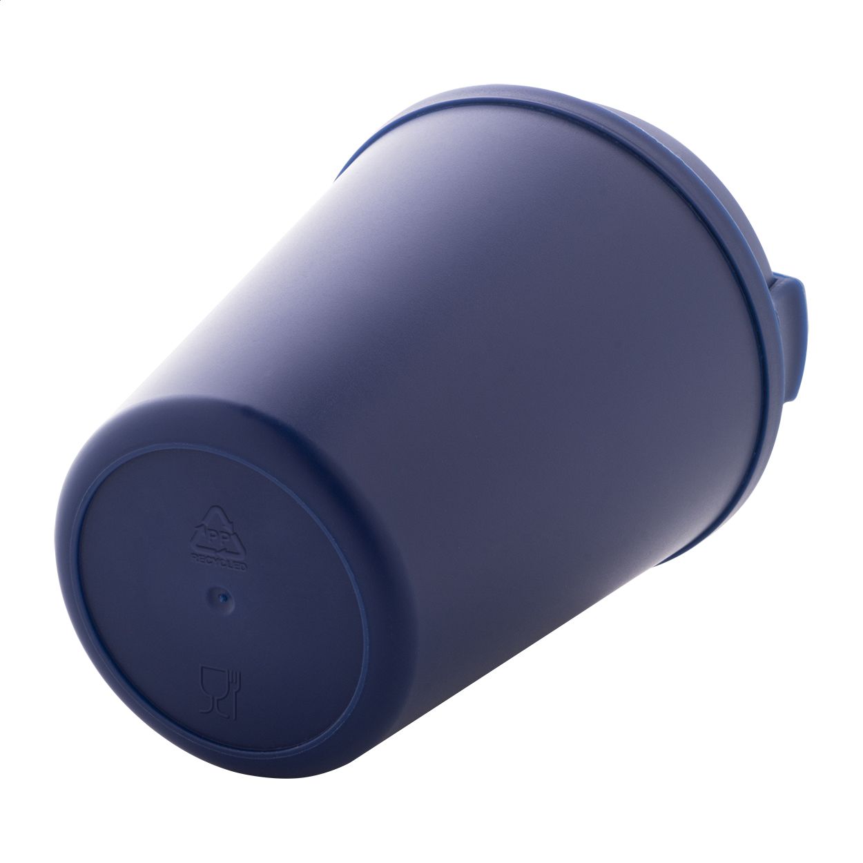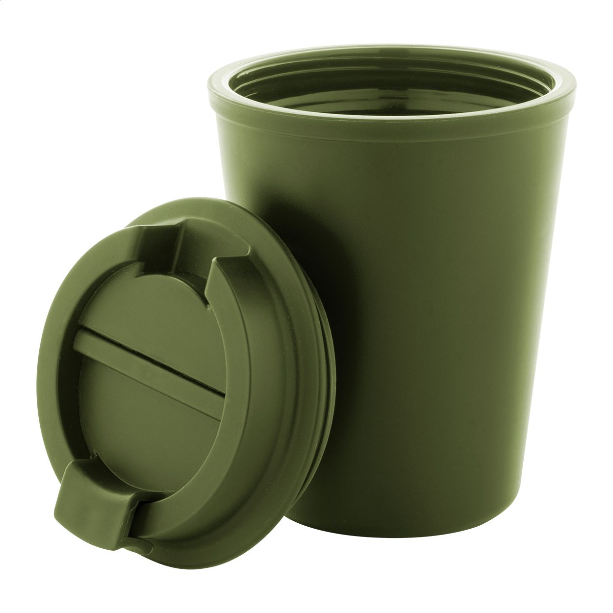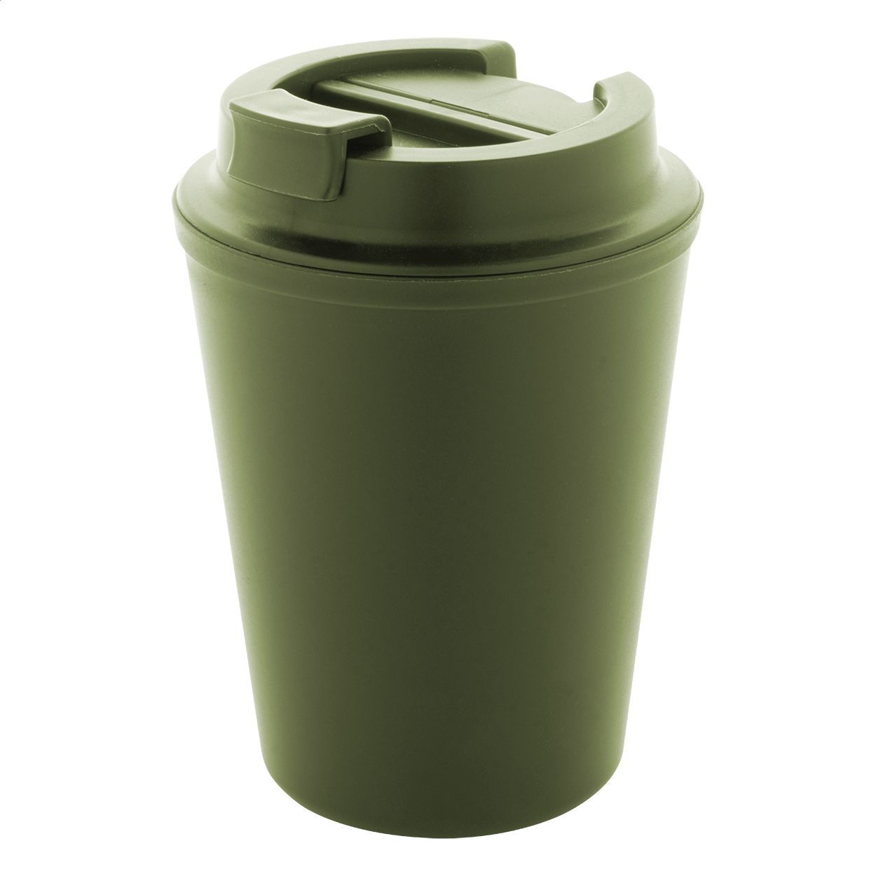 Bicchiere termico da 300 ml. in plastica PP riciclata a doppia parete, con coperchio erogatore.