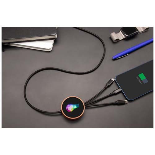 Cavo di ricarica 5 in 1 in PET riciclato con logo luminoso e stazione di ricarica in bambù da 10 W. Dispone di 3 connettori (tipo C, micro USB, iPhone) e di un connettore USB doppio per uso universale. Fornito in un astuccio in TPU, con un biglietto in carta kraft. Lunghezza del cavo: 1 metro. Garanzia di 3 anni inclusa.