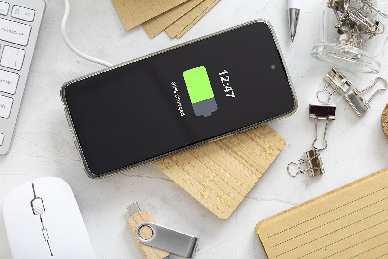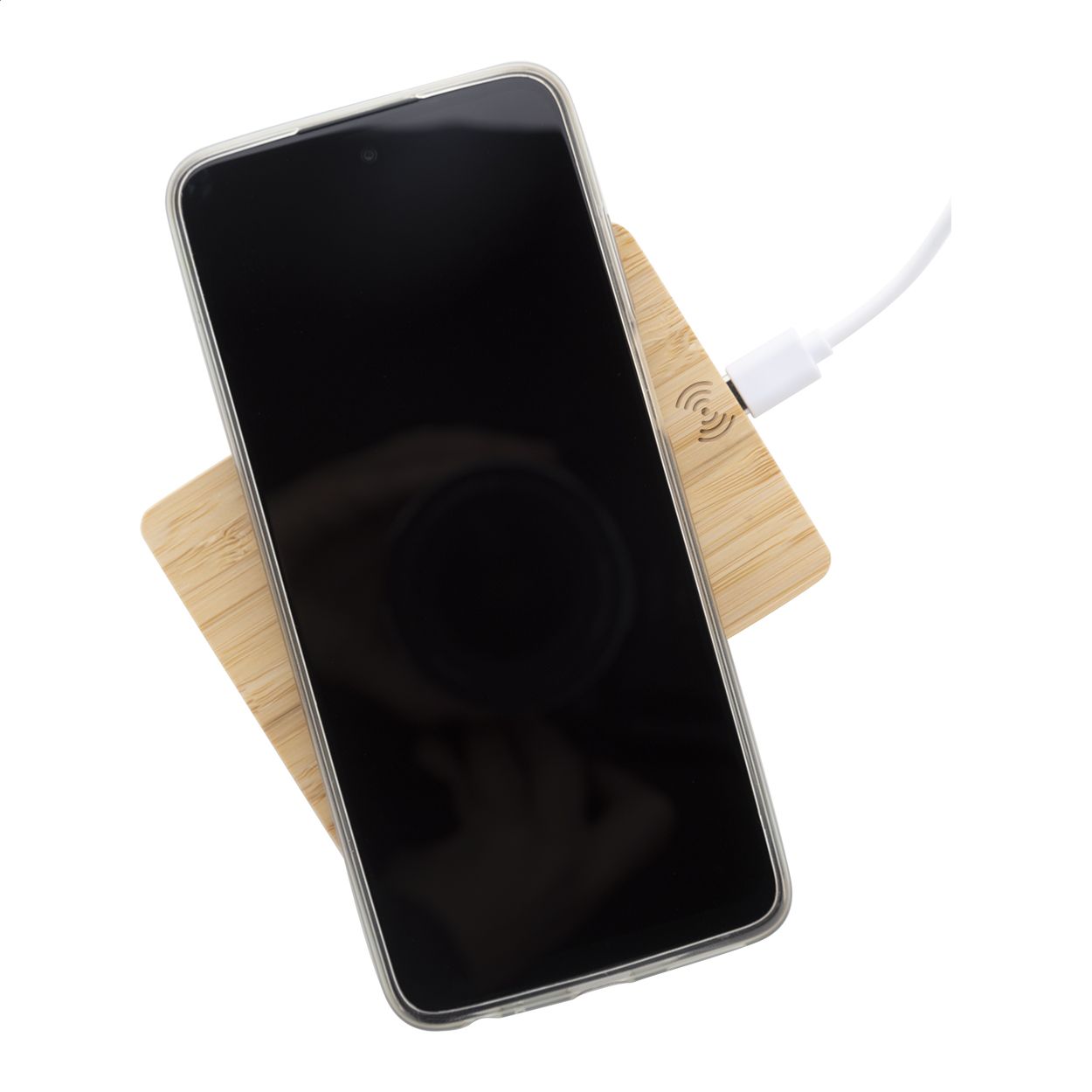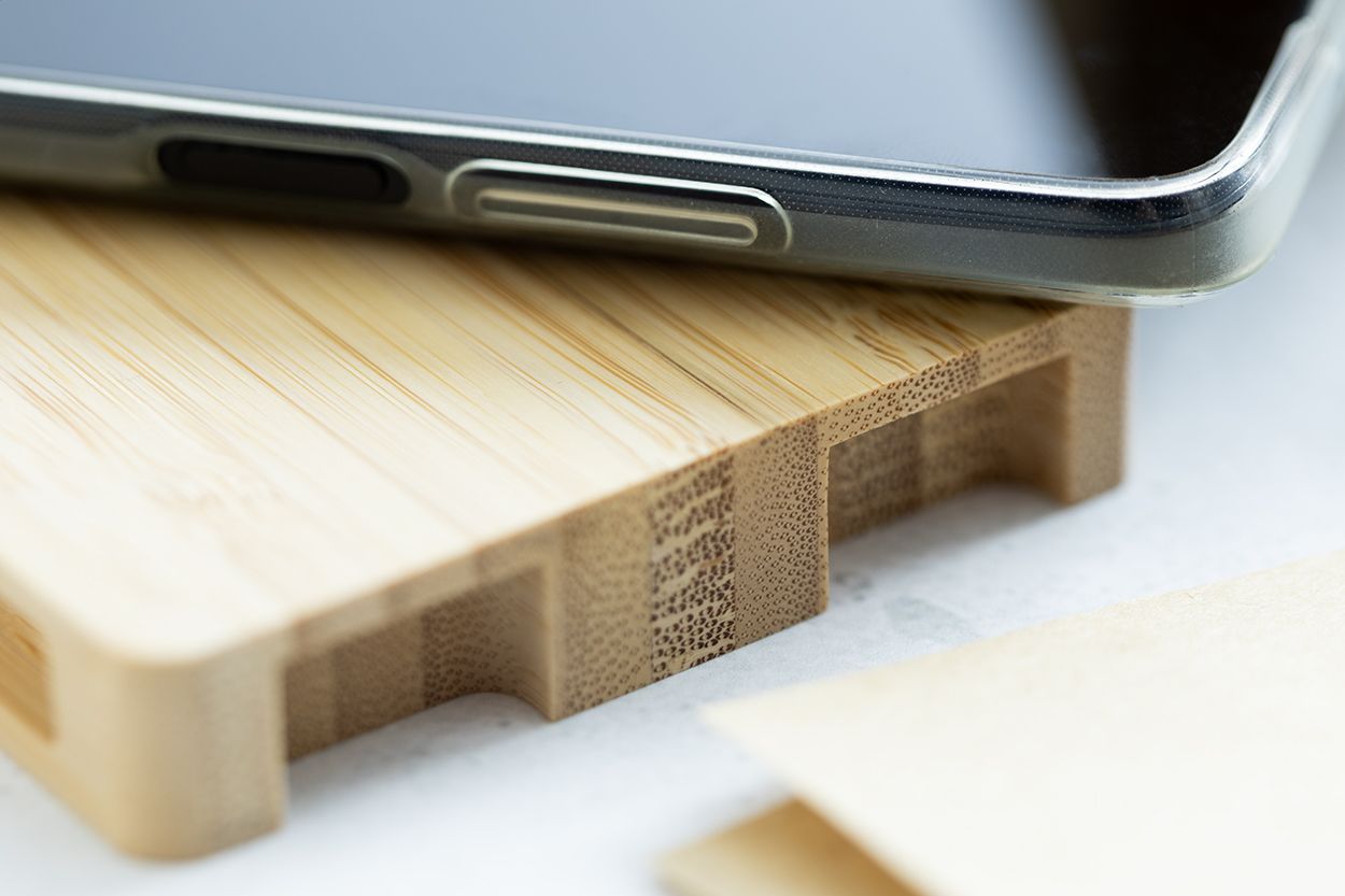 Caricatore rapido wireless (10W) in bambù a forma di pallet. Cavo di ricarica USB incluso.