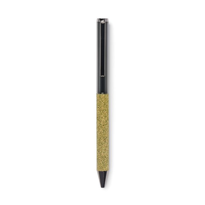 Penna a sfera in metallo con fusto in tessuto composto per il 20% da fondi di tè, per il 30% da sughero e per il 50% da tessuto di policotone TC, in confezione di cartone. Inchiostro blu.